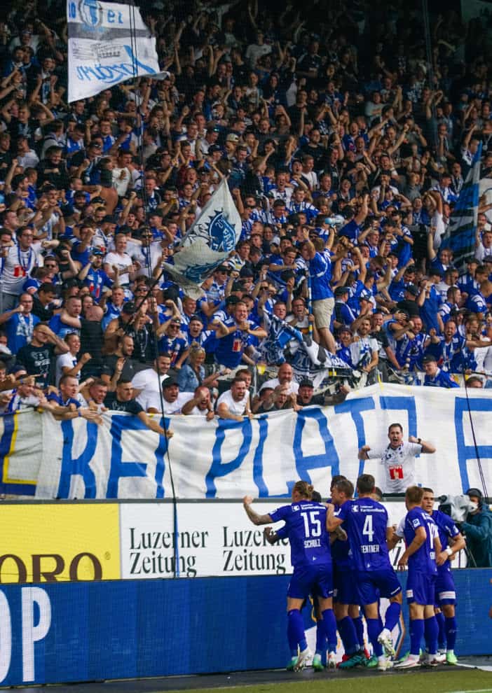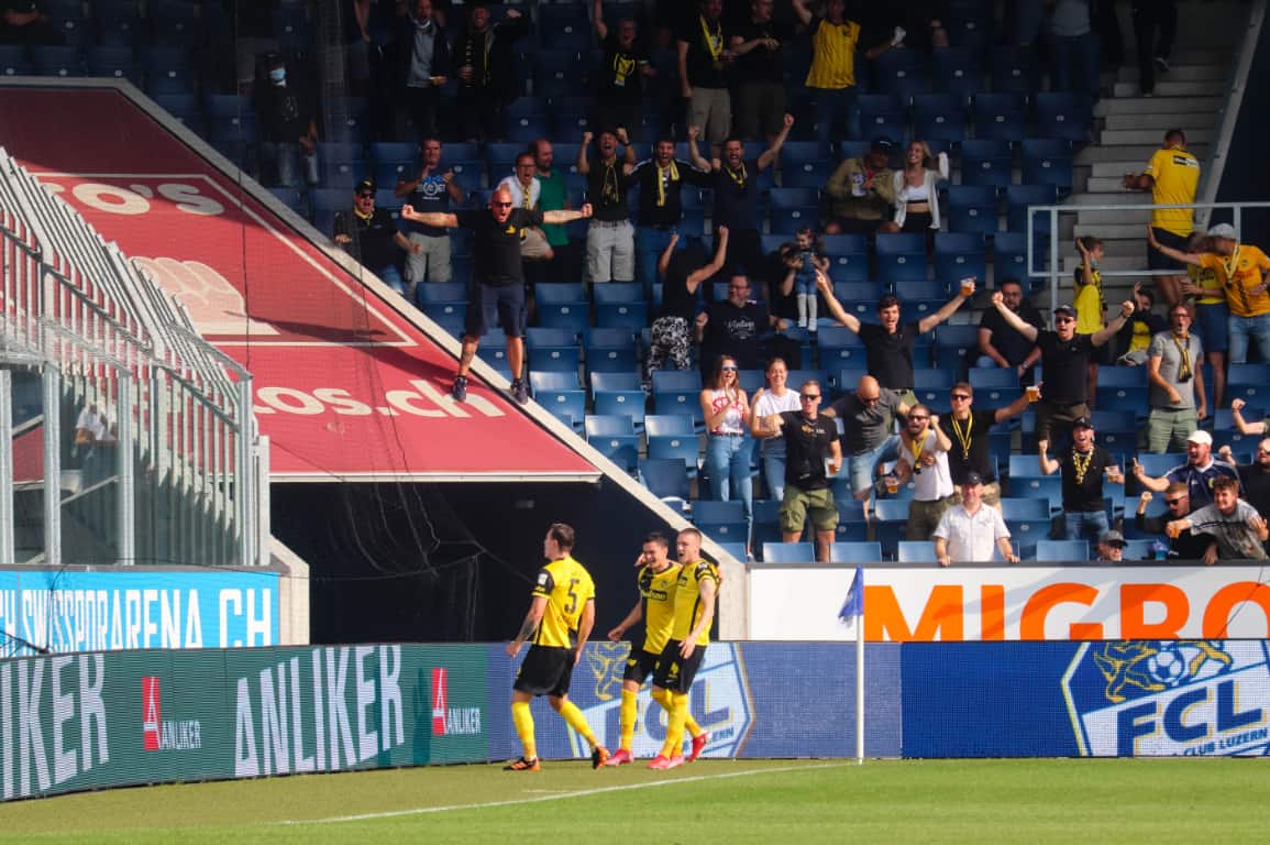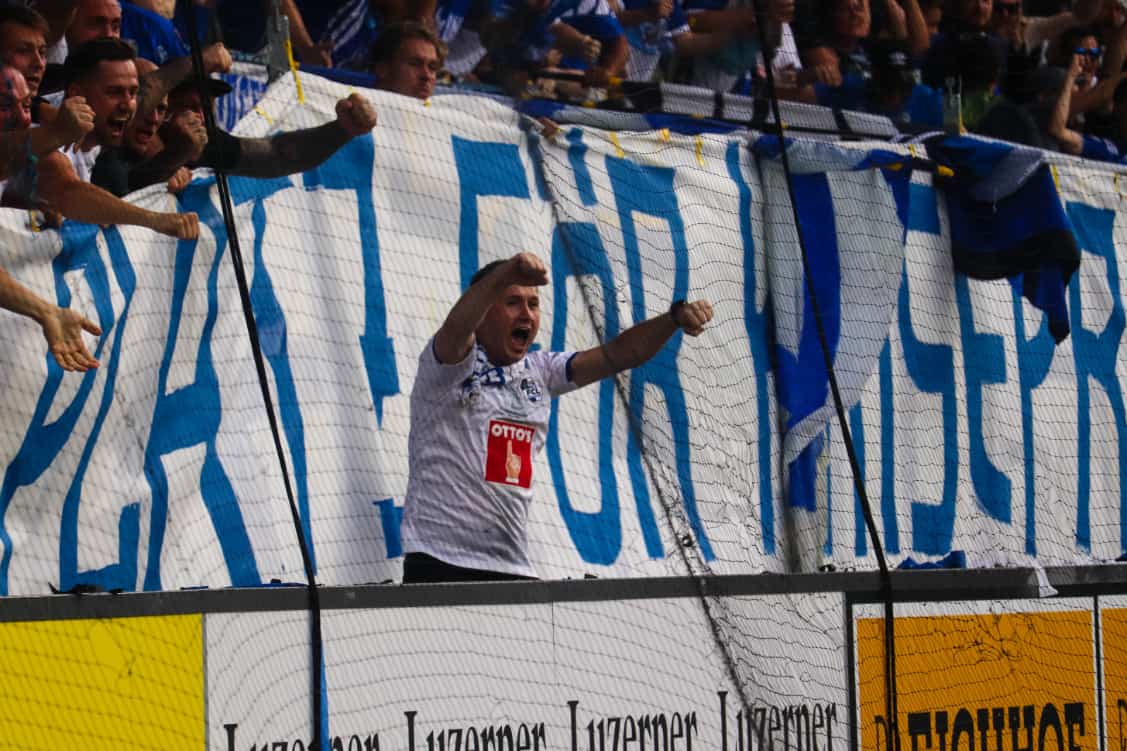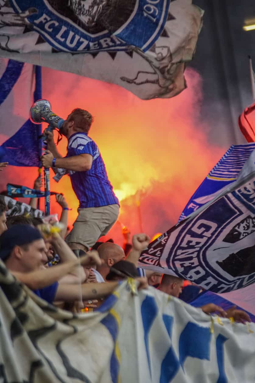 Al vroeg in de wedstrijd komt Young Boys, vorig jaar nog met straatlengte voorsprong kampioen geworden, op een 0-1 voorsprong. Het maakt het enthousiasme des te groter wanneer Luzern weet terug te komen in de wedstrijd. De 1-1 gelijkmaker leidt tot een fantastisch schouwspel vol passie en emotie. Terwijl de bierdouche over de tribune neerdaalt, vallen supporters elkaar in de armen. Massaal juichen dus! Ook na het doelpunt steken vervolgens meerdere supporters weer fakkels af. Een schitterende rode gloed verlicht de hele tribune.