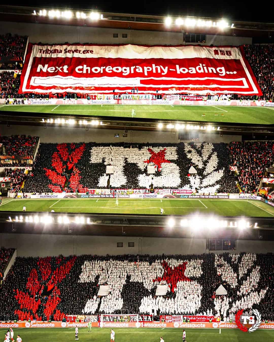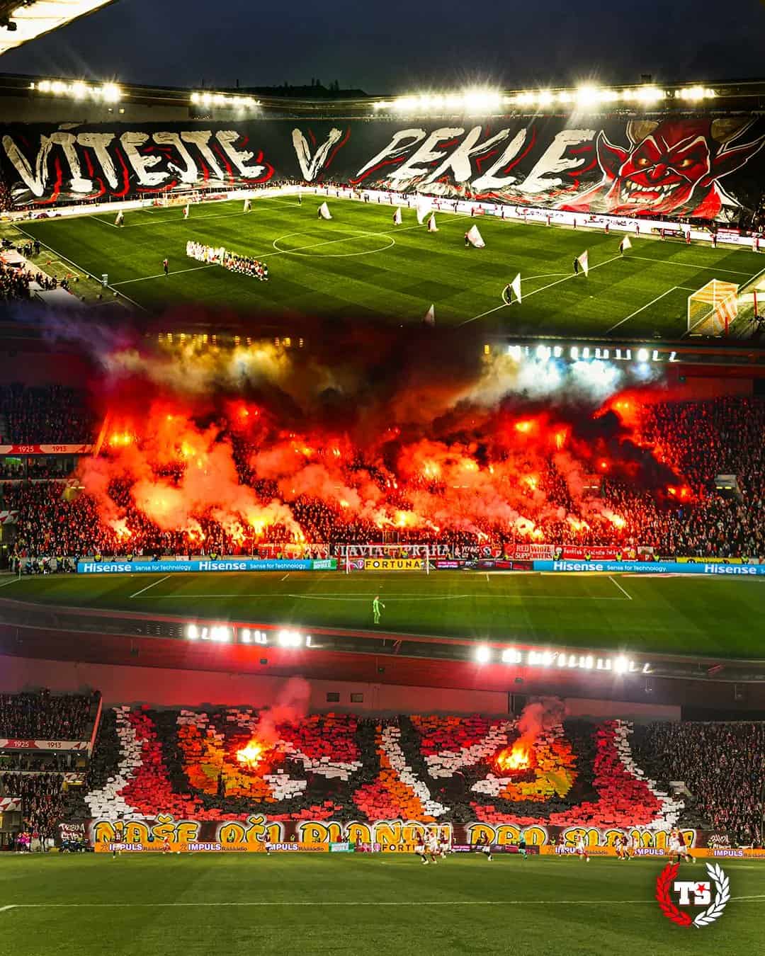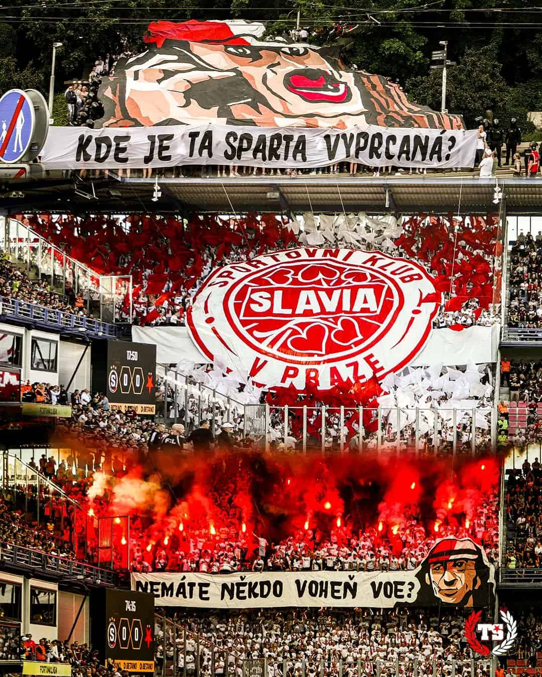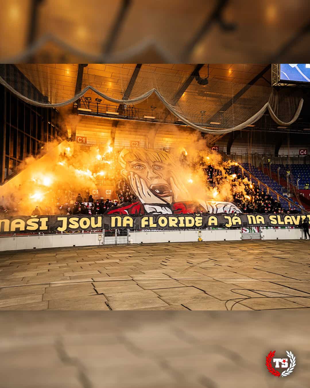 Tegen Banik Ostrava 1,5 week later komt Tribuna Sever met het grootste spandoek in de geschiedenis van het Tsjechische voetbal. Twee zijdes worden volledig bedekt door de “Slavia tegen iedereen” tifo. Ook een pyroshow kan niet ontbreken.