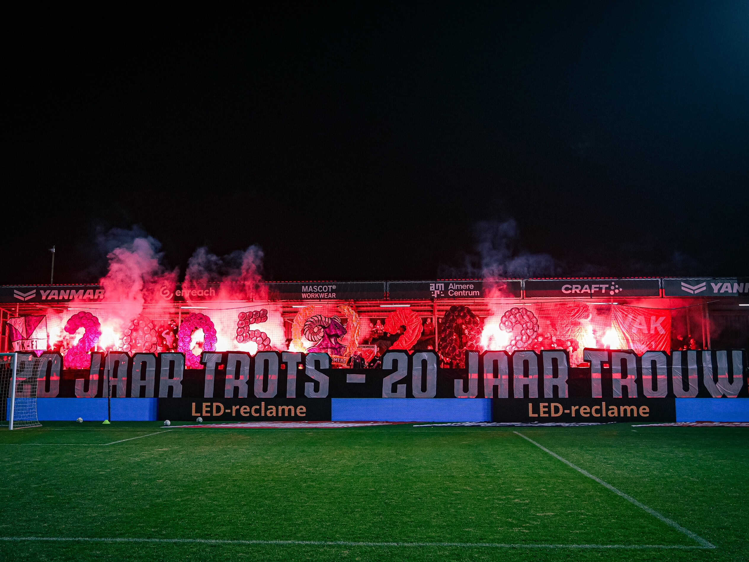 Het is ruim zeven jaar geleden dat ik voor het eerst Almere City bezocht. Bij de streekderby tegen Telstar lieten zij een kleine tifo zien met de skyline en vlag van de stad. Op de tribunes waren duidelijk lege plekken te zien en zelfs Vak D kon gerust tientallen extra supporters herbergen. Hoe anders is het op 20 december 2025, als de tribunes nagenoeg uitverkocht zijn en Vak D (nu aan de andere kant van de korte zijde) uitpuilt. Het is kenmerkend voor Almere City: een club die de afgelopen jaren flink aan de weg heeft getimmerd, zowel voetballend als supporterstechnisch. Het is snel gegaan. Waar in 2005 een groepje pubers de uitdaging aanging, staat daar twintig jaar later een volwaardig groep, met zelfs een jongerenafdeling.