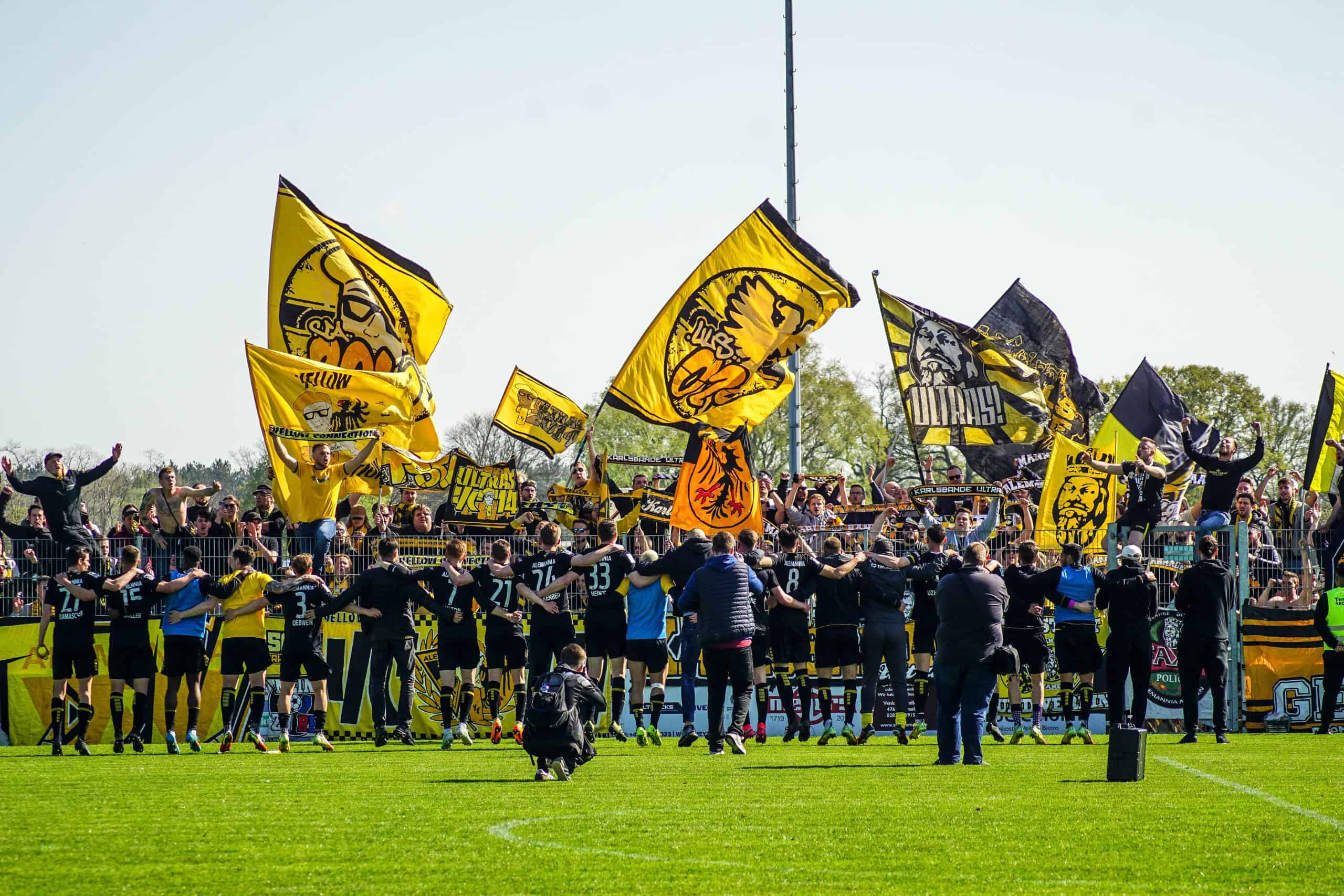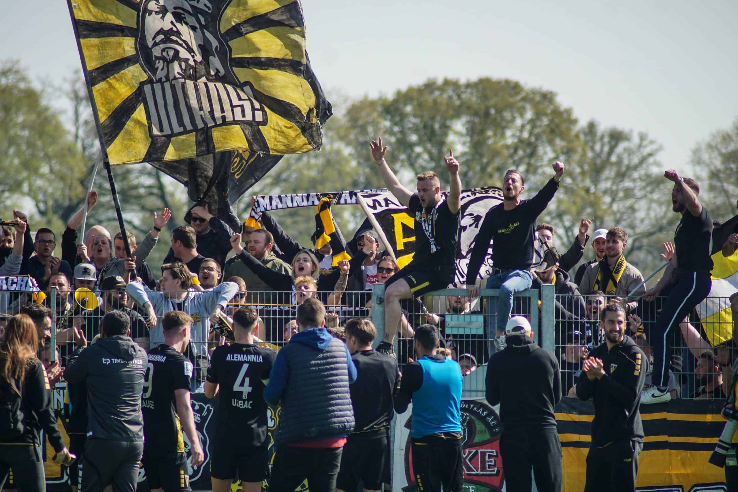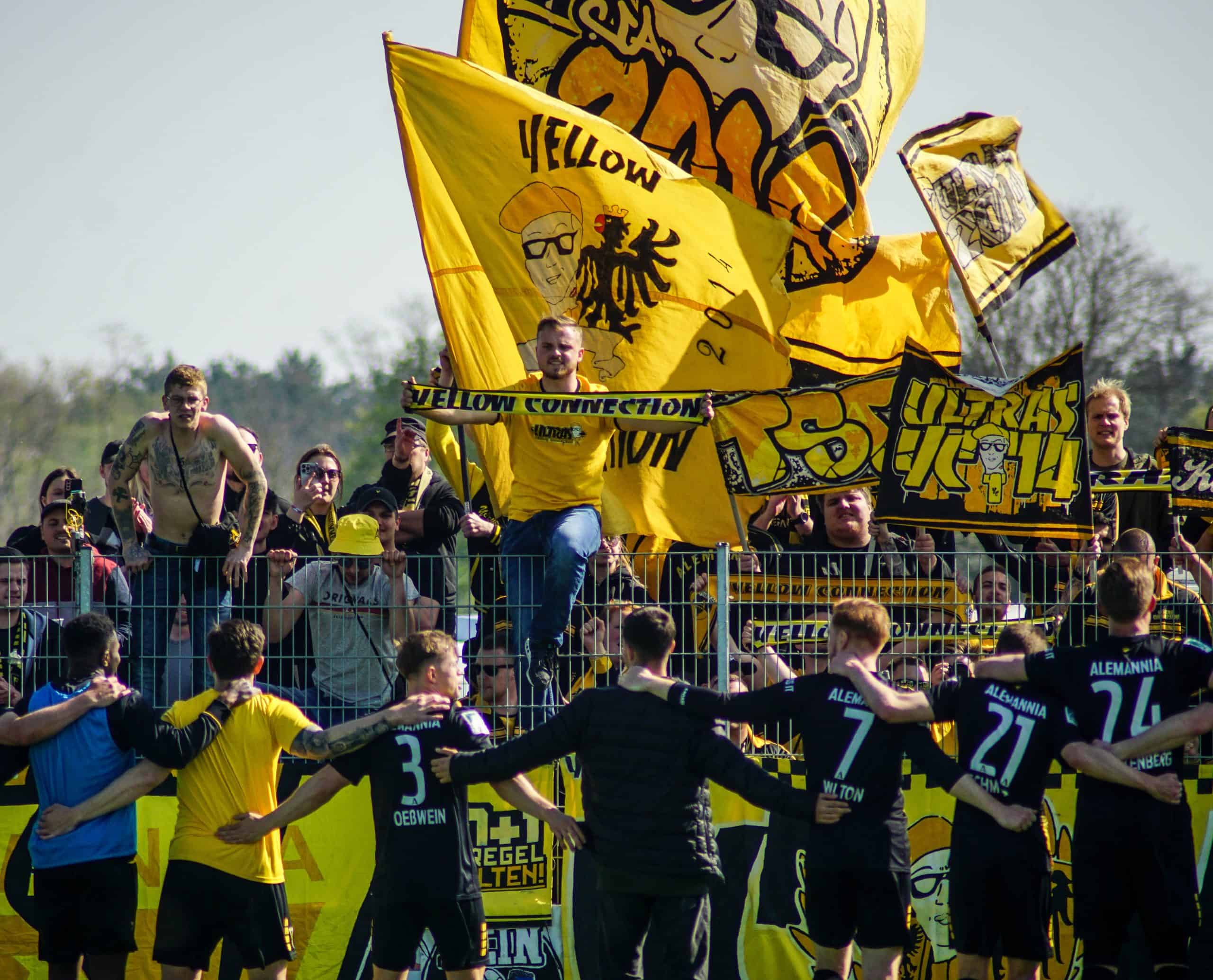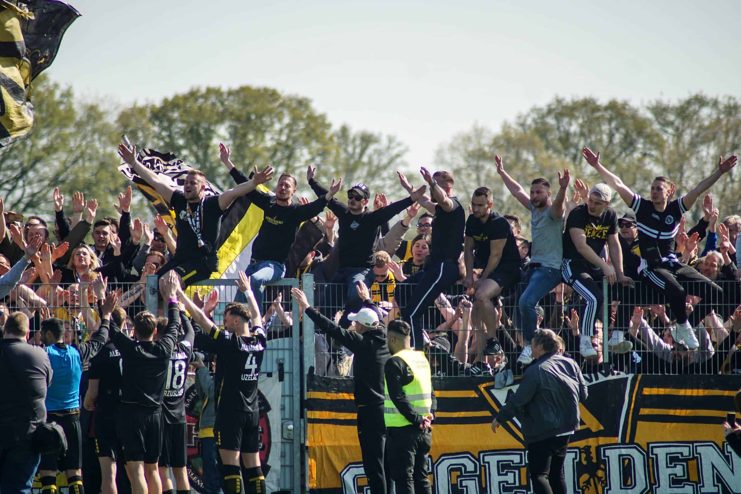 Aan het einde wordt het nog wel even spannend, maar de mannen in geel-zwart geven het niet meer uit handen en trekken met hangen en wurgen de belangrijke punten over de streep. Het is reden voor groot feest in het uitvak, dat op deze manier lijfsbehoud weer een stapje dichterbij ziet komen. De ultras gaan massaal de hekken in. Onder leiding van de capo wordt vervolgens nog minutenlang een feestje met de spelers gevierd. Springen, klappen, juichen, inhaken. Alle klassiekers komen voorbij op het sportpark in Straelen. Laten we hopen dat deze mooie Duitse voetbalmiddag het keerpunt gaat zijn voor de prachtige club Alemannia Aachen. Deze supporters verdienen namelijk vele malen meer dan een degradatiestrijd op het vierde niveau…