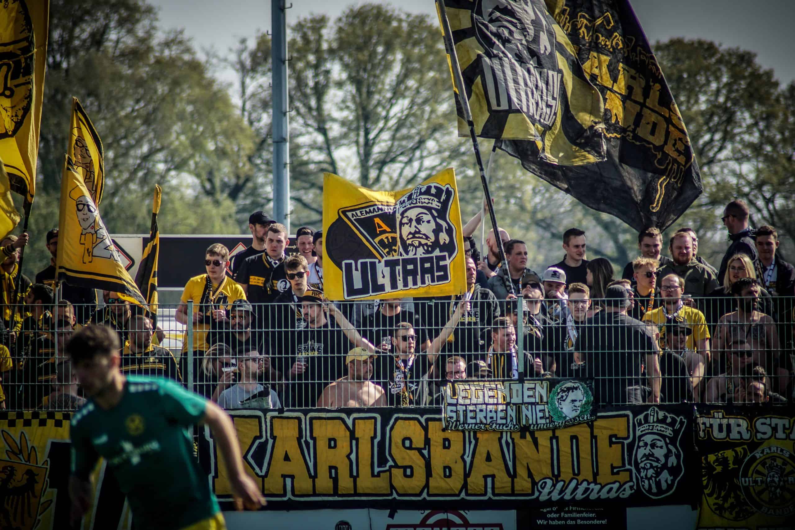 Verrassend is het niet dat de Ultras van Alemannia Aachen met zo’n prima sfeeractie komen. Met de Yellow Connection en Karlsbande Ultras zijn er momenteel twee prima groepen actief. Als geheel hebben de fanatieke supporters van Aachen al meer dan 30 jaar een goede vriendschap met de supporters van Roda JC, een feit dat enkele weken terug nog werd gevierd met een schitterende gezamenlijke tifo. Ook tijdens de wedstrijd vandaag zijn de ultras non-stop bezig. Het uitvak is doorlopend een allegaartje van verschillende vlaggen en bandieri’s. Ook hangen er enkele kleine doekjes tegen RB Leipzig en pro de 50+1 regel voor het vak. Toch een beetje de paradepaardjes van de Duitse ultras. Een ander gevolg van hun aanwezigheid is een zichtbare grote politie-inzet rondom het veld. Overal lopen agenten over het sportpark om een oogje in het zeil te houden.