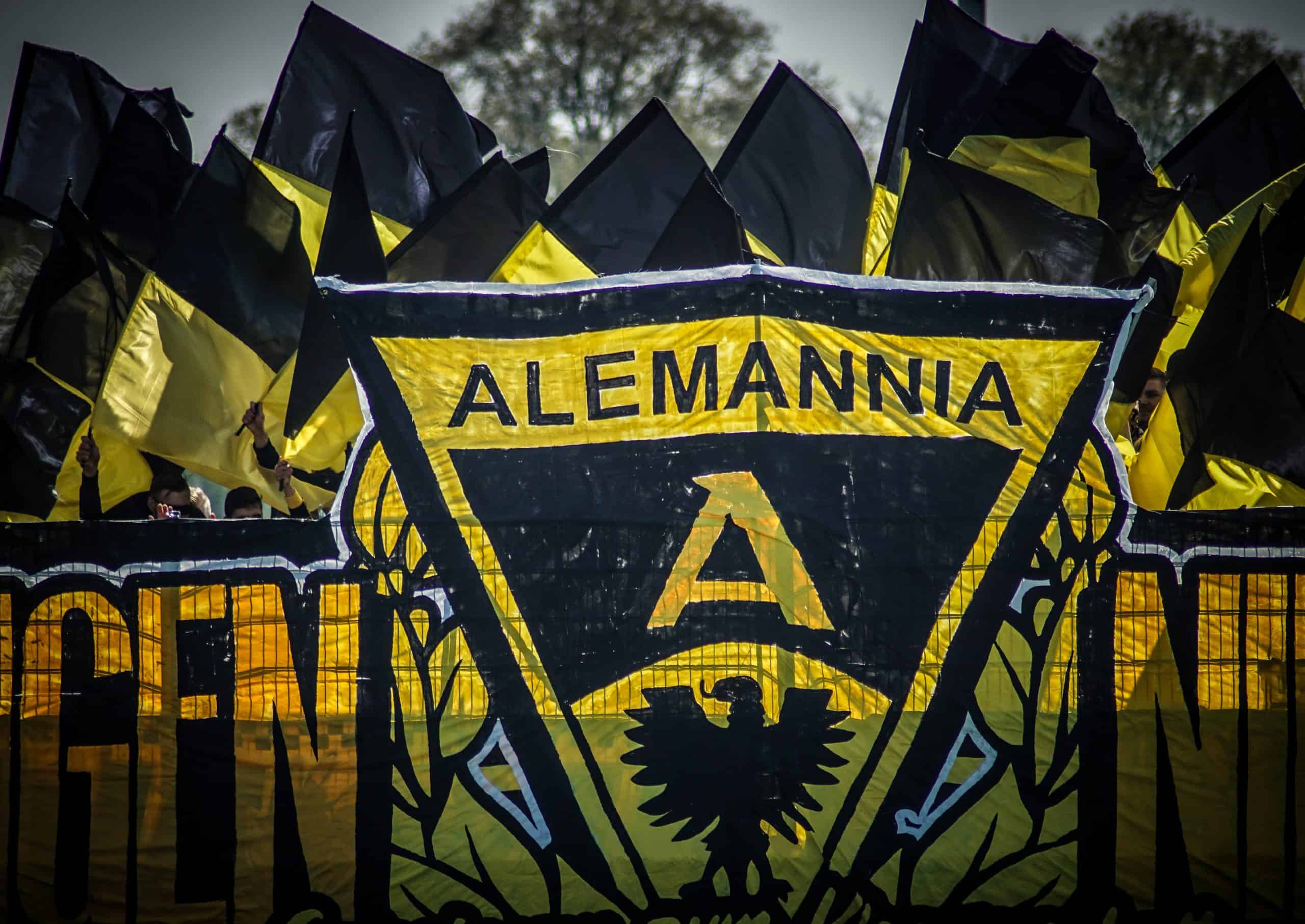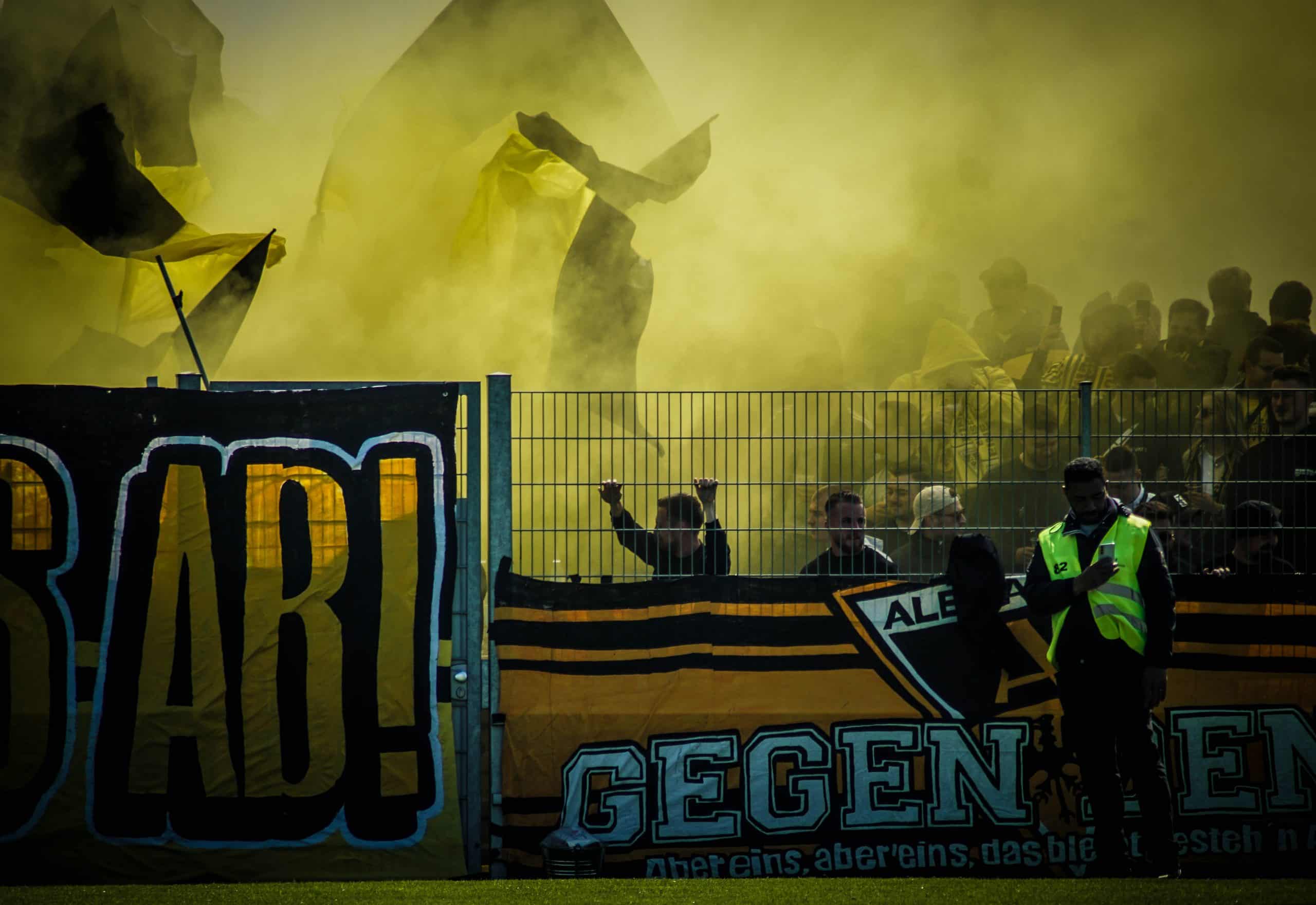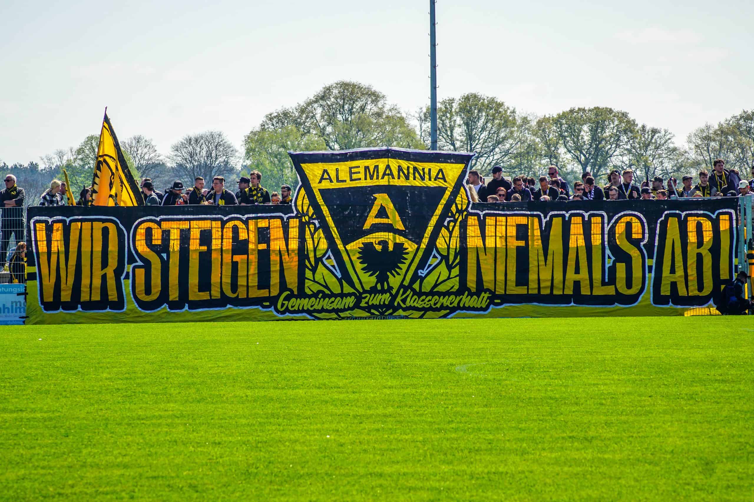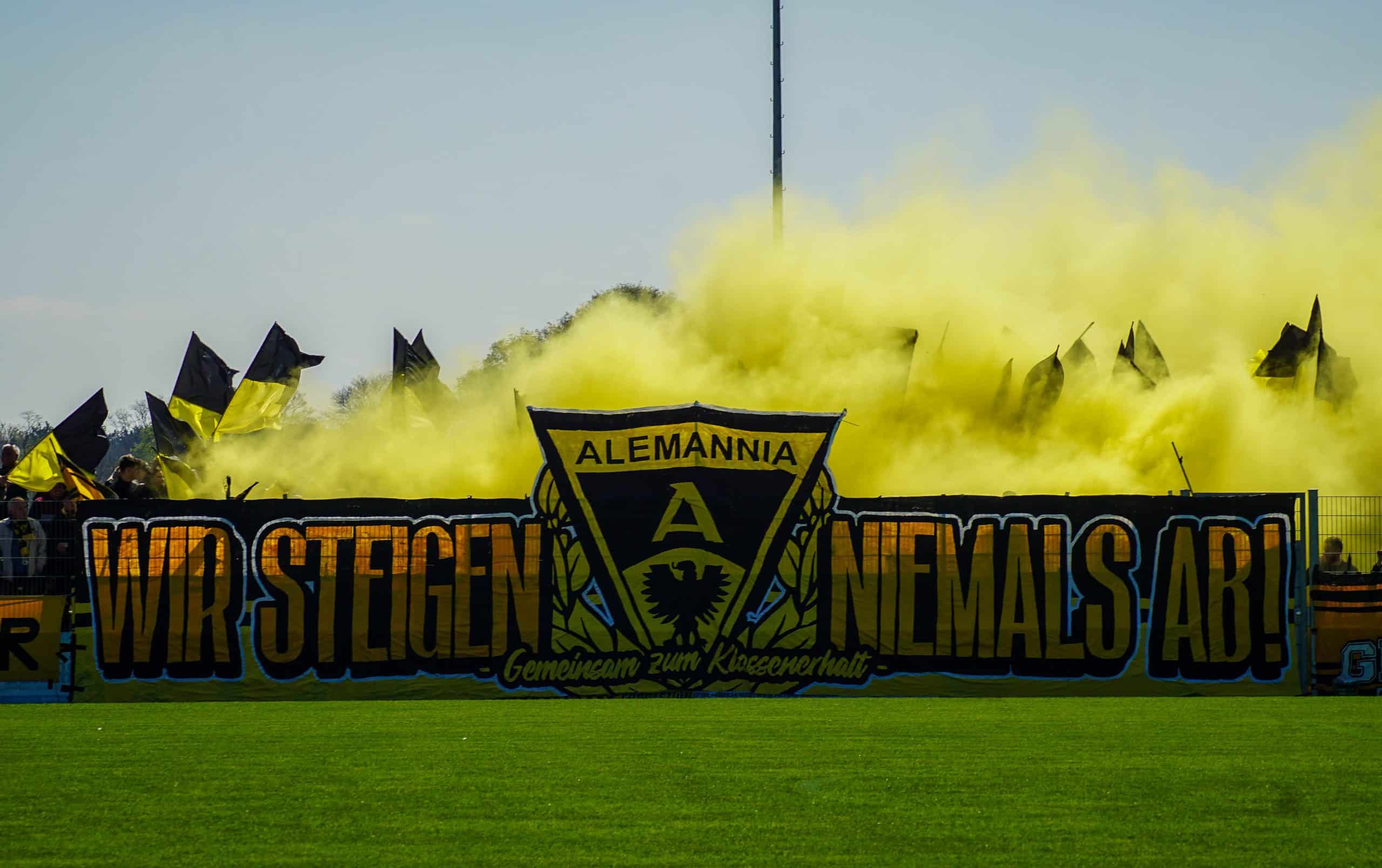 Dat een eventuele degradatie ook in de hoofden van de supporters speelt is gelijk duidelijk. Over het reclamebord waarachter zij hun vak hebben hangt een doek met de tekst “Gegen den Abstieg” (vrij vertaald: tegen degradatie) en daarnaast een kickbokser die deze zin kapot schopt. Tevens blijkt dat de Ultras van Alemannia Aachen een sfeeractie hebben voorbereid voor deze degradatiekraker. Op een groot spandoek staat in koeienletters de tekst “Wir steigen niemals ab!”. Wij degraderen nooit! In het midden staat het logo van Alemannia Aachen; eronder staat in het klein “Gemeinsam zum Klassenerhalt” oftewel samen voor lijfsbehoud. Dit moet toch een duidelijke boodschap zijn voor de spelers. Degradatie is geen optie en vandaag moet het keerpunt ingezet gaan worden. Vlak voor de opkomst gaan er wat gele doekjes over de hoofden heen om de aanwezige camera’s het zicht te ontnemen. Zo kan er precies bij de opkomst een mooie vuurwerkactie achter het spandoek ontstaan. Dankzij meerdere rookbommen krijgen de aanwezige supporters en spelers een mooi beeld voorgeschoteld. Als de rookwolken zijn opgetrokken blijft er een zee aan geel-zwarte vlaggen over. Een nette, mooi uitgevoerde sfeeractie!