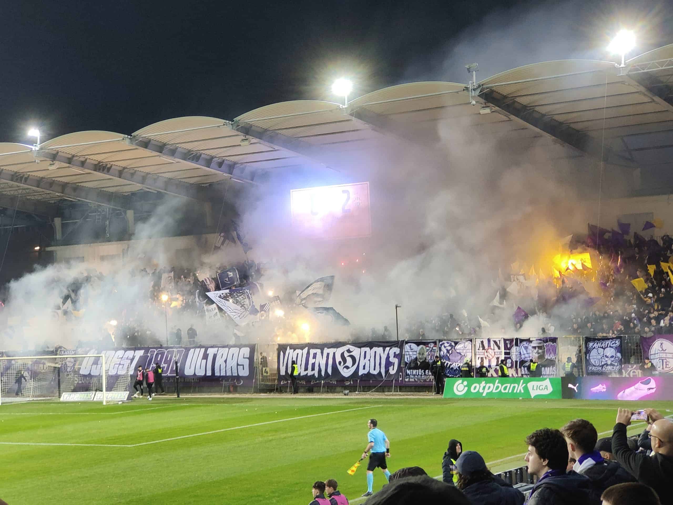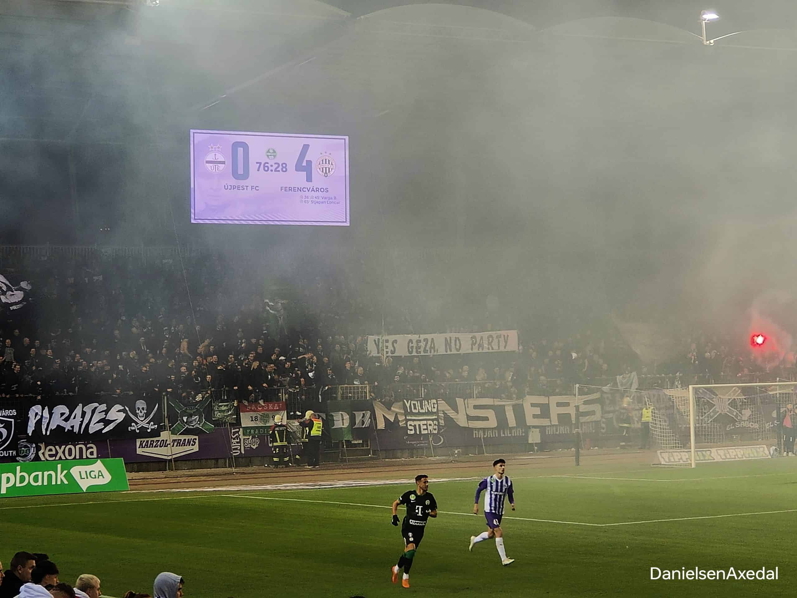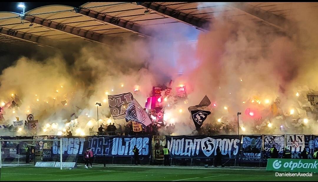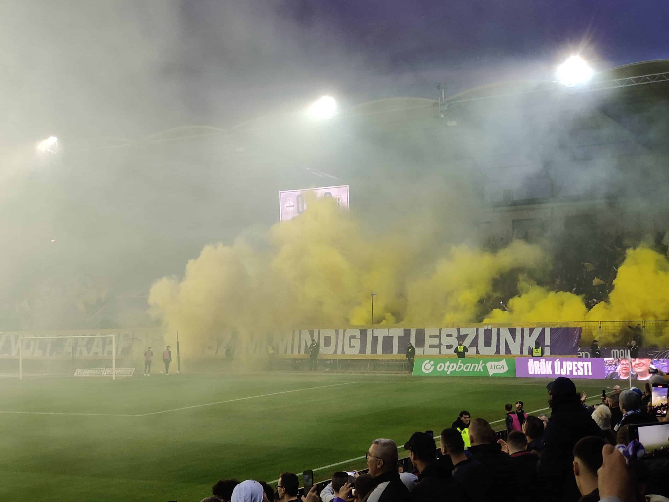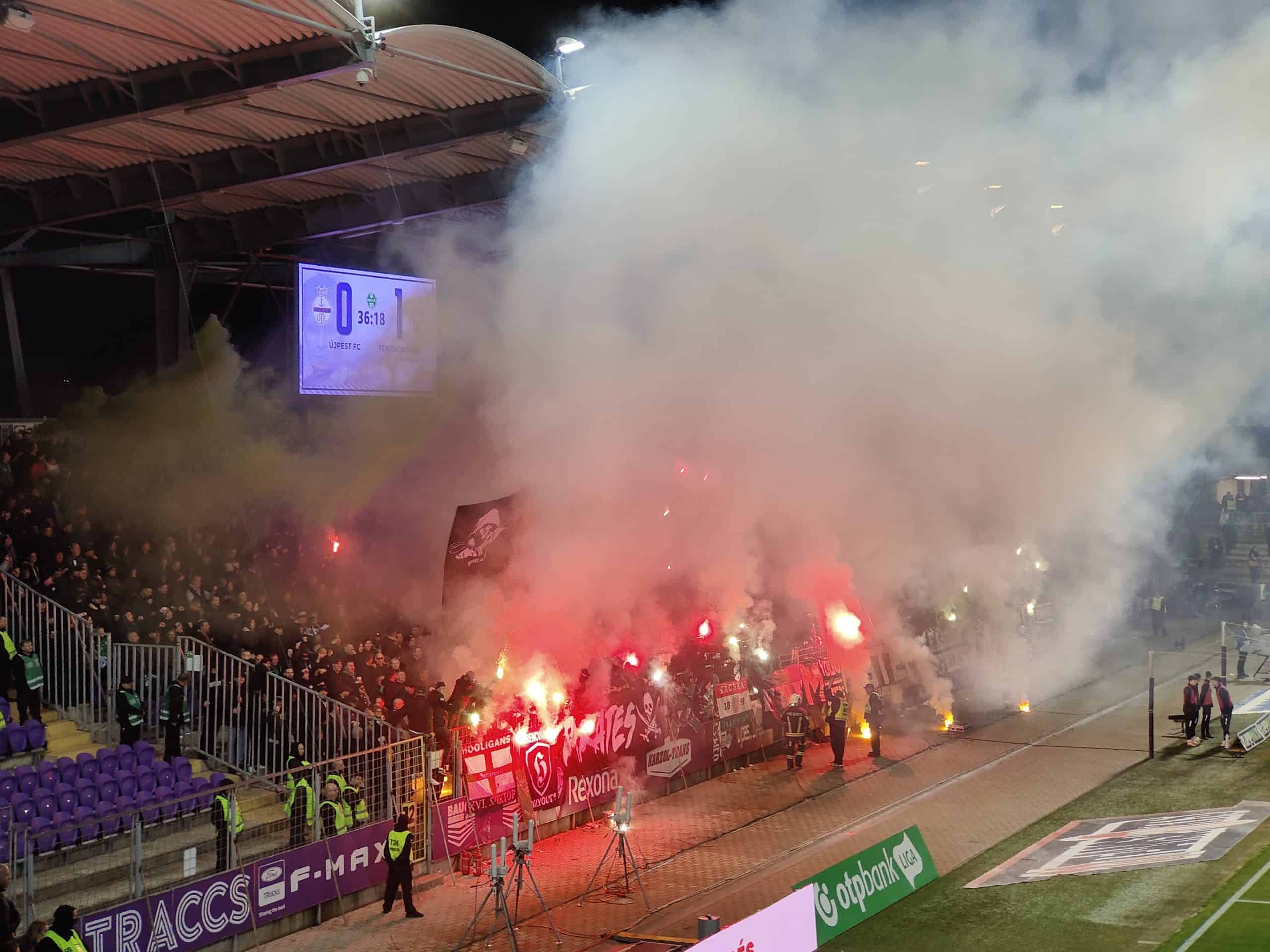 Nadat het nationale volkslied is gezongen staan we aan het begin van een reeks aan waanzinnige sfeeracties van beide supportersgroepen. Újpest begint met een zee aan vlaggen en een spandoek waarop ‘Wat er ook gebeurt, wij zijn hier voor altijd’ staat, aangevuld met rookpotten. Ferencváros trapt af met pyro en creëert de kleuren van de Hongaarse vlag. De grootschalige pyro-festijnen en rookbombardementen creëren tijdens de wedstrijd massa’s aan rook en daarom wordt de wedstrijd liefst vier keer stilgelegd. Die van Újpest vlak na de rust is het meest indrukwekkend, de hele korte zijde gaat als een gek tekeer. Ondertussen staan de brandweermannen beneden de vakken klaar om de ladingen veilig weg te halen. In Hongarije is er echt geen enkele controle bij de fanatieke zijden.