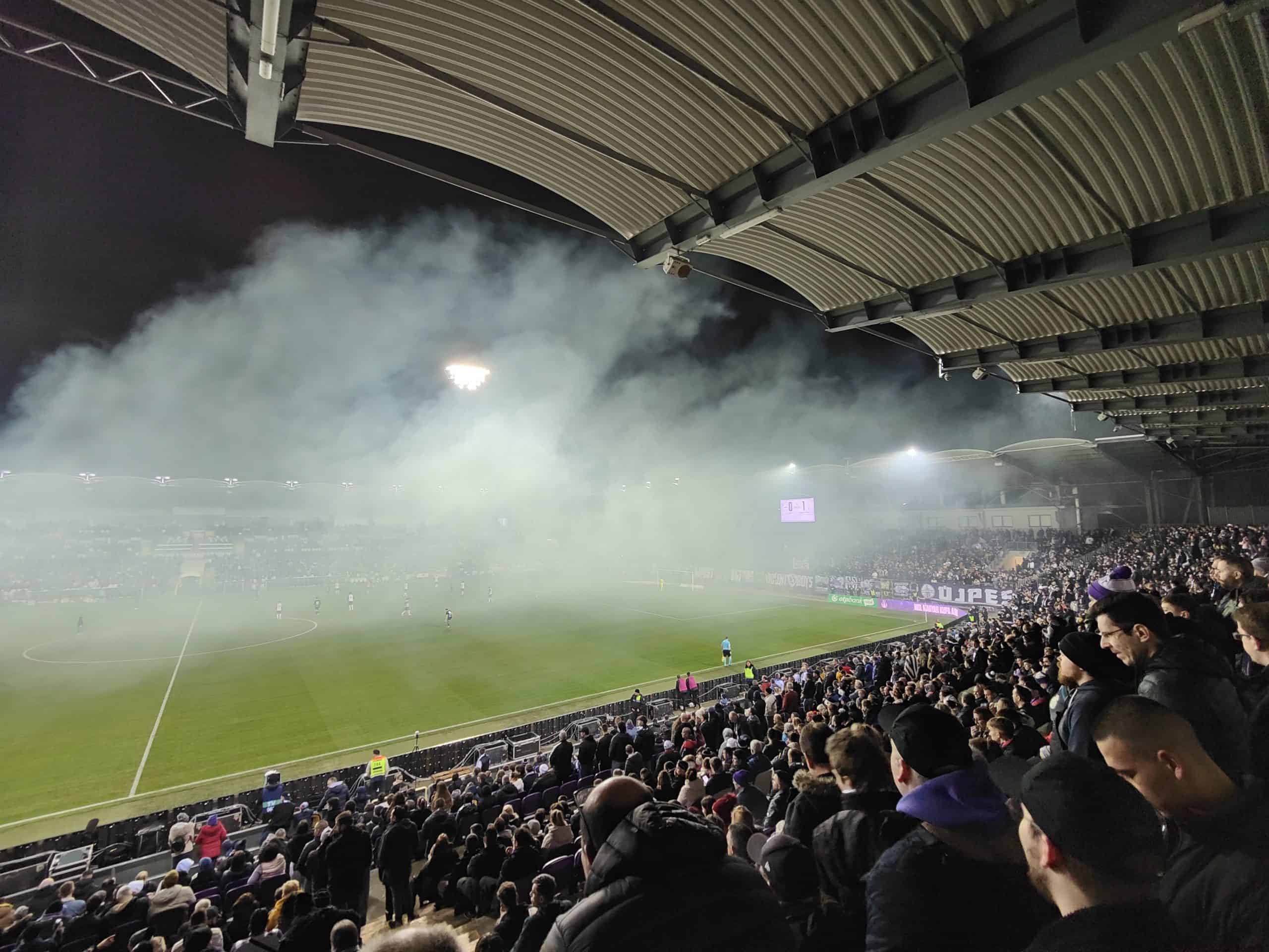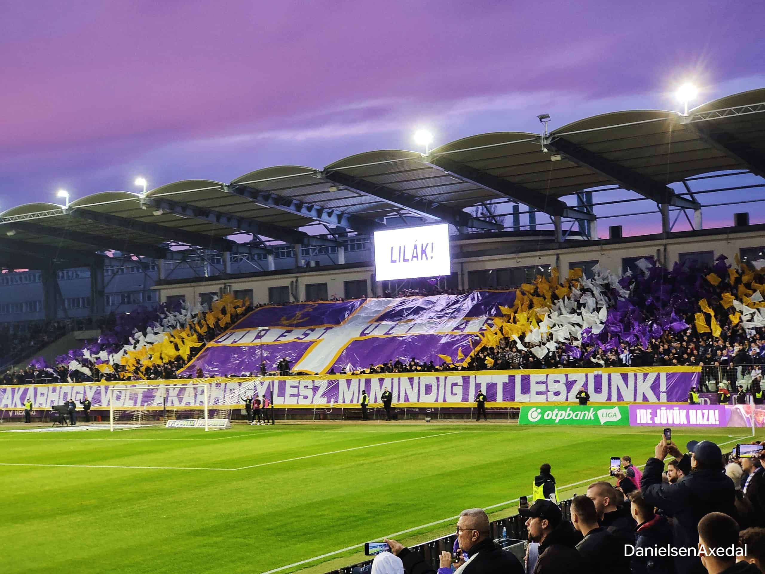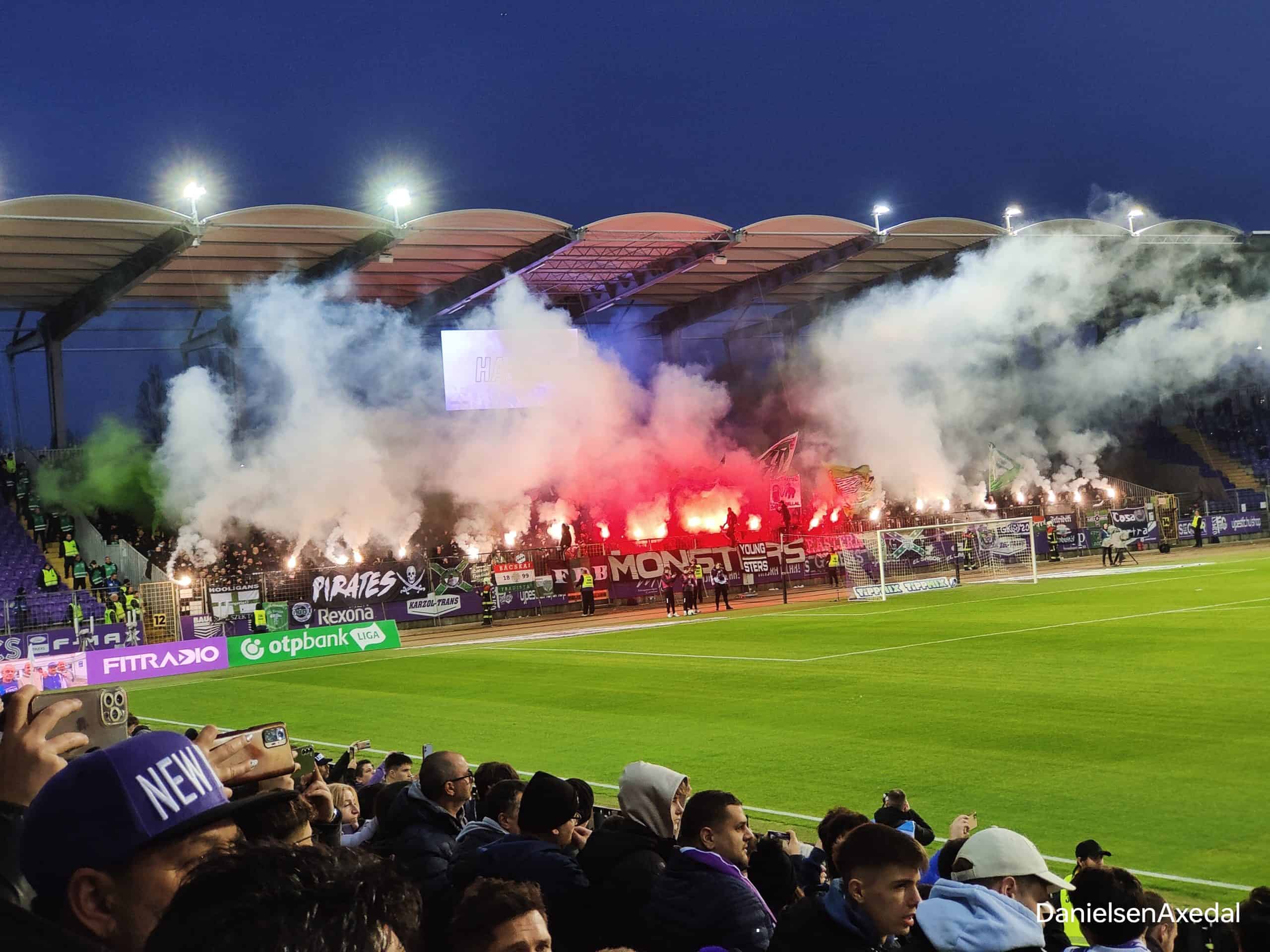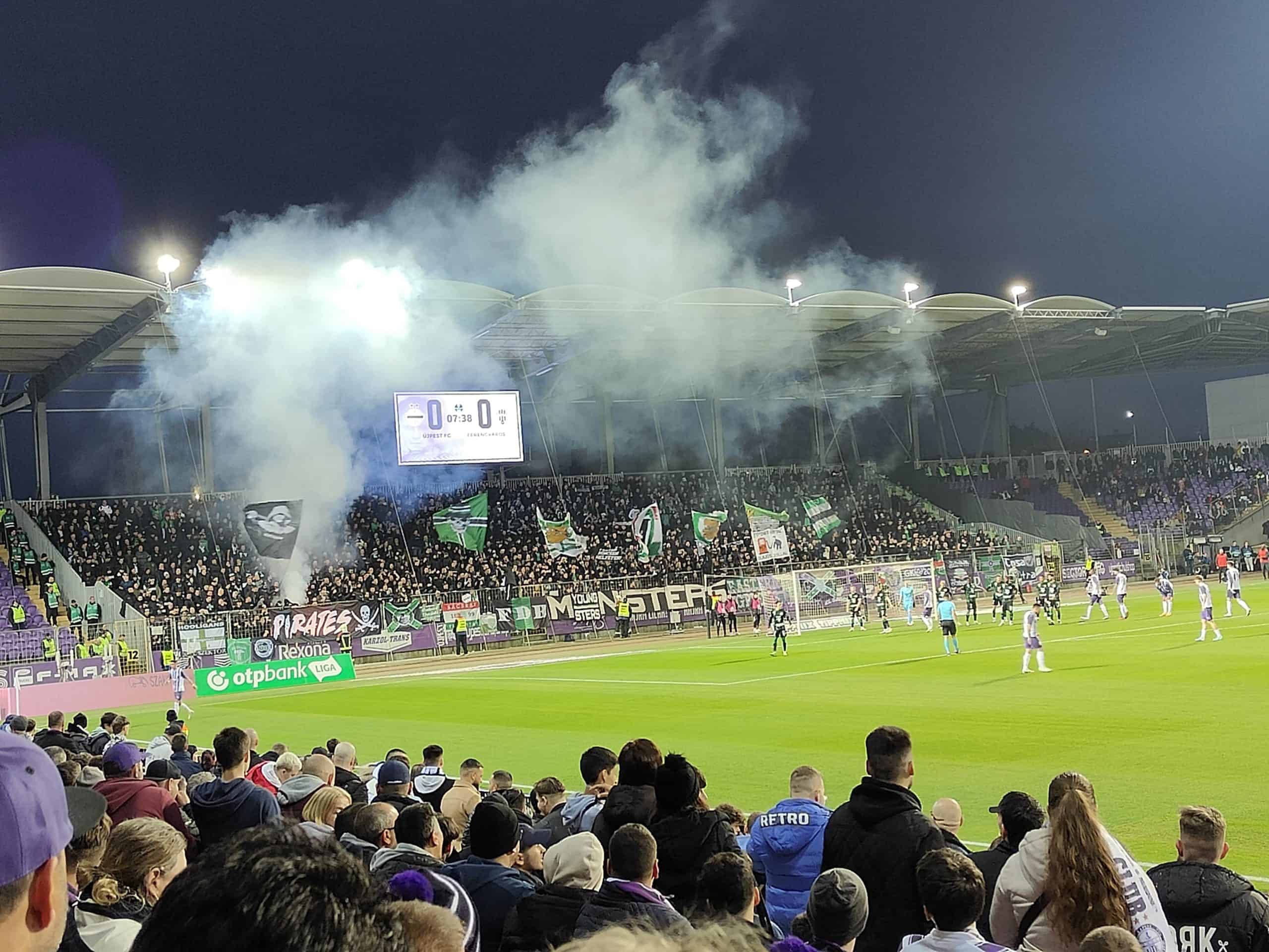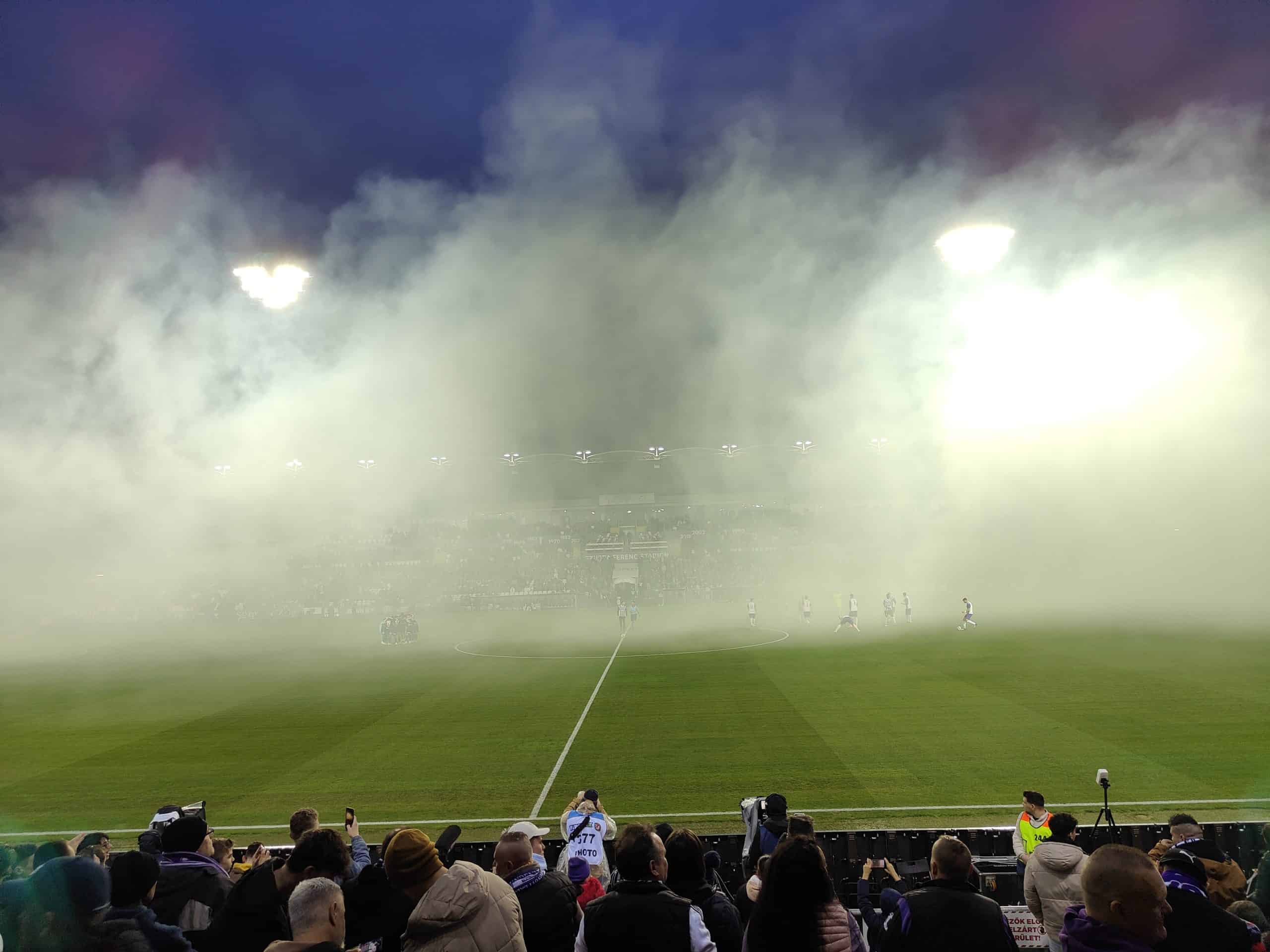 Nadat het nationale volkslied is gezongen staan we aan het begin van een reeks aan waanzinnige sfeeracties van beide supportersgroepen. Újpest begint met een zee aan vlaggen en een spandoek waarop ‘Wat er ook gebeurt, wij zijn hier voor altijd’ staat, aangevuld met rookpotten. Ferencváros trapt af met pyro en creëert de kleuren van de Hongaarse vlag. De grootschalige pyro-festijnen en rookbombardementen creëren tijdens de wedstrijd massa’s aan rook en daarom wordt de wedstrijd liefst vier keer stilgelegd. Die van Újpest vlak na de rust is het meest indrukwekkend, de hele korte zijde gaat als een gek tekeer. Ondertussen staan de brandweermannen beneden de vakken klaar om de ladingen veilig weg te halen. In Hongarije is er echt geen enkele controle bij de fanatieke zijden.