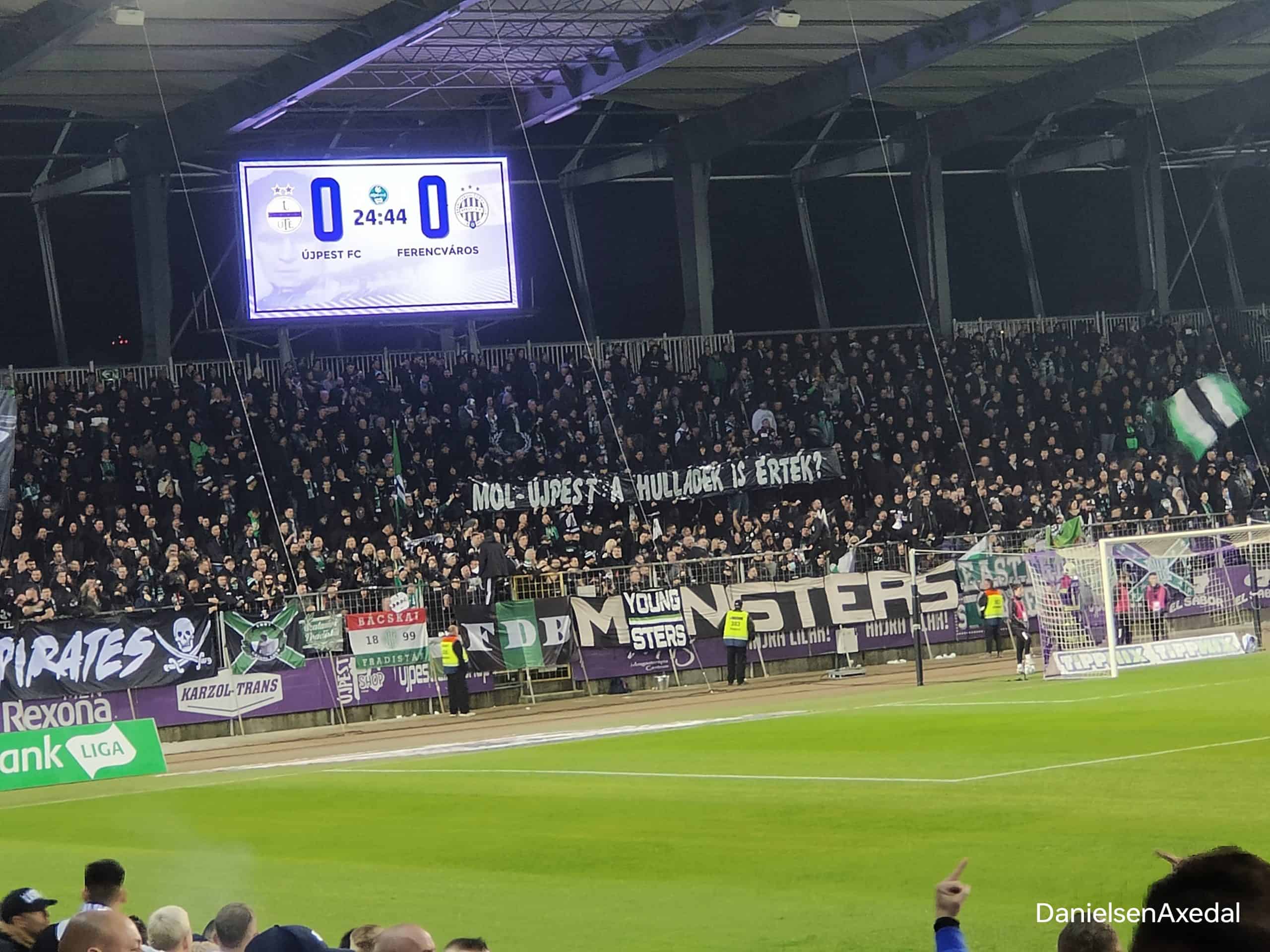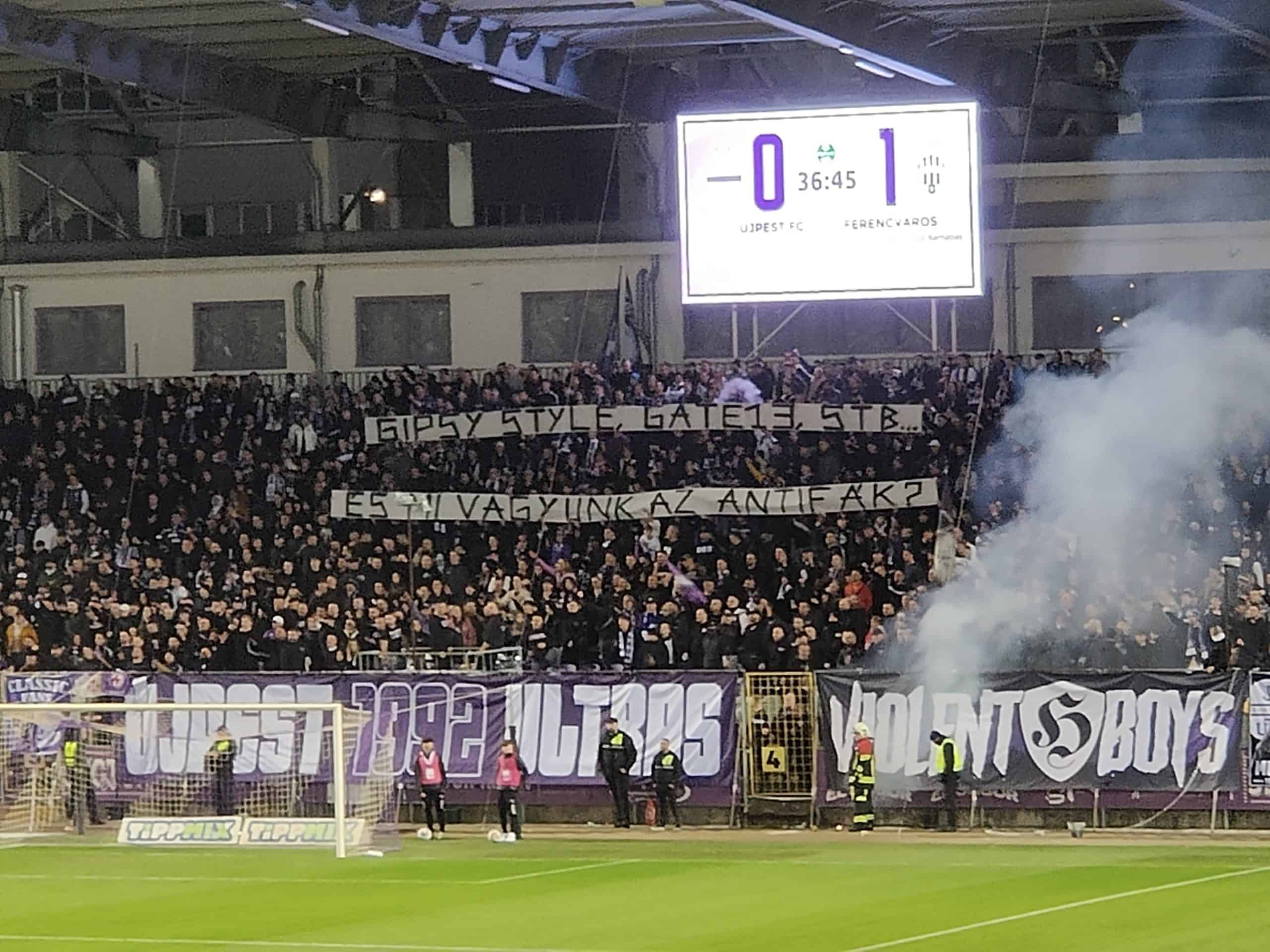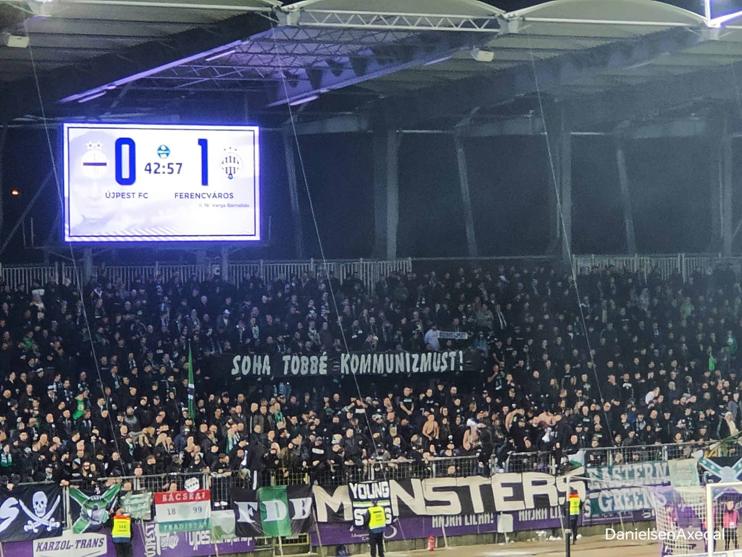 Ferencváros staat er in Europa bekend om een van de allerbeste groepen te hebben. Bij de derby wordt dit telkens onderstreept en treden de creatieve meesterbreinen naar voren. Gedurende de wedstrijd komen er liefst acht banners tevoorschijn om de spot te drijven: ‘MOL Újpest, is afval ook rijkdom?’, ‘Nooit meer Communisme!’, ‘Met rechte rug wordt olieachtig speeksel ingezogen.’, ‘Heeft MOL voor dit betaald?’, ‘Heb je de choreo van de vorige keer?’ en ‘Yes Géza, No Party’ (de trainer van Újpest is vandaag jarig). En tenslotte bij een 0-5 voorsprong: ‘Kun je het geloven?‘
