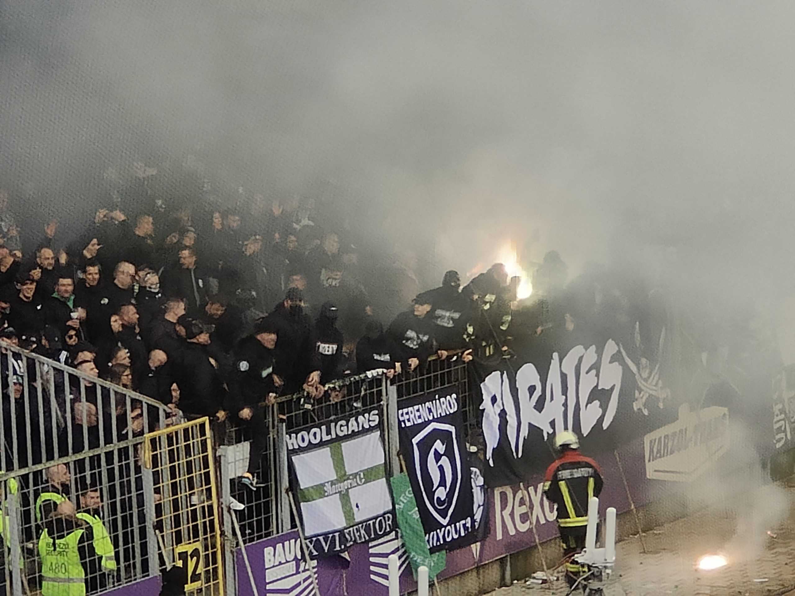 Op het hoofdplein worden Újpest-liedjes gescandeerd en halve liters bier gedronken, terwijl rookpotten met de kleur paars afgaan. Toch is het rustiger dan normaal, want een grote groep ultras lijkt te ontbreken. ‘‘Die zijn vast op zoek’’, zegt Milán. Als we in het stadion zijn, zien we alle Ferencváros-supporters van het uitvak wegrennen. Het vermoeden van Milán was juist, want Újpest-supporters vallen het uitvak aan. Ze zijn via het trainingsveld bij de uitsupporters gekomen en enkel een hek scheidt de ultras nog. Enkele supporters weten elkaar te raken voordat de politiemacht in kan grijpen. Later maken de hooligans van Újpest in een statement duidelijk dat Ferencváros niet kwam opdagen voor een gevecht twee dagen eerder. Dit was de revanche: ‘‘Liegen is een Fradistische eigenaardigheid, ze durven alleen met honderd agenten naar Újpest te komen.’’