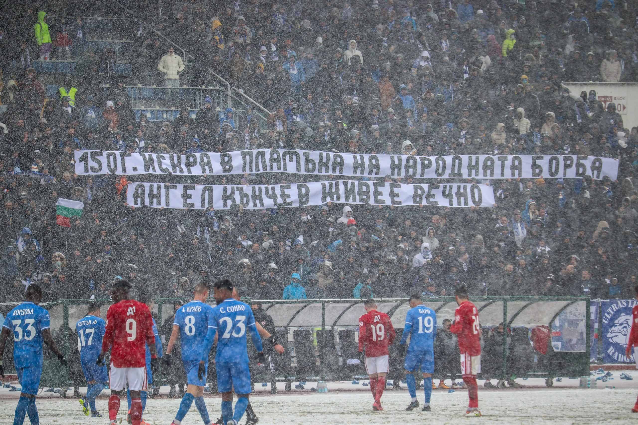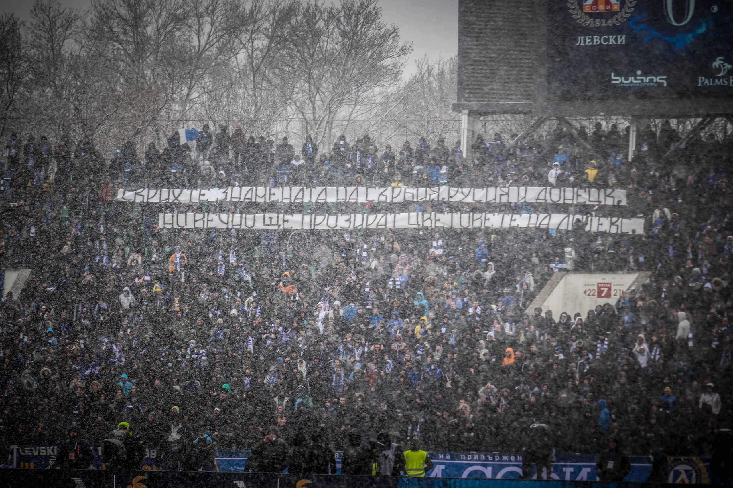 De warming-up is geen warming-up te noemen. Ik kan mij de laatste keer niet herinneren dat het tijdens een wedstrijd zo steenkoud was. De tenen zijn inmiddels in ijspegels veranderd als de aftrap in zicht is. Tijd voor de tifo’s! De supporters van Levski en CSKA komen beiden met prachtige tifo’s in de kleuren van hun eigen club. Van pyro is er helaas geen sprake, waarschijnlijk vanwege de weersomstandigheden. Tóch zijn beide sfeeracties indrukwekkend, vooral in combinatie met het luide gezang van beide kanten. Door op de lange zijde te staan, is een ware geluidsorkaan te horen. Genieten!