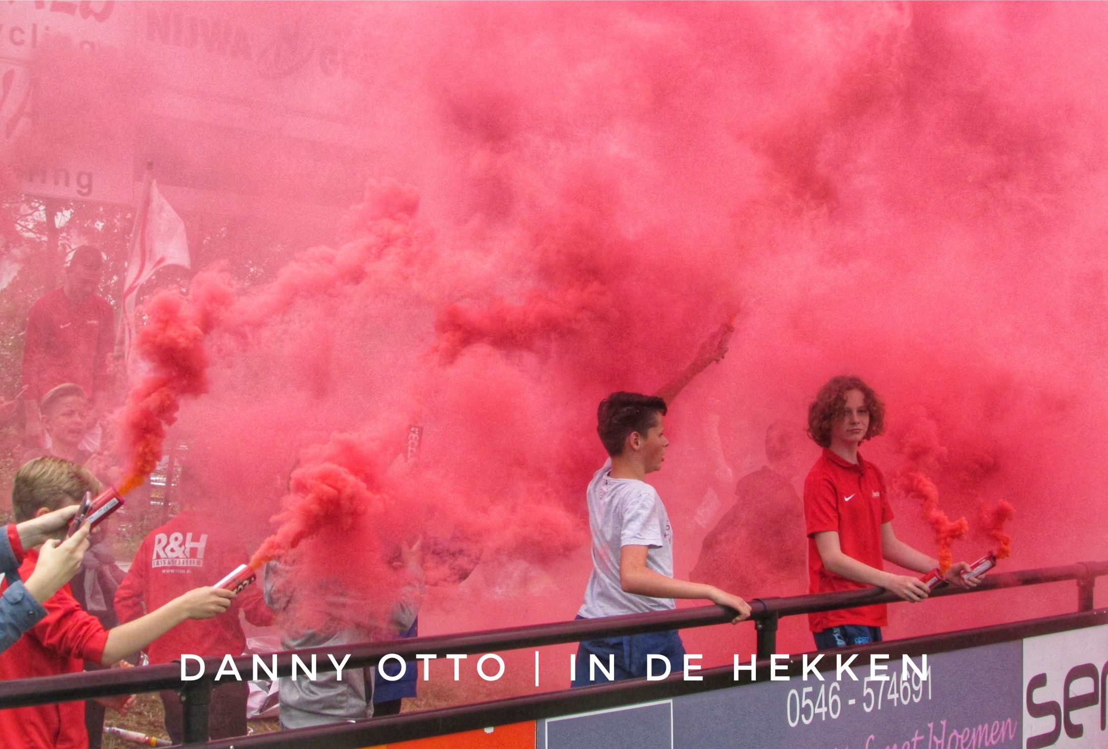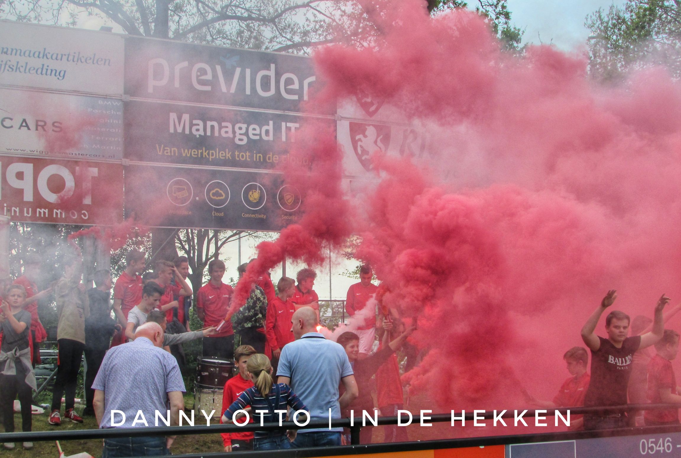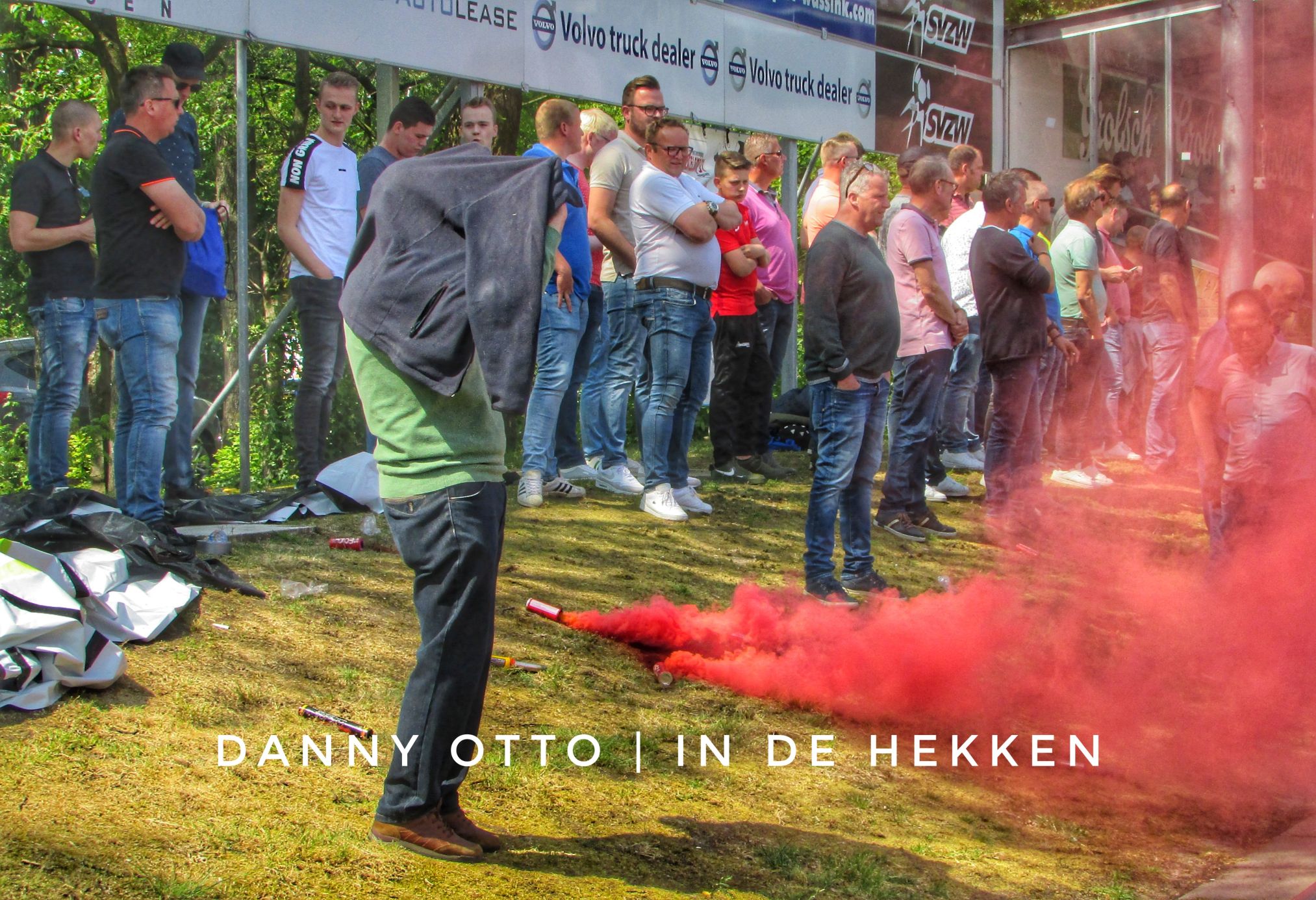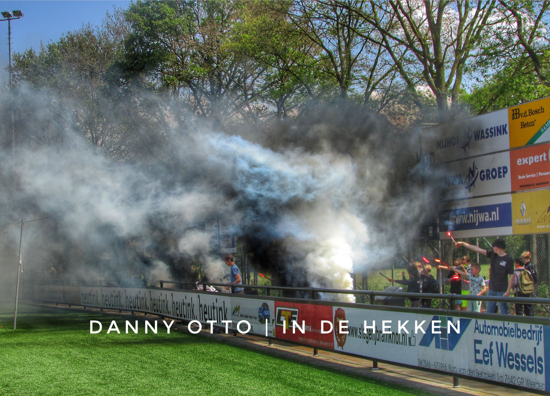 Totdat de spits van de Rijssenaren twee keer op de juiste plek staat. In de 70e en 74e minuut tikt hij op exact dezelfde wijze simpel de bal binnen. Bij de 1-2 stormen de spelers richting de ‘meegereisde’ supporters om de goal te vieren. Weer worden er rookpotten en -fakkels afgestoken. Een supporter op leeftijd vindt het nu wel mooi geweest en loopt richting een rookfakkel die in de grond is geplant. Hij neemt een flinke aanloop en trapt de fakkel de weg op die aan het sportpark grenst. Een puntertje, a la Luis Suarez.