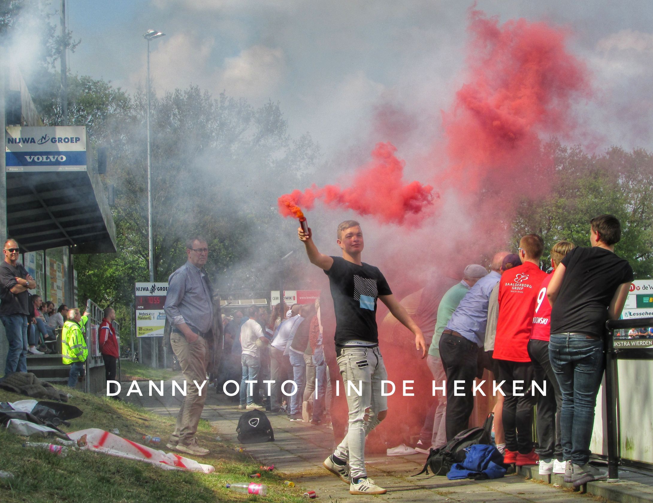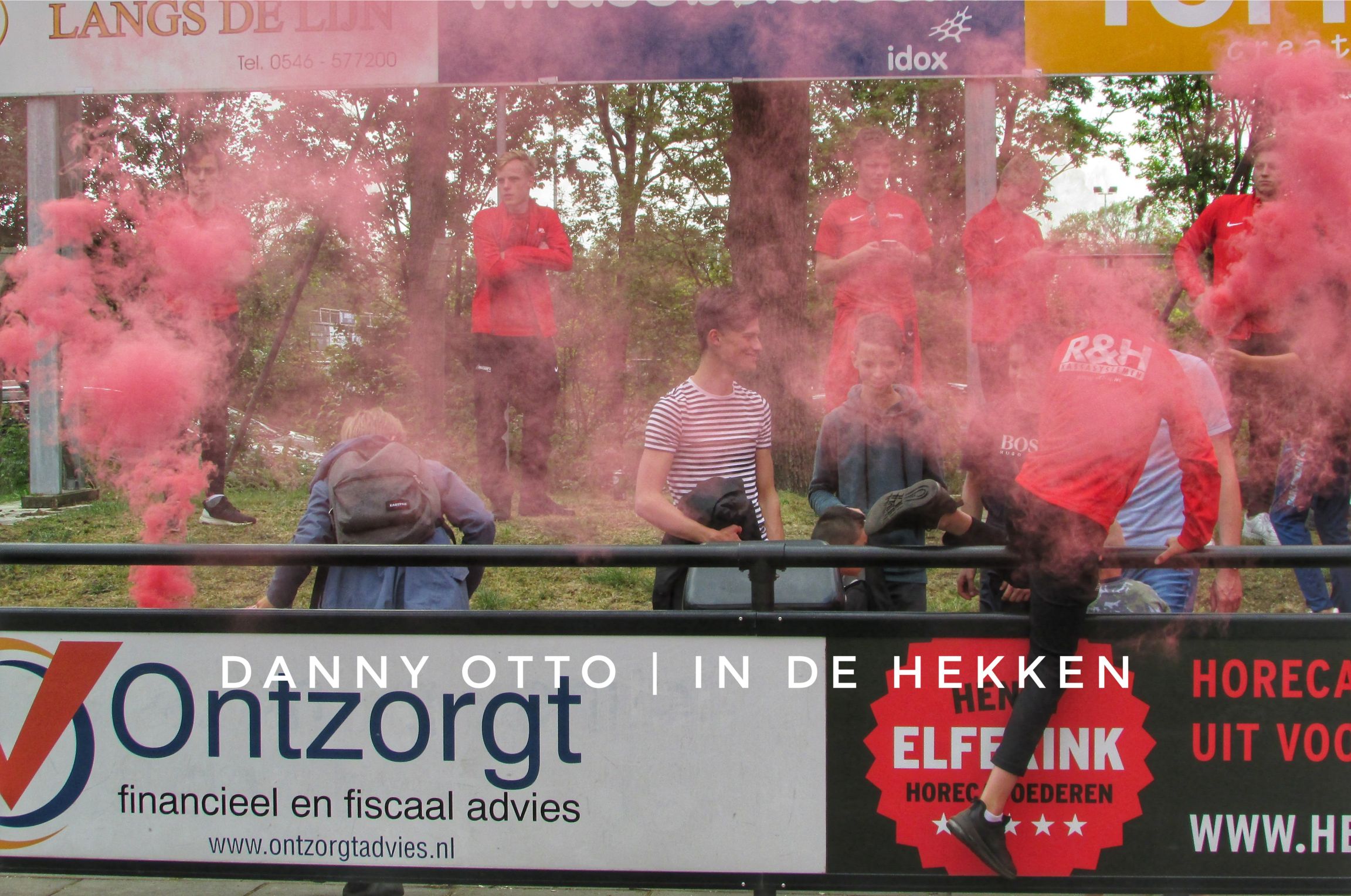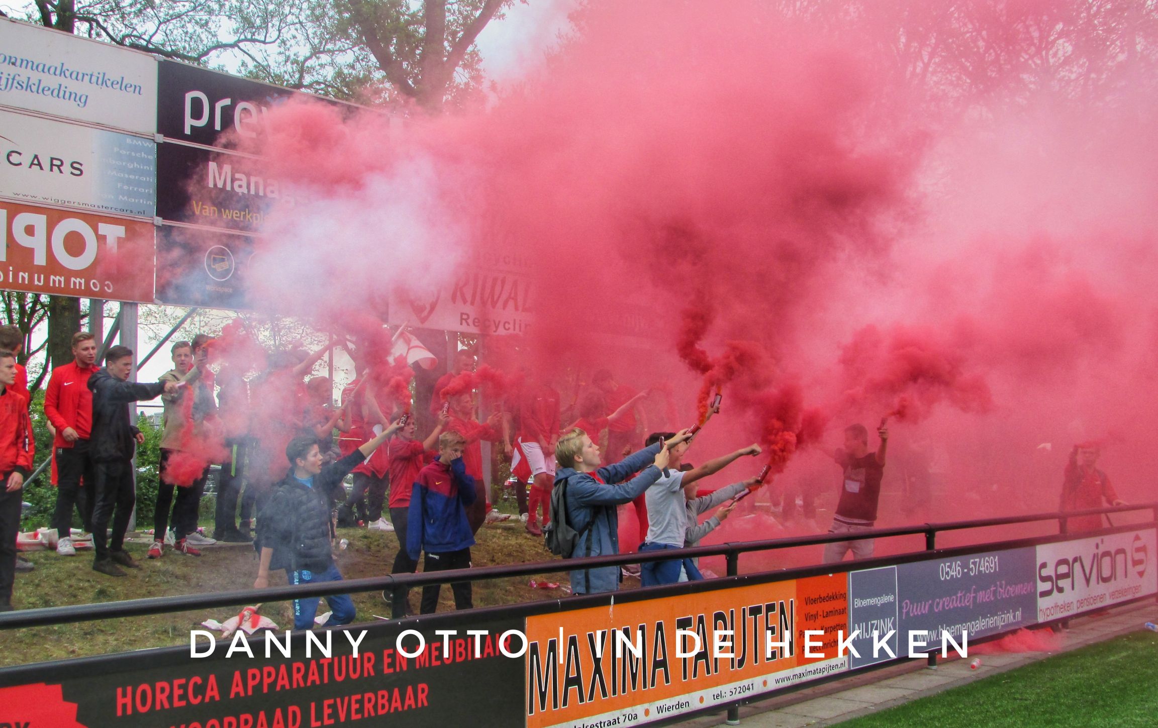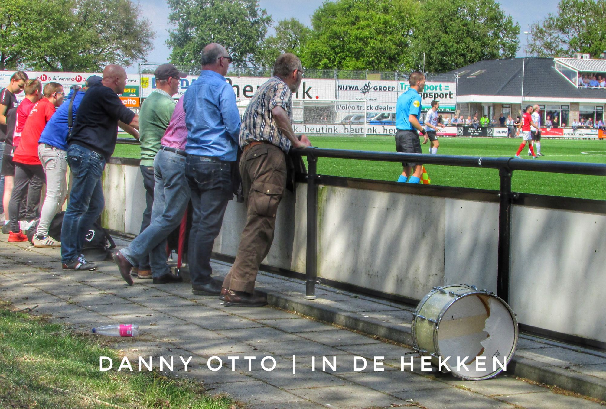 Totdat de spits van de Rijssenaren twee keer op de juiste plek staat. In de 70e en 74e minuut tikt hij op exact dezelfde wijze simpel de bal binnen. Bij de 1-2 stormen de spelers richting de ‘meegereisde’ supporters om de goal te vieren. Weer worden er rookpotten en -fakkels afgestoken. Een supporter op leeftijd vindt het nu wel mooi geweest en loopt richting een rookfakkel die in de grond is geplant. Hij neemt een flinke aanloop en trapt de fakkel de weg op die aan het sportpark grenst. Een puntertje, a la Luis Suarez.