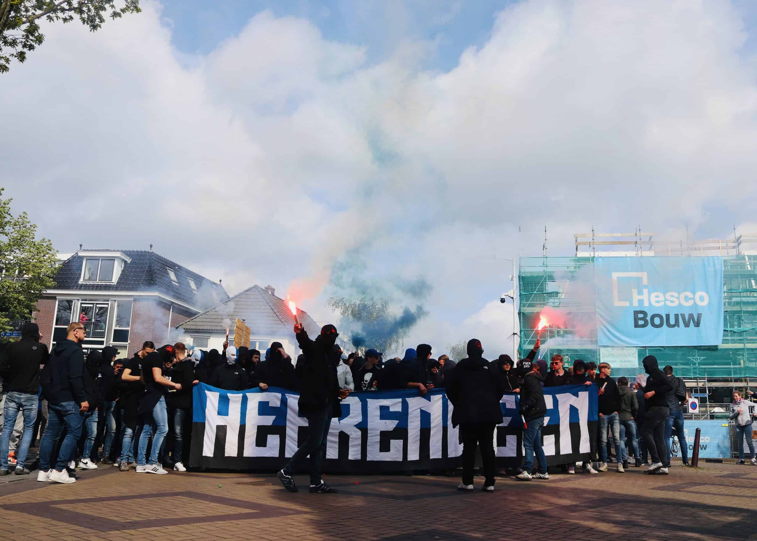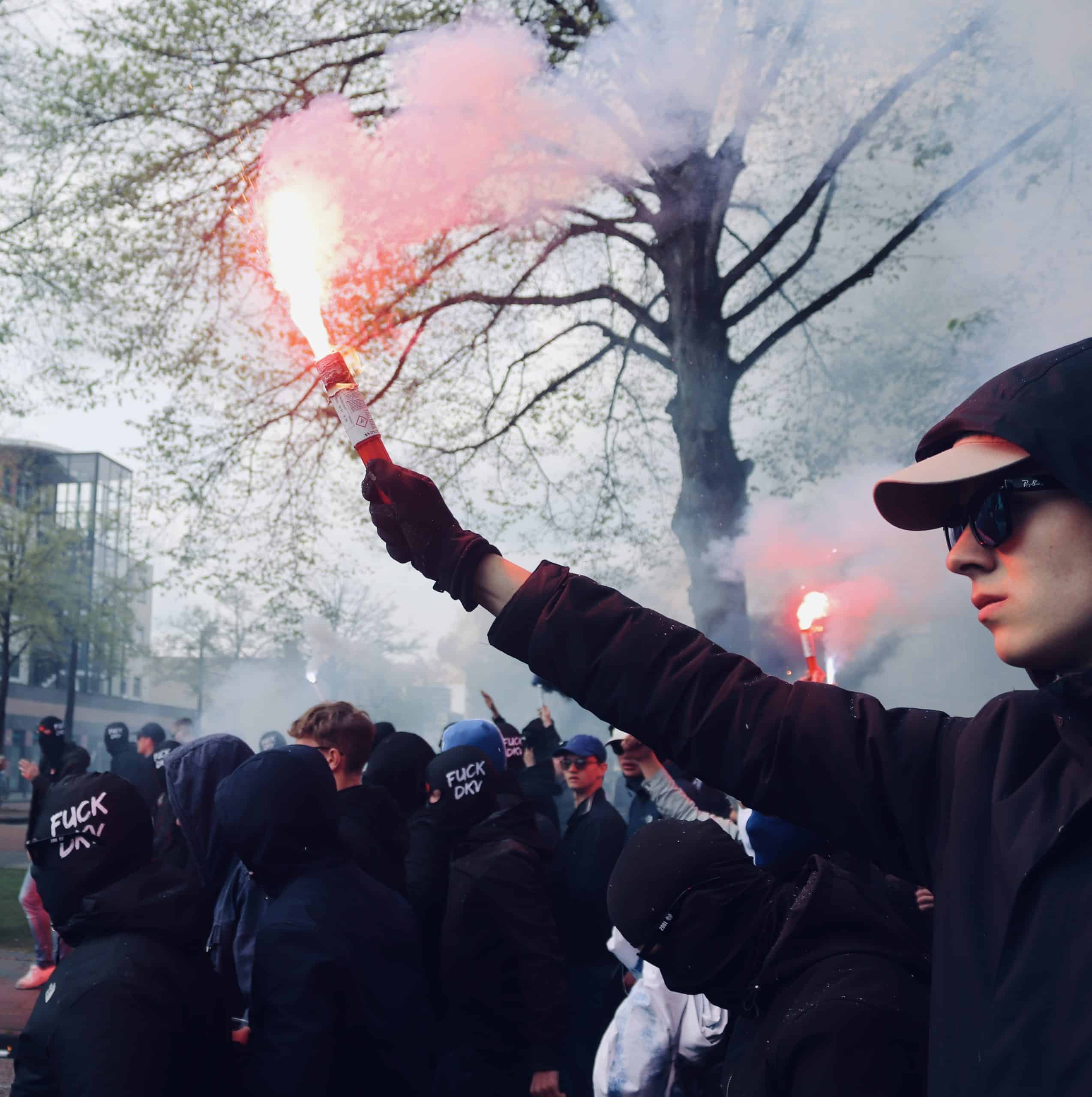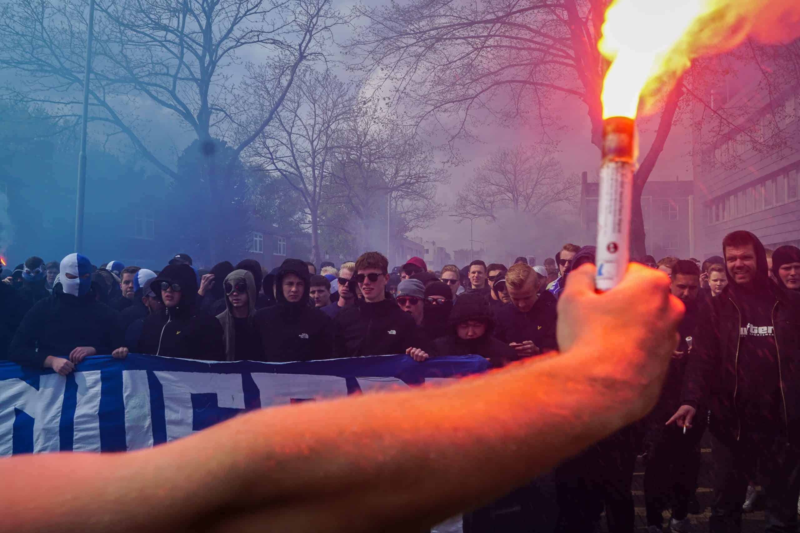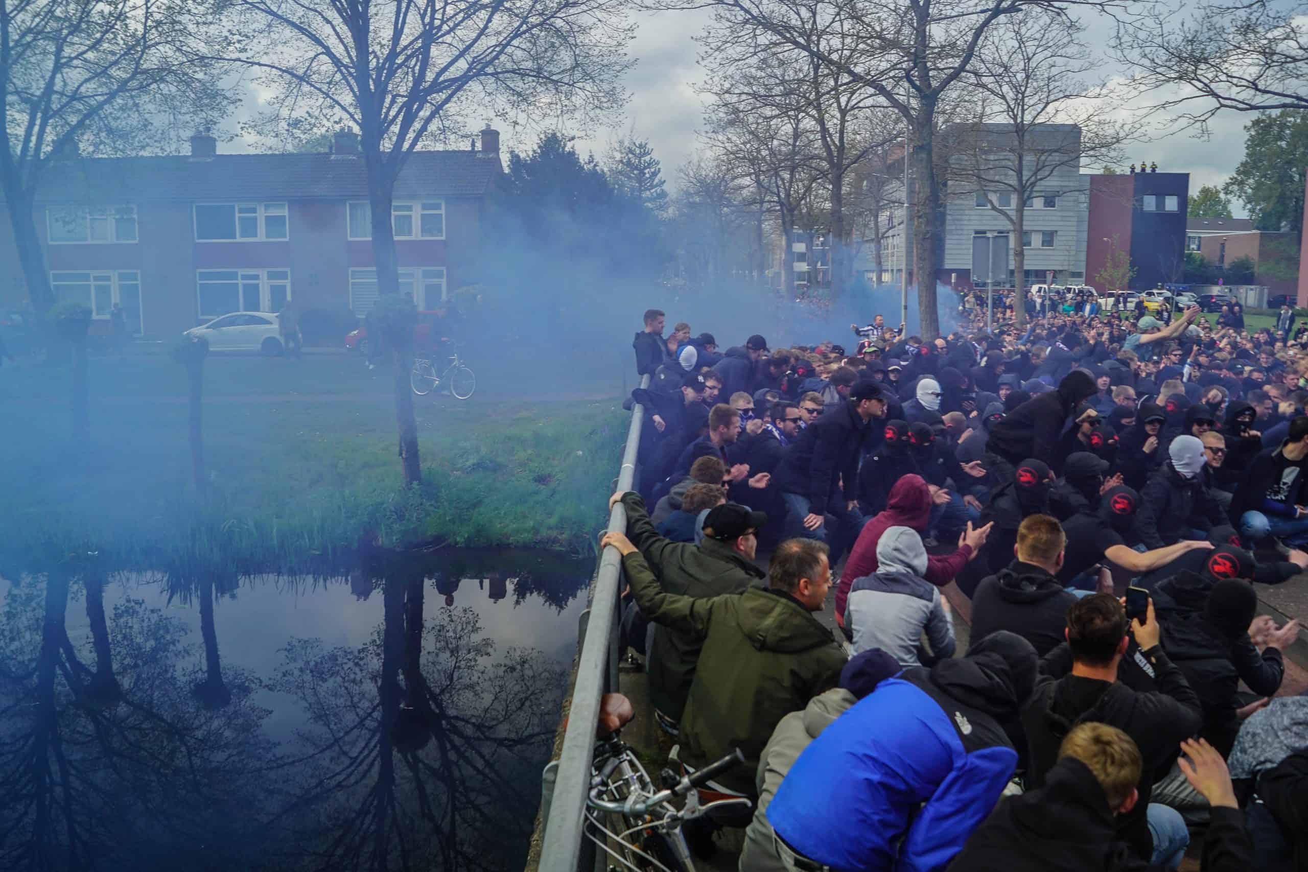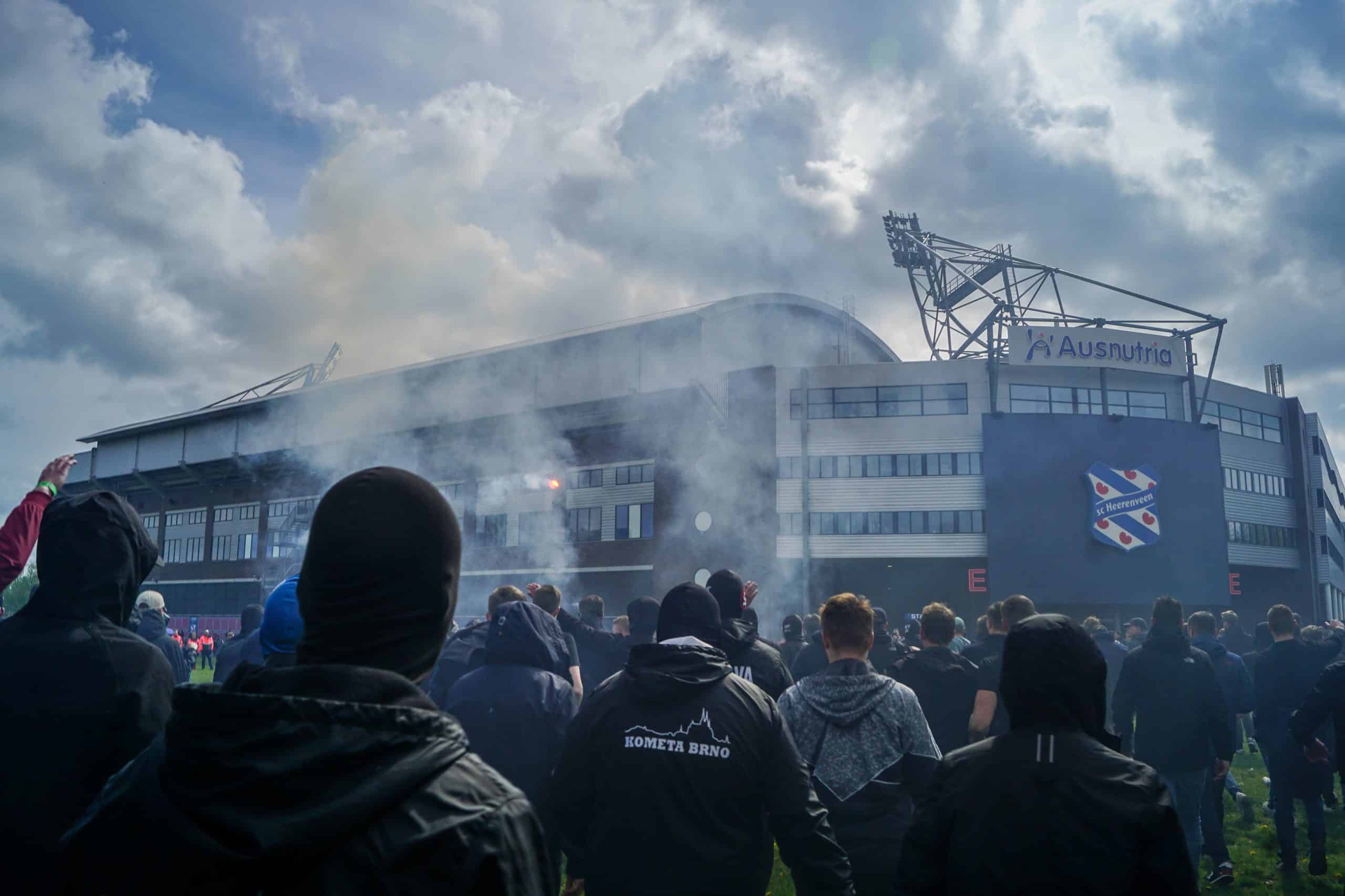 Dan is het tijd voor de hele stoet om in beweging te komen en de wandeling van, op papier, ongeveer een kwartiertje richting het Abe Lenstra stadion af te leggen. Natuurlijk duurt de corteo een heel stuk langer. Op meerdere momenten wordt er halt gehouden voor nog een massale pyroshow of wat anticambuur-liedjes. Het regent bijna de hele tijd as. De hele partij van honderden mensen wordt opgezweept door een capo met megafoon en een grote trommel. Op balkonnetjes en vanuit voordeuren kijken de inwoners van Heerenveen toe hoe de anders zo rustige stad op zijn kop wordt gezet vanwege de naderende derbyday.
