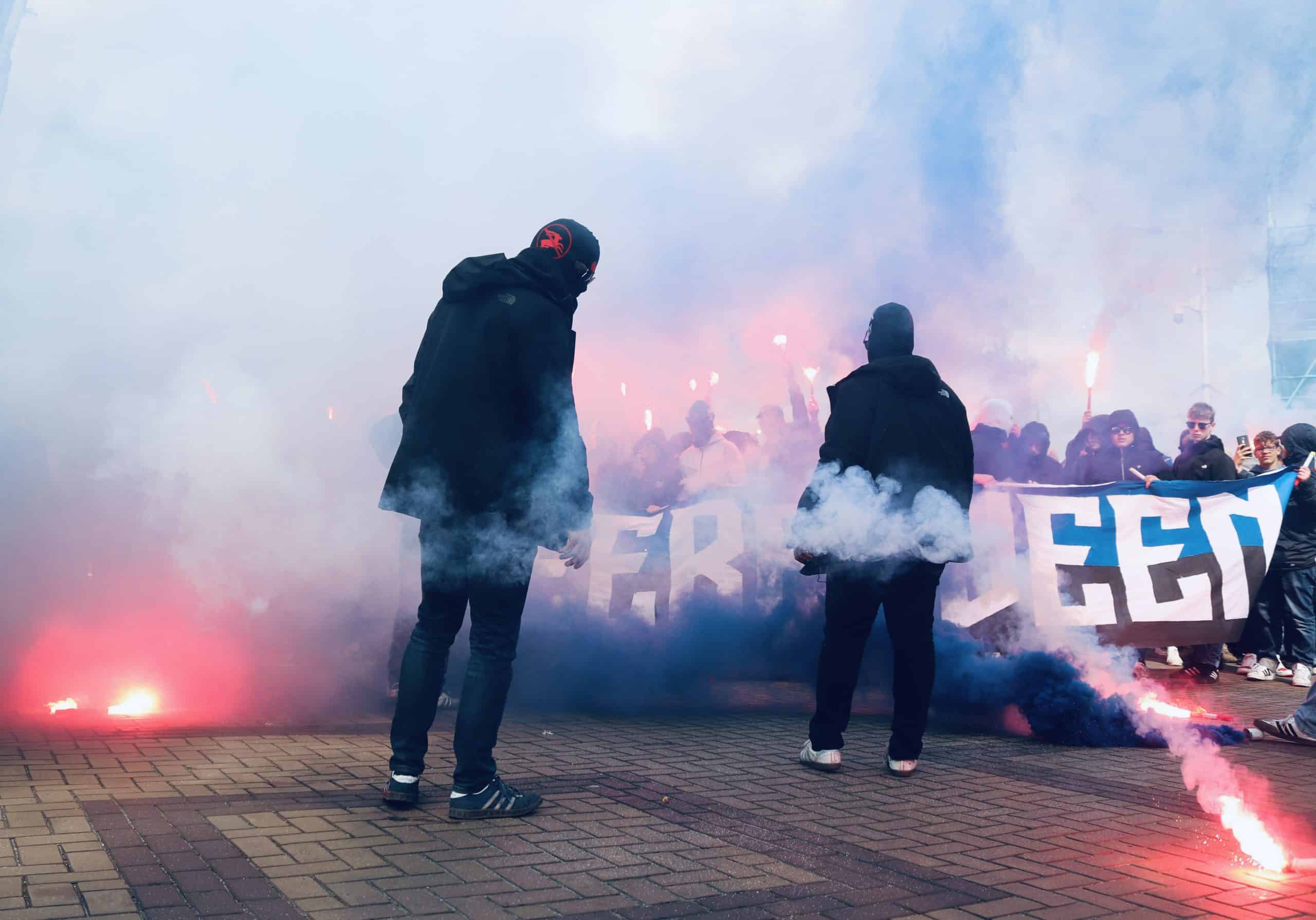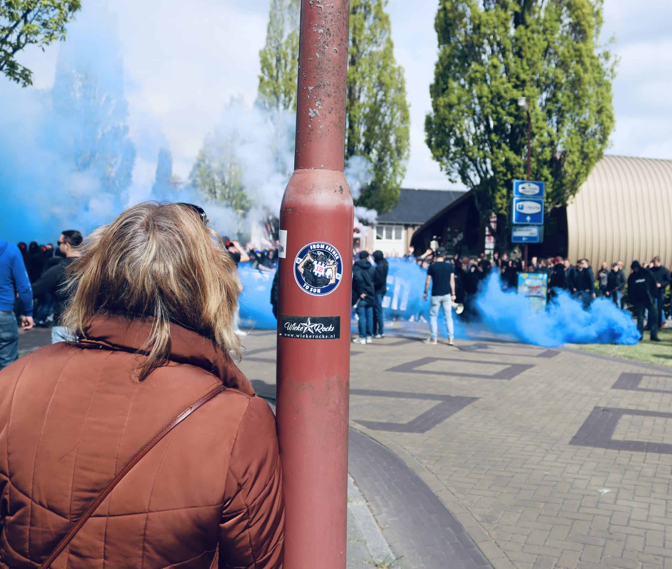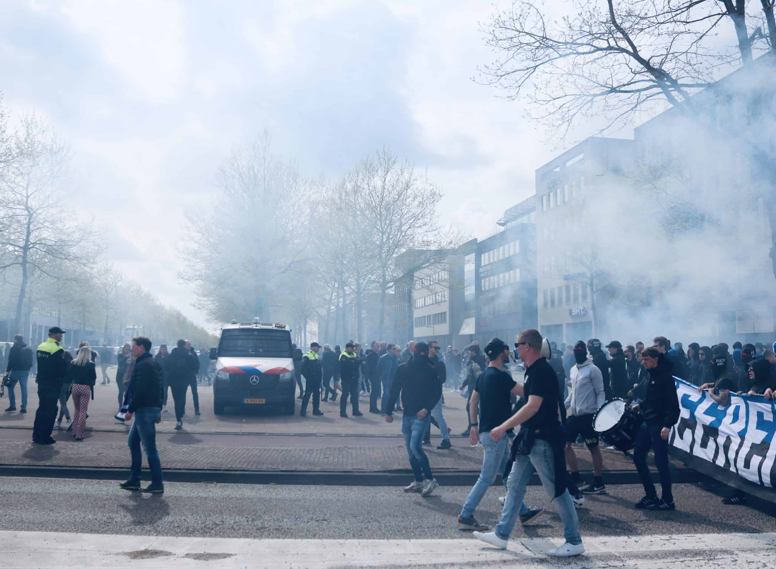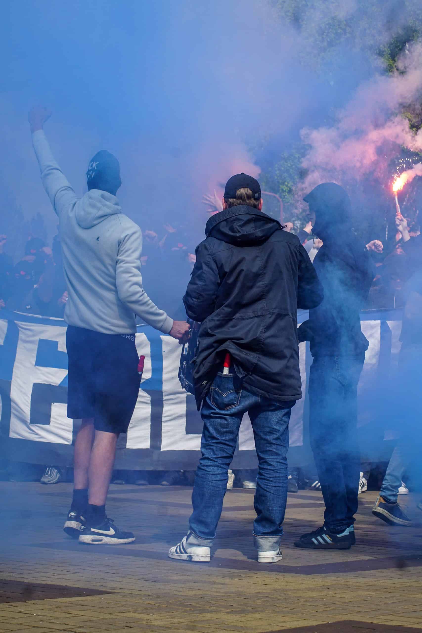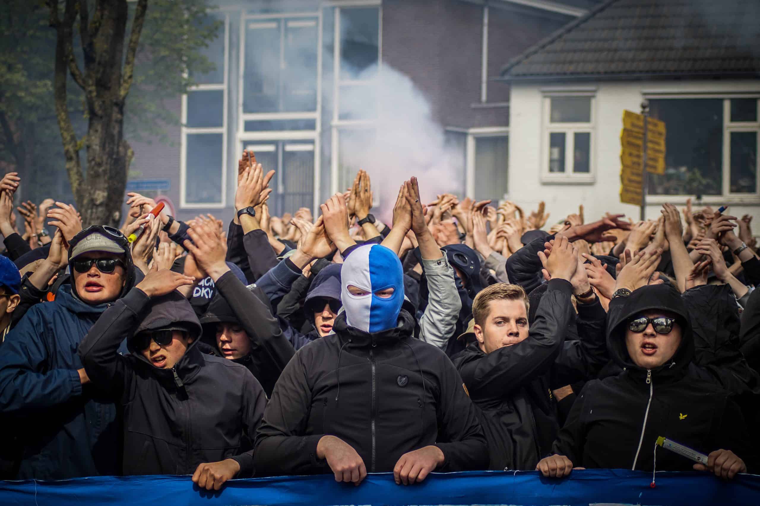 Dan is het tijd voor de hele stoet om in beweging te komen en de wandeling van, op papier, ongeveer een kwartiertje richting het Abe Lenstra stadion af te leggen. Natuurlijk duurt de corteo een heel stuk langer. Op meerdere momenten wordt er halt gehouden voor nog een massale pyroshow of wat anticambuur-liedjes. Het regent bijna de hele tijd as. De hele partij van honderden mensen wordt opgezweept door een capo met megafoon en een grote trommel. Op balkonnetjes en vanuit voordeuren kijken de inwoners van Heerenveen toe hoe de anders zo rustige stad op zijn kop wordt gezet vanwege de naderende derbyday.