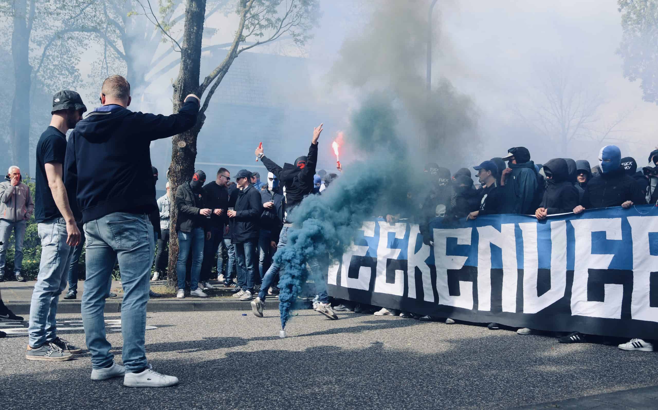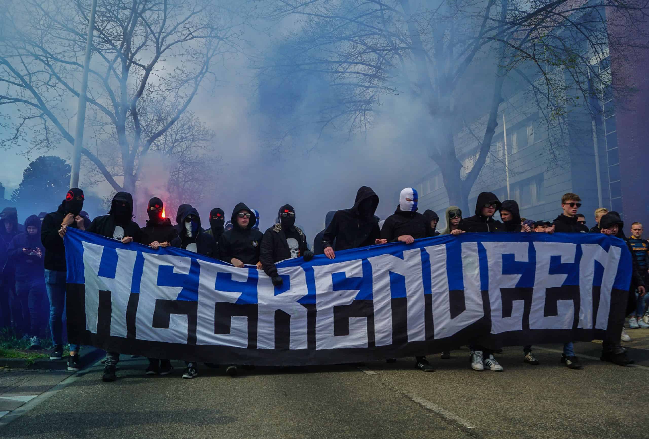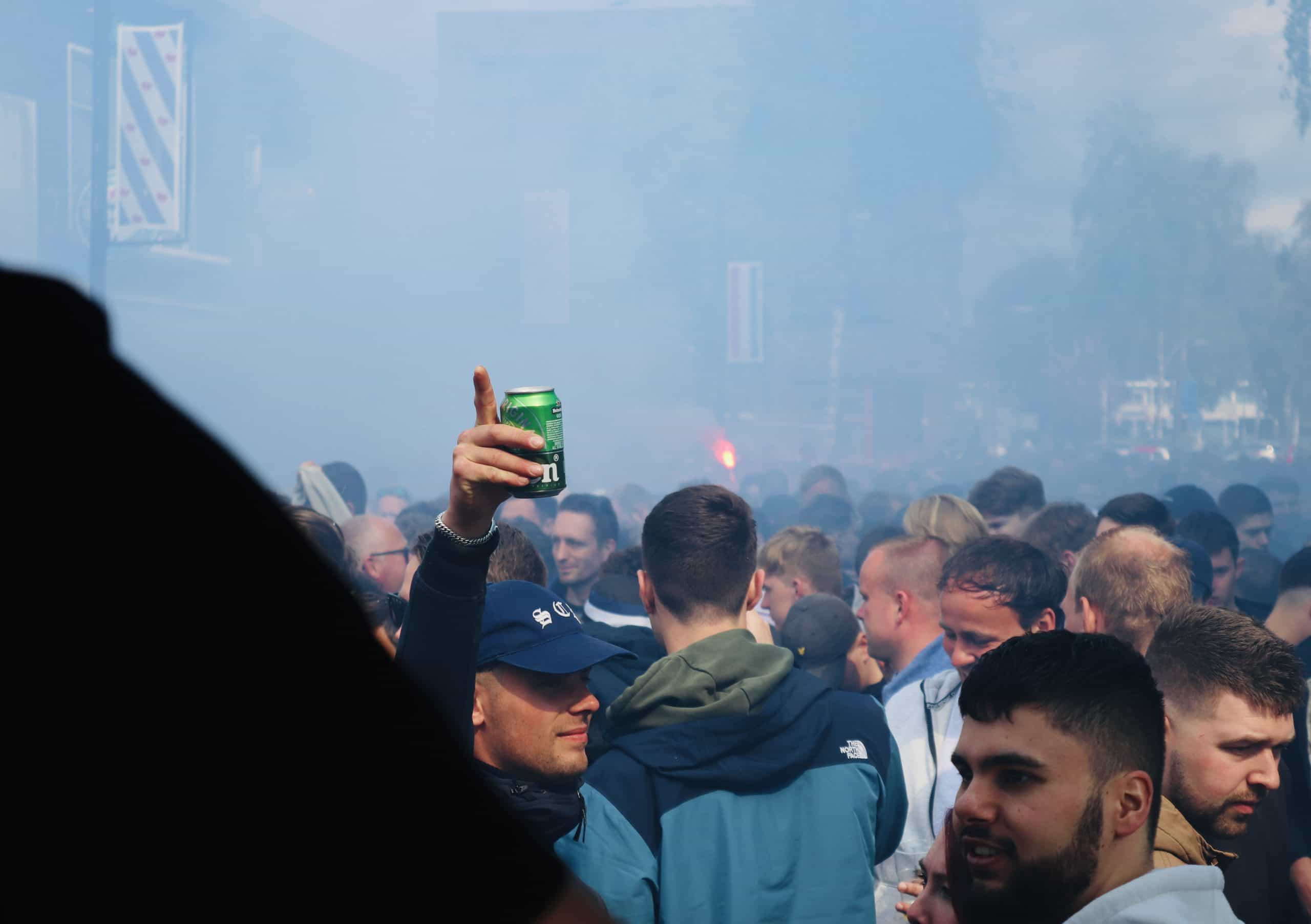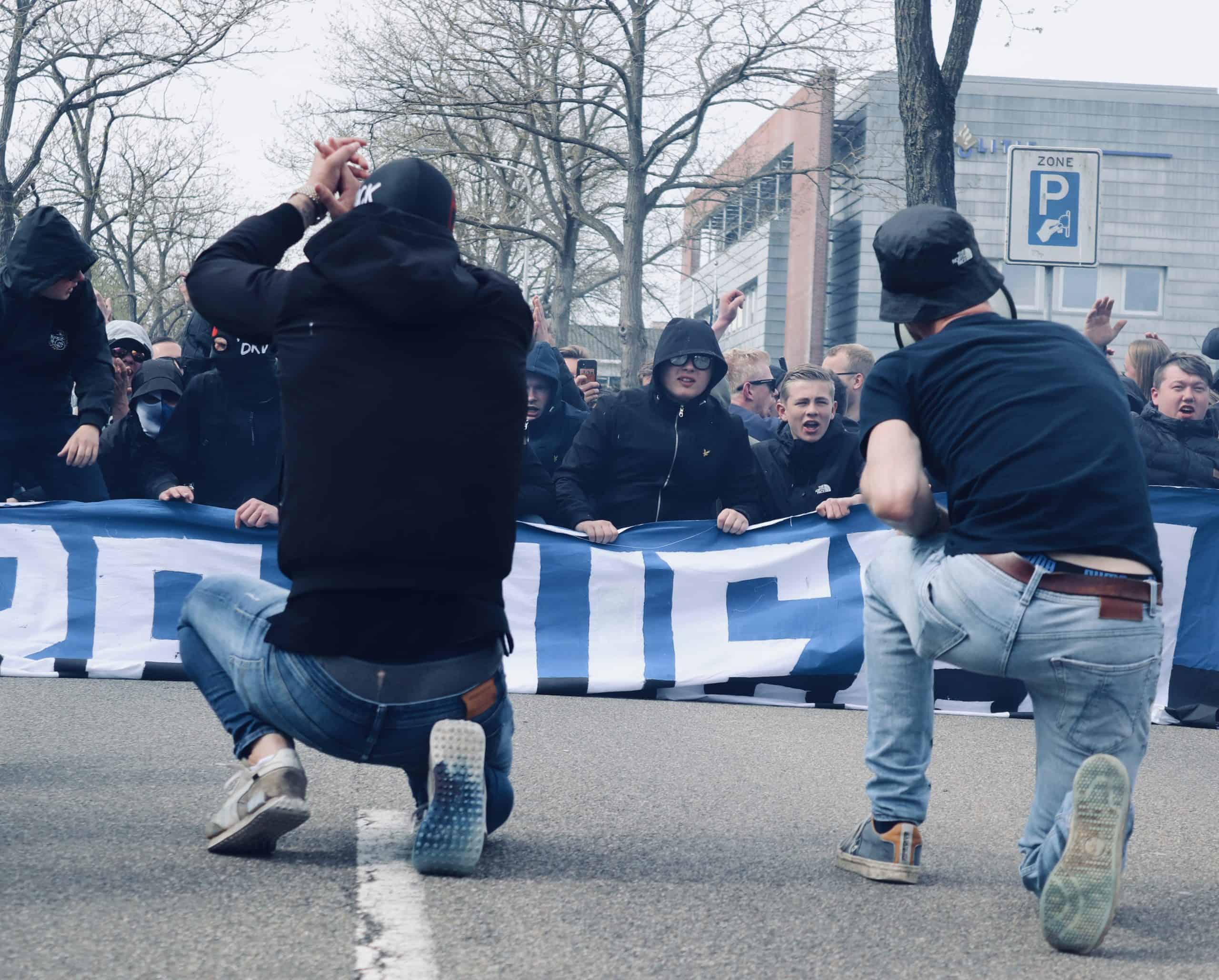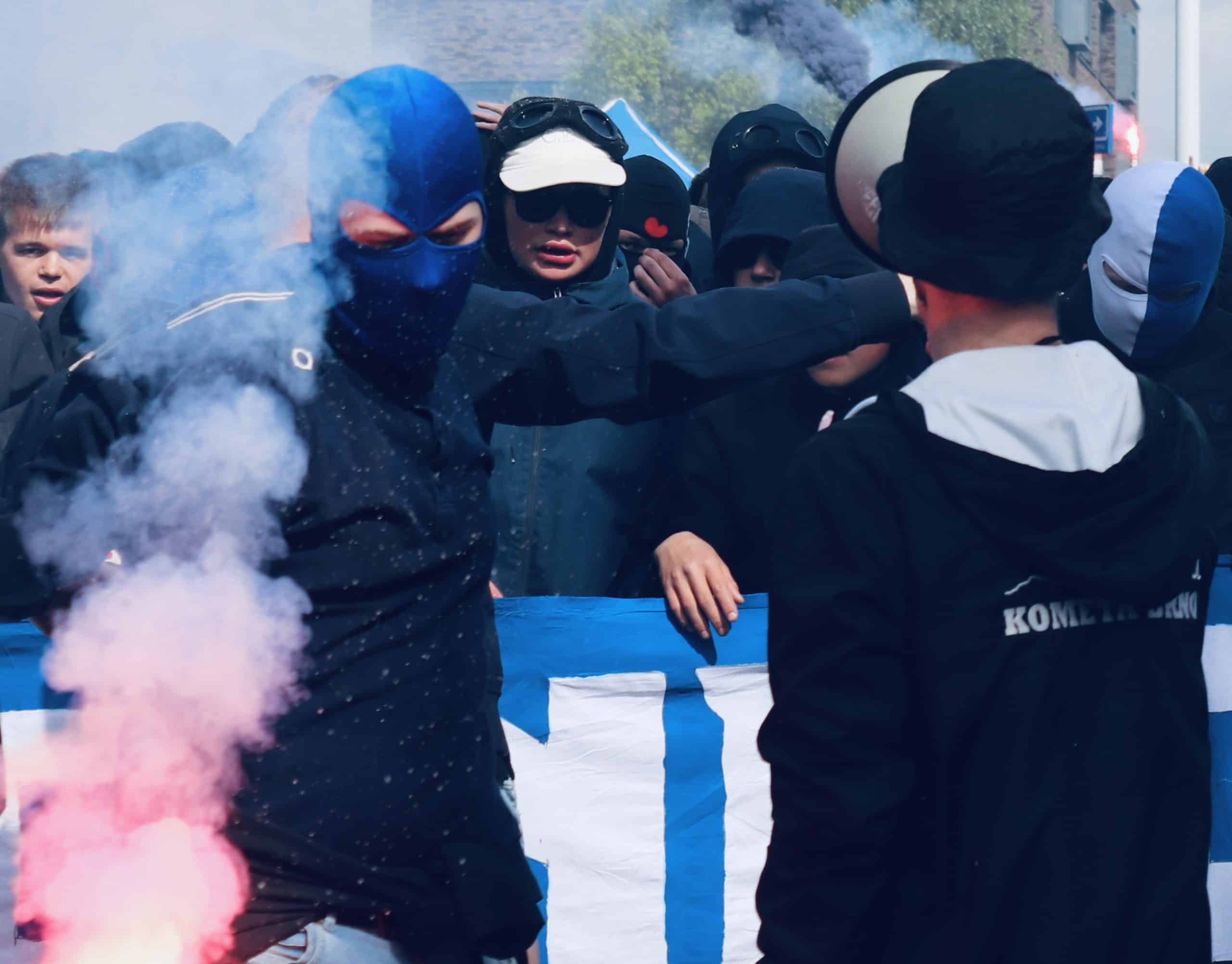 Dan is het tijd voor de hele stoet om in beweging te komen en de wandeling van, op papier, ongeveer een kwartiertje richting het Abe Lenstra stadion af te leggen. Natuurlijk duurt de corteo een heel stuk langer. Op meerdere momenten wordt er halt gehouden voor nog een massale pyroshow of wat anticambuur-liedjes. Het regent bijna de hele tijd as. De hele partij van honderden mensen wordt opgezweept door een capo met megafoon en een grote trommel. Op balkonnetjes en vanuit voordeuren kijken de inwoners van Heerenveen toe hoe de anders zo rustige stad op zijn kop wordt gezet vanwege de naderende derbyday.