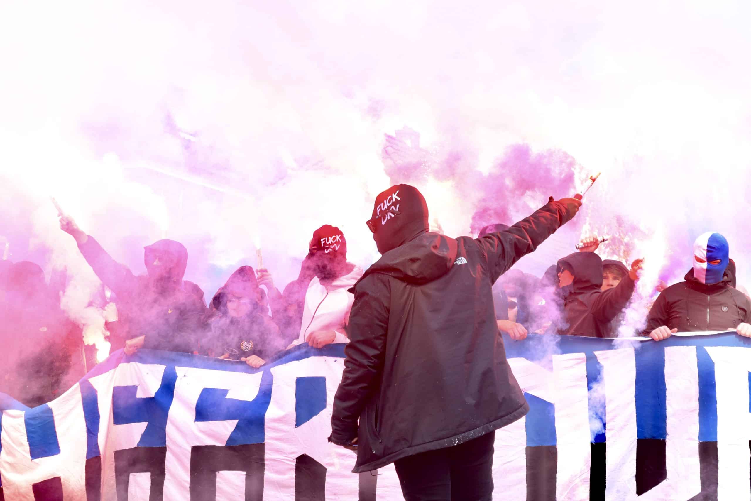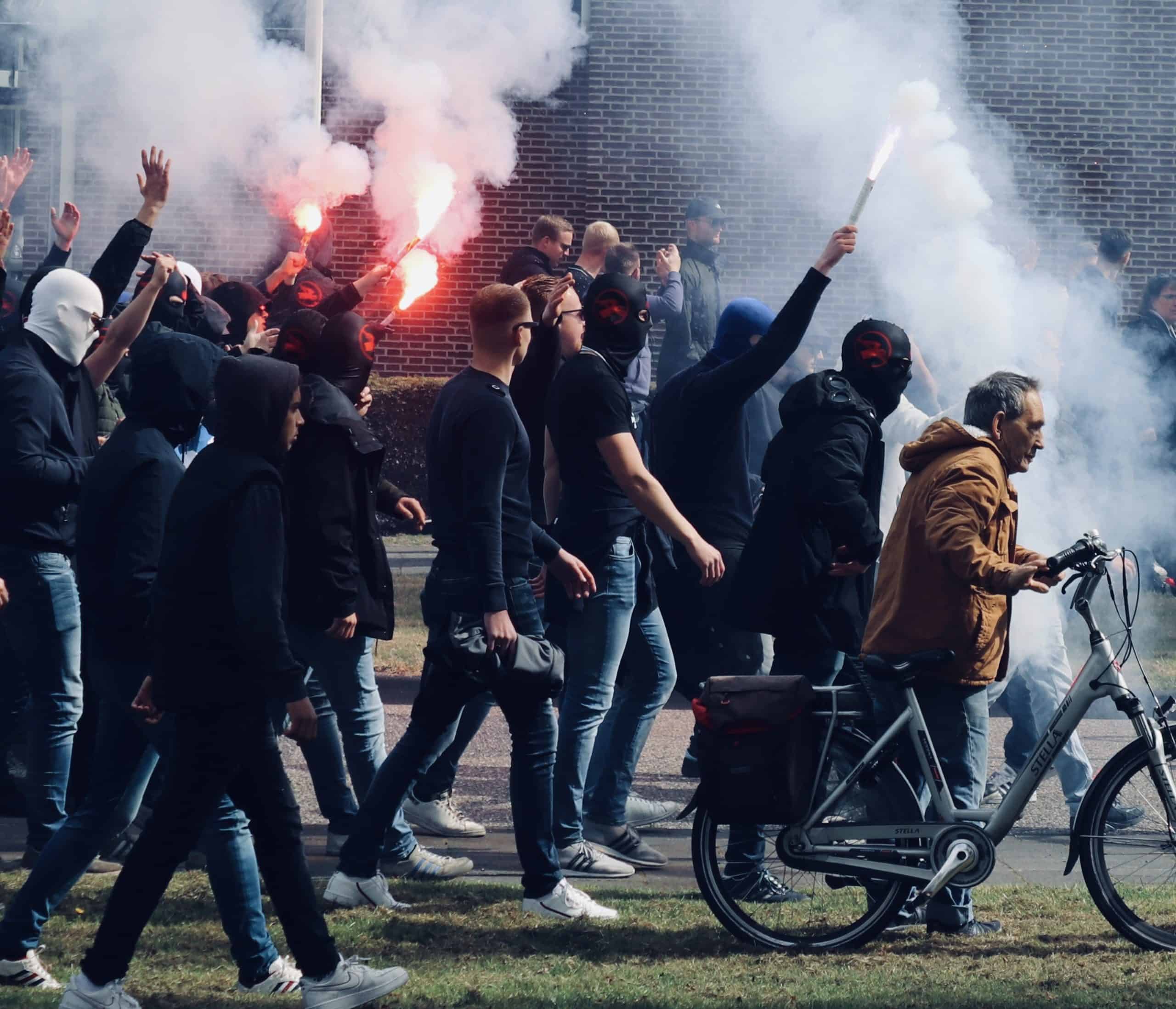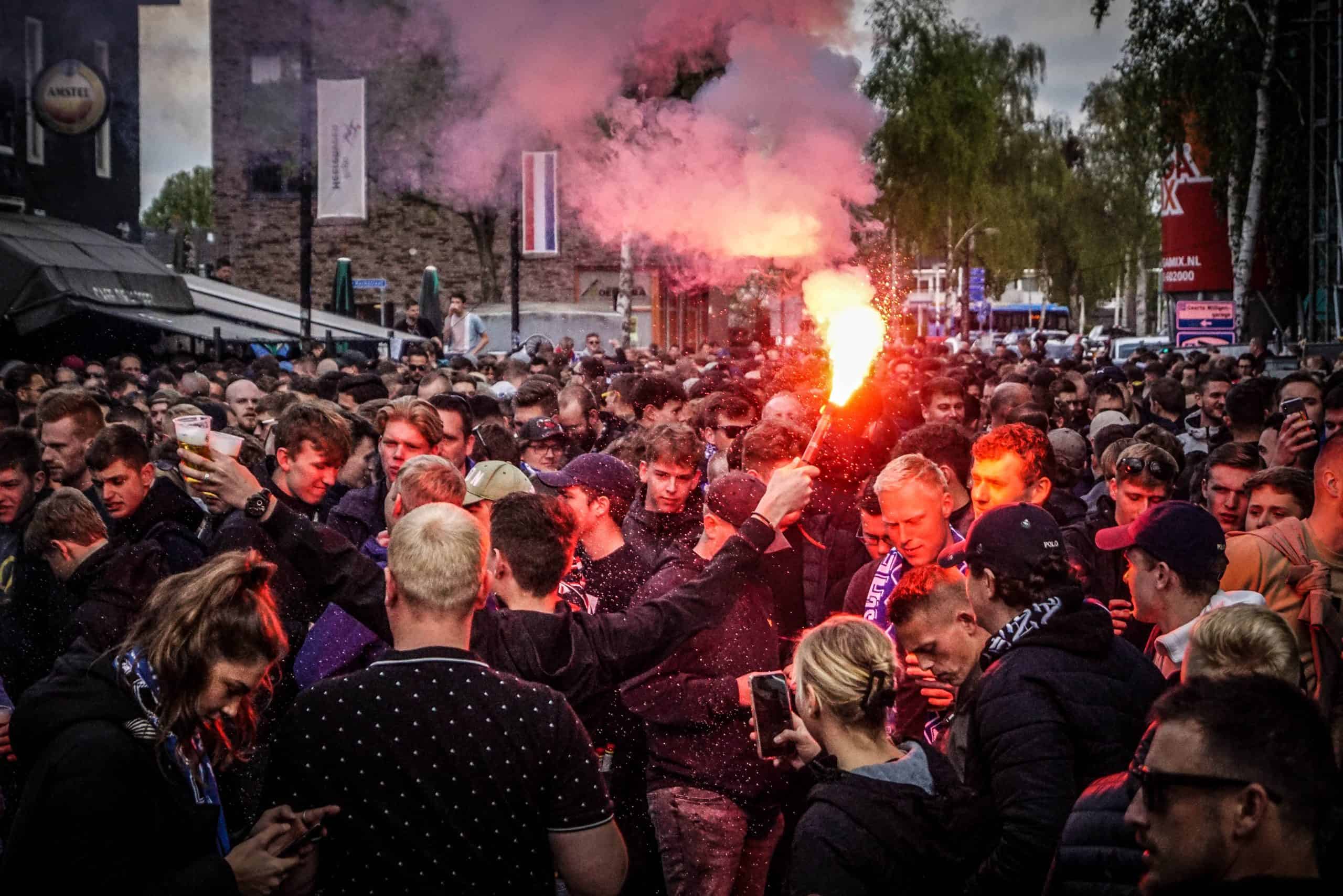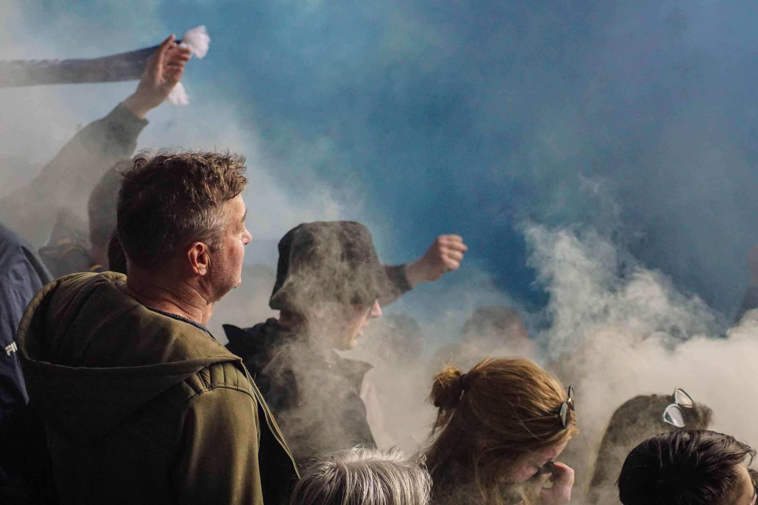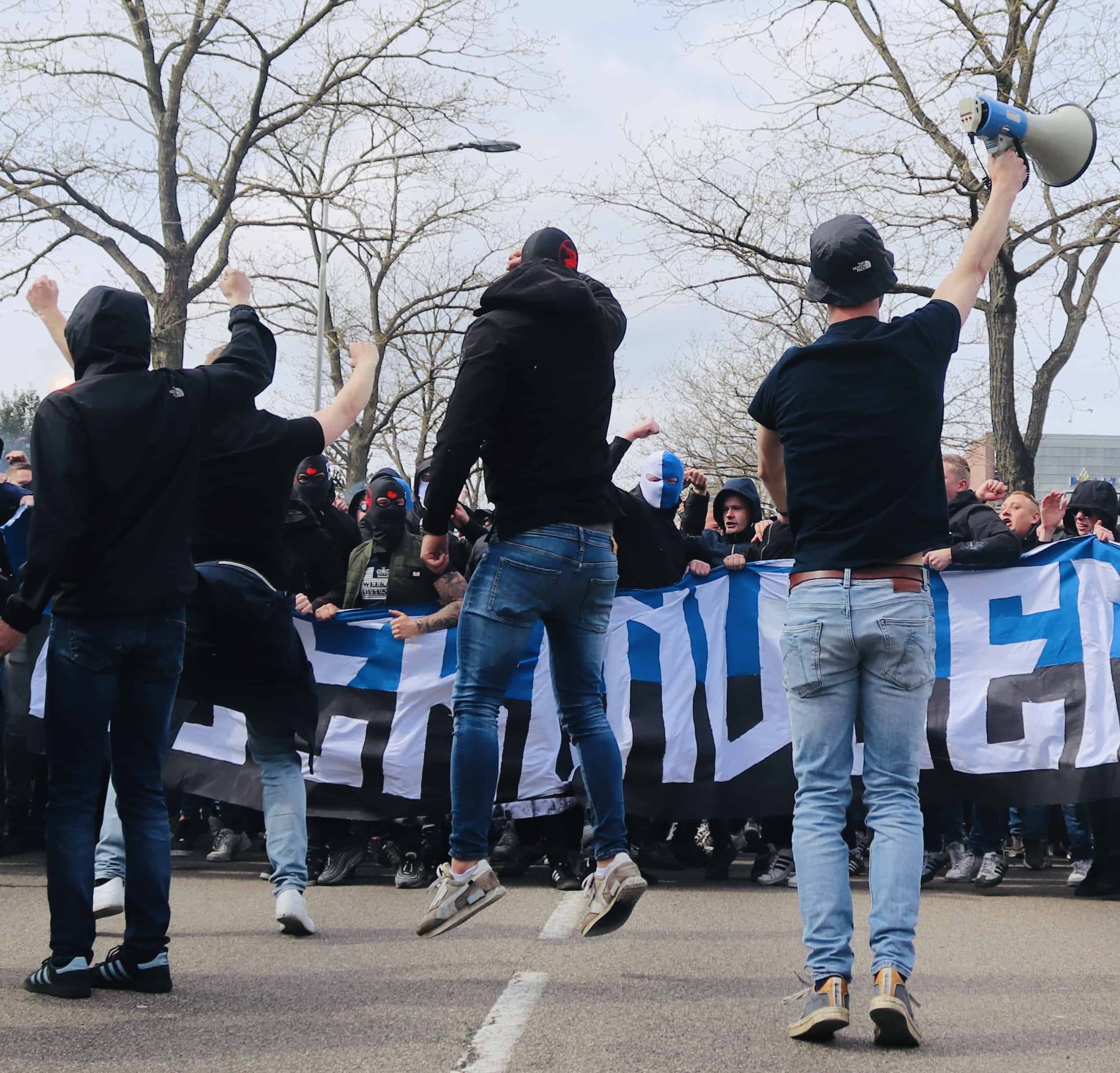 Dan is het tijd voor de hele stoet om in beweging te komen en de wandeling van, op papier, ongeveer een kwartiertje richting het Abe Lenstra stadion af te leggen. Natuurlijk duurt de corteo een heel stuk langer. Op meerdere momenten wordt er halt gehouden voor nog een massale pyroshow of wat anticambuur-liedjes. Het regent bijna de hele tijd as. De hele partij van honderden mensen wordt opgezweept door een capo met megafoon en een grote trommel. Op balkonnetjes en vanuit voordeuren kijken de inwoners van Heerenveen toe hoe de anders zo rustige stad op zijn kop wordt gezet vanwege de naderende derbyday.
