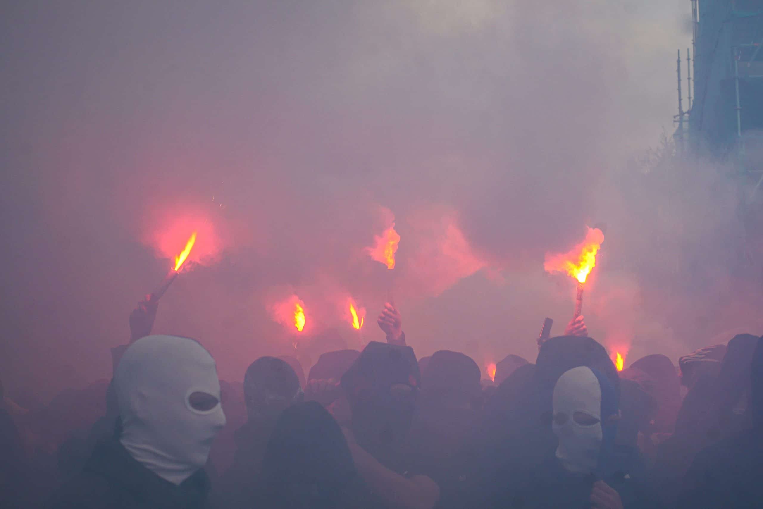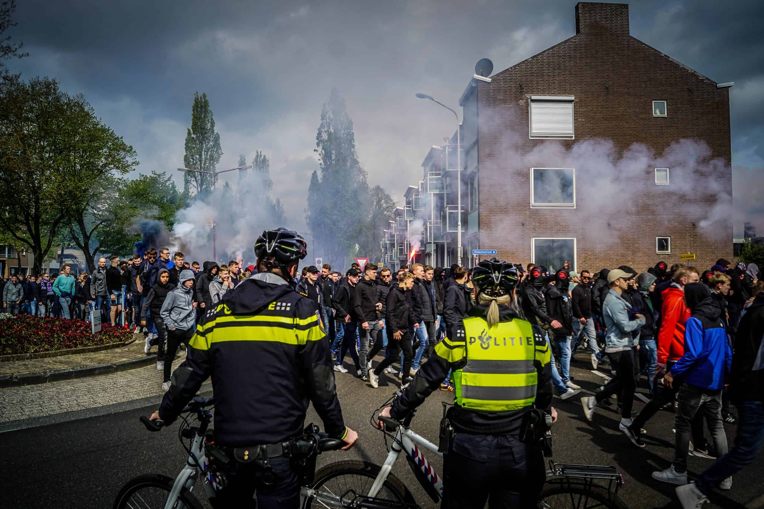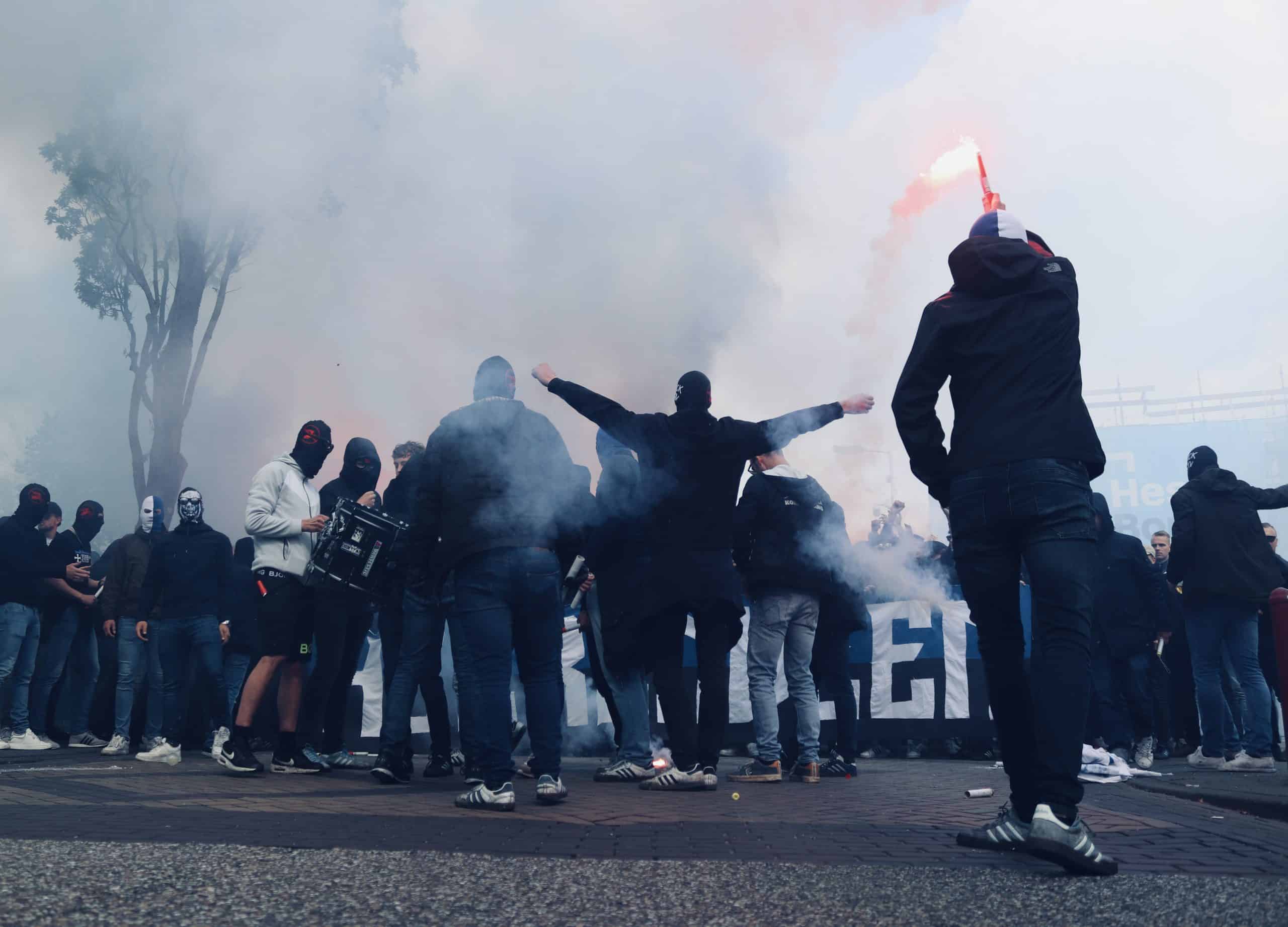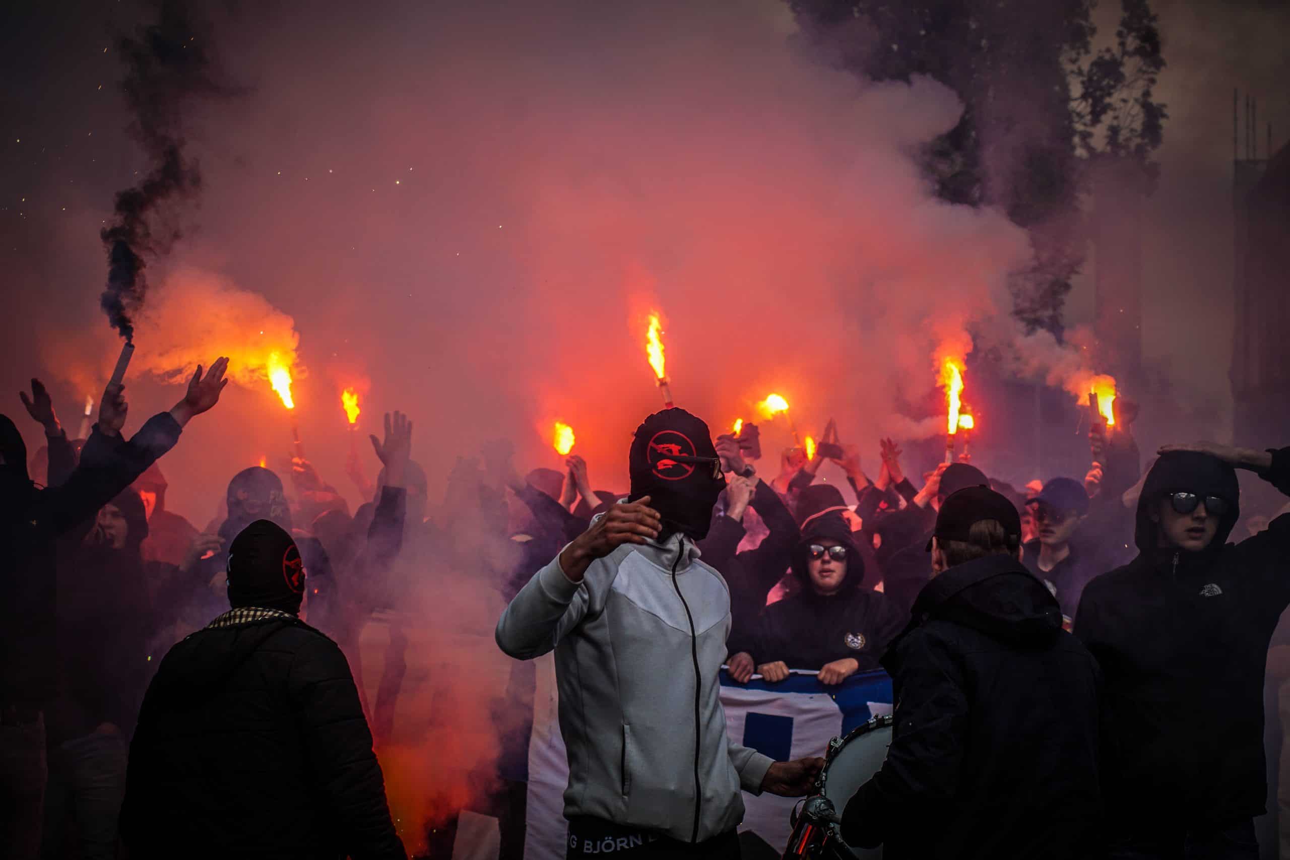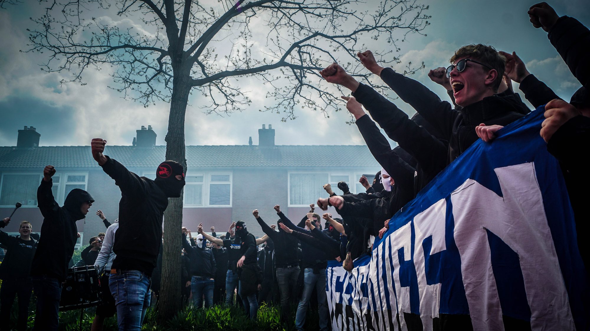 Dan is het tijd voor de hele stoet om in beweging te komen en de wandeling van, op papier, ongeveer een kwartiertje richting het Abe Lenstra stadion af te leggen. Natuurlijk duurt de corteo een heel stuk langer. Op meerdere momenten wordt er halt gehouden voor nog een massale pyroshow of wat anticambuur-liedjes. Het regent bijna de hele tijd as. De hele partij van honderden mensen wordt opgezweept door een capo met megafoon en een grote trommel. Op balkonnetjes en vanuit voordeuren kijken de inwoners van Heerenveen toe hoe de anders zo rustige stad op zijn kop wordt gezet vanwege de naderende derbyday.