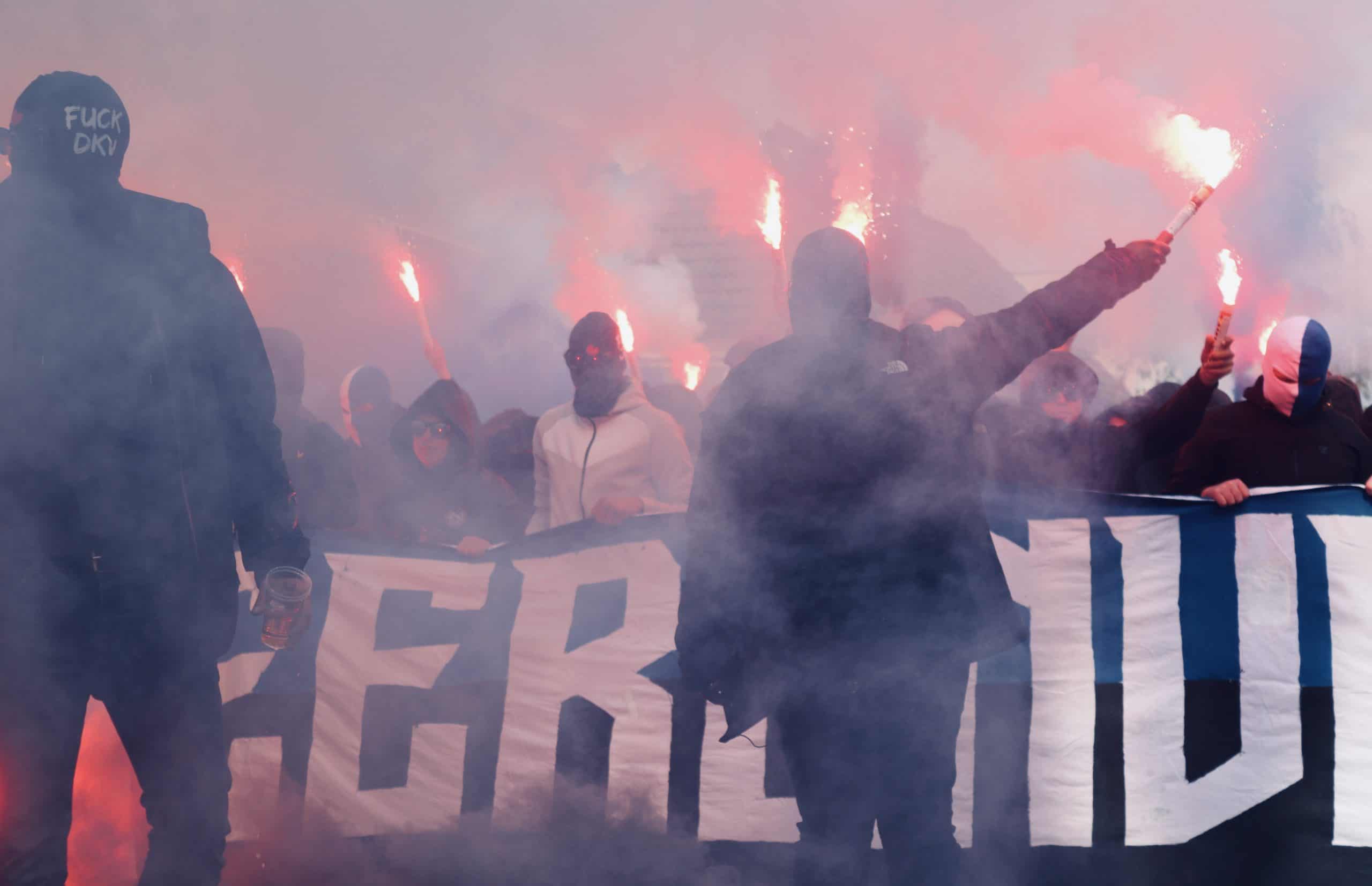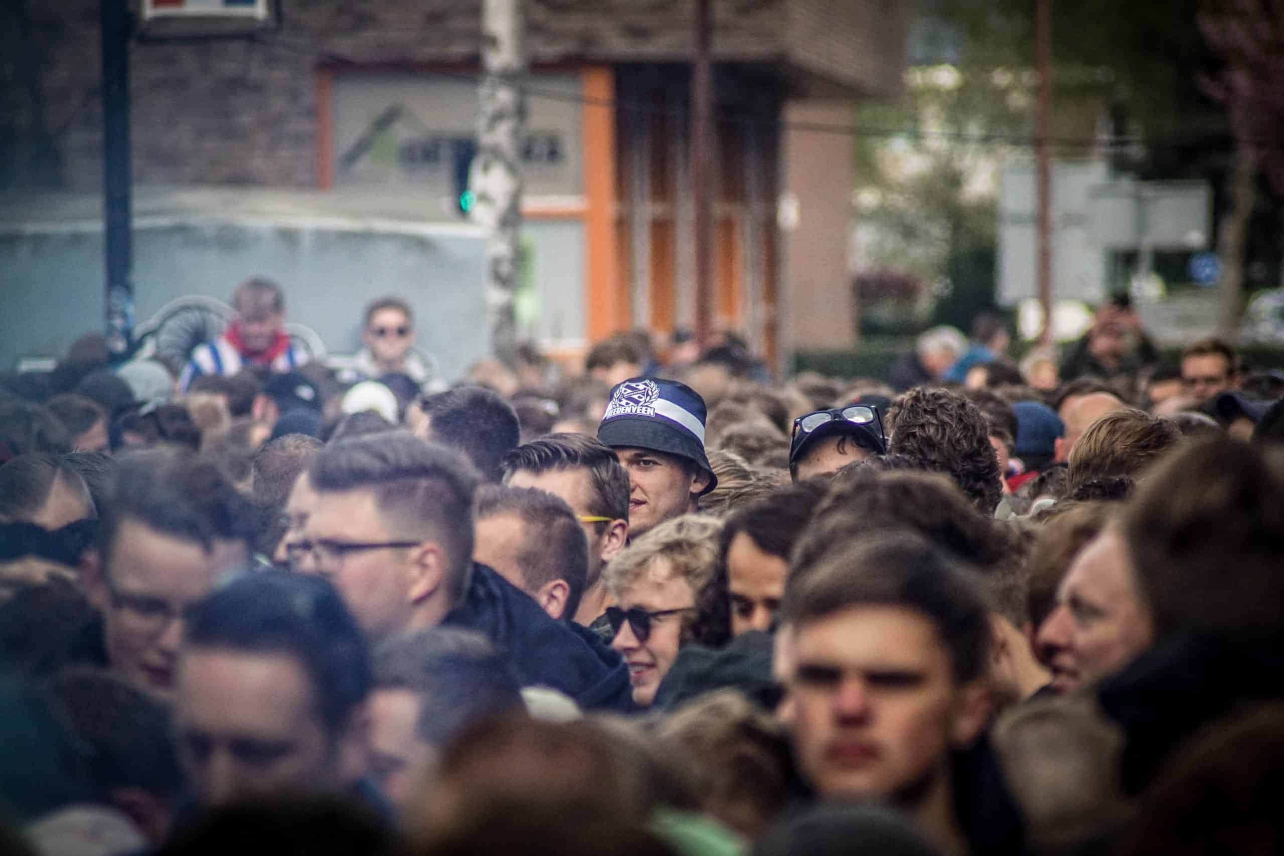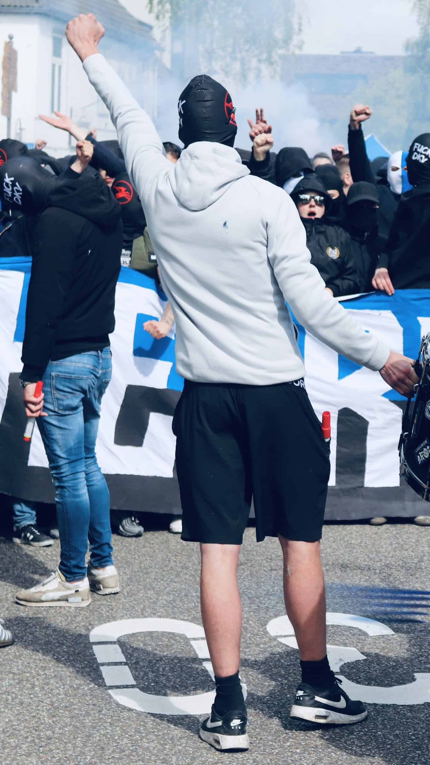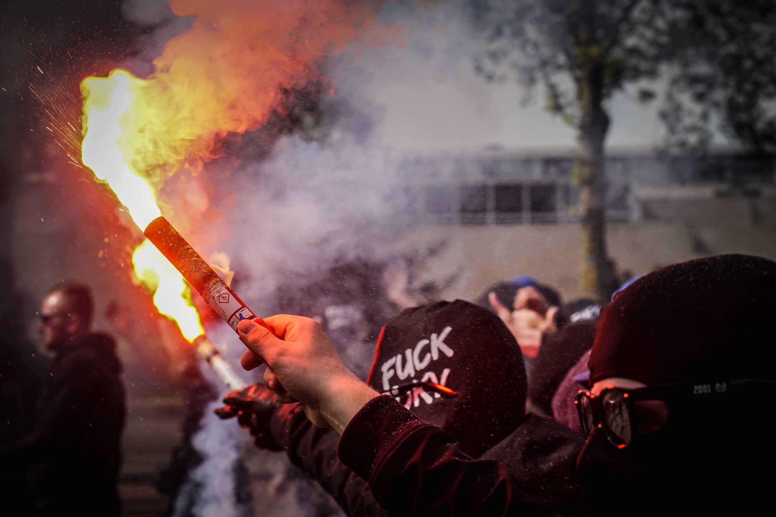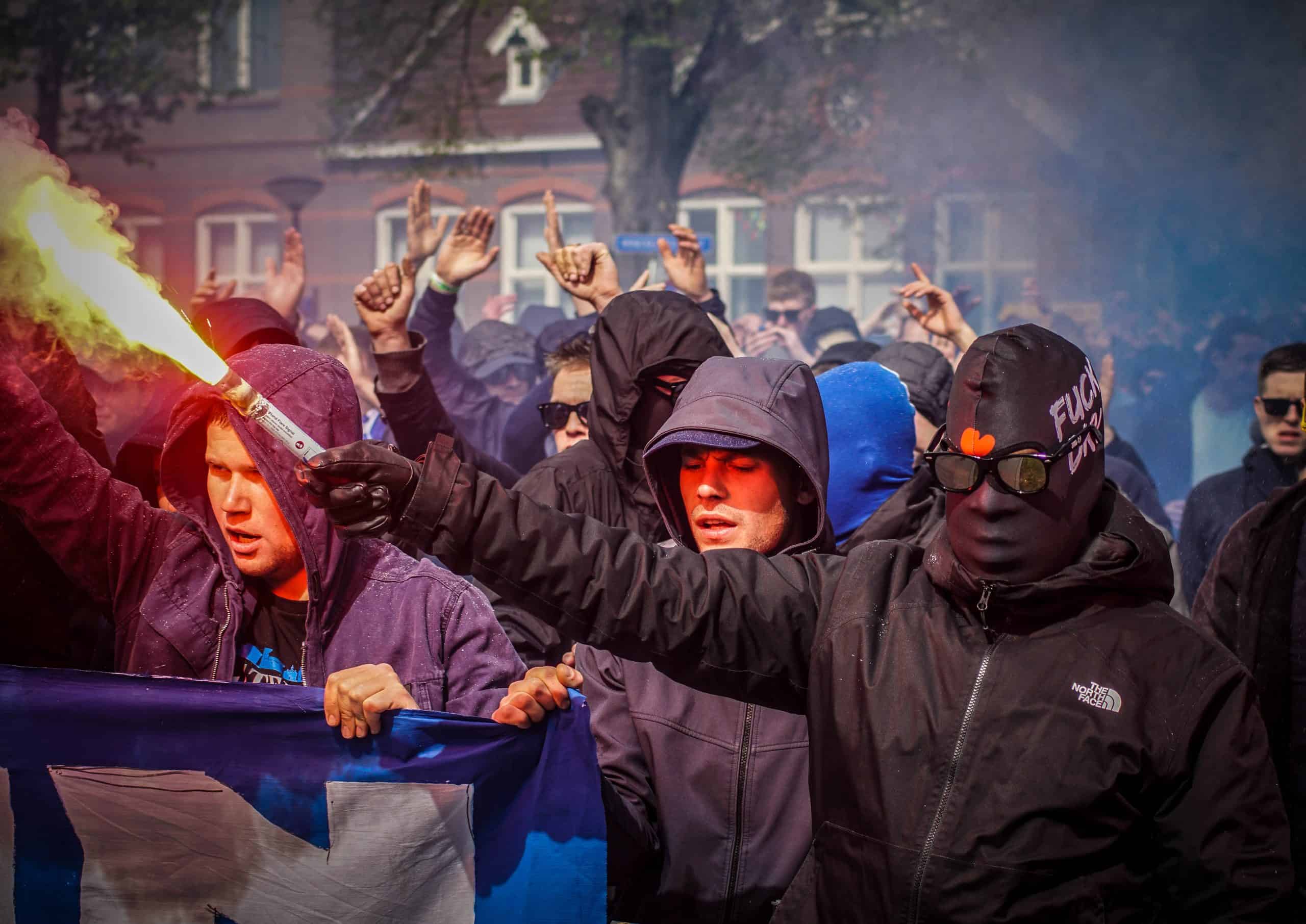 Dan is het tijd voor de hele stoet om in beweging te komen en de wandeling van, op papier, ongeveer een kwartiertje richting het Abe Lenstra stadion af te leggen. Natuurlijk duurt de corteo een heel stuk langer. Op meerdere momenten wordt er halt gehouden voor nog een massale pyroshow of wat anticambuur-liedjes. Het regent bijna de hele tijd as. De hele partij van honderden mensen wordt opgezweept door een capo met megafoon en een grote trommel. Op balkonnetjes en vanuit voordeuren kijken de inwoners van Heerenveen toe hoe de anders zo rustige stad op zijn kop wordt gezet vanwege de naderende derbyday.