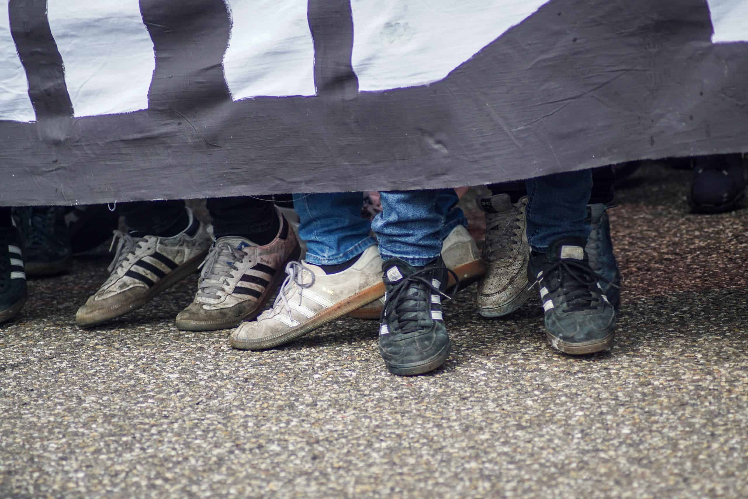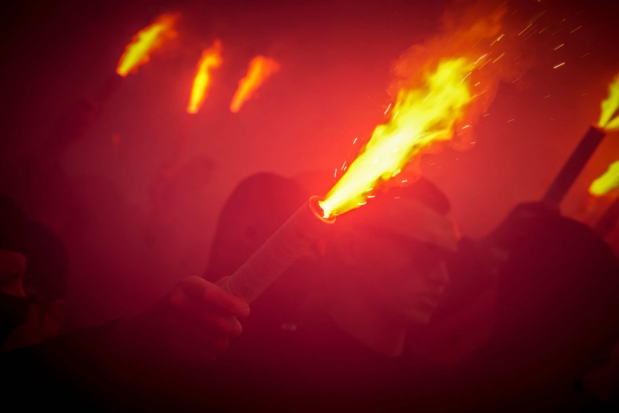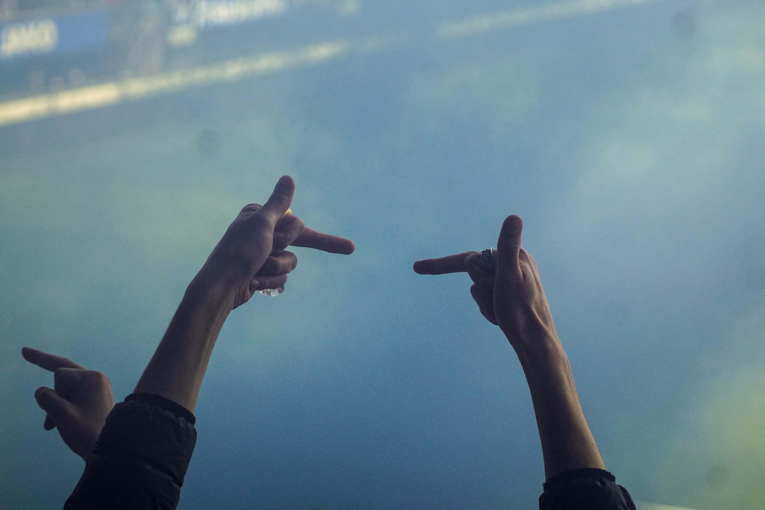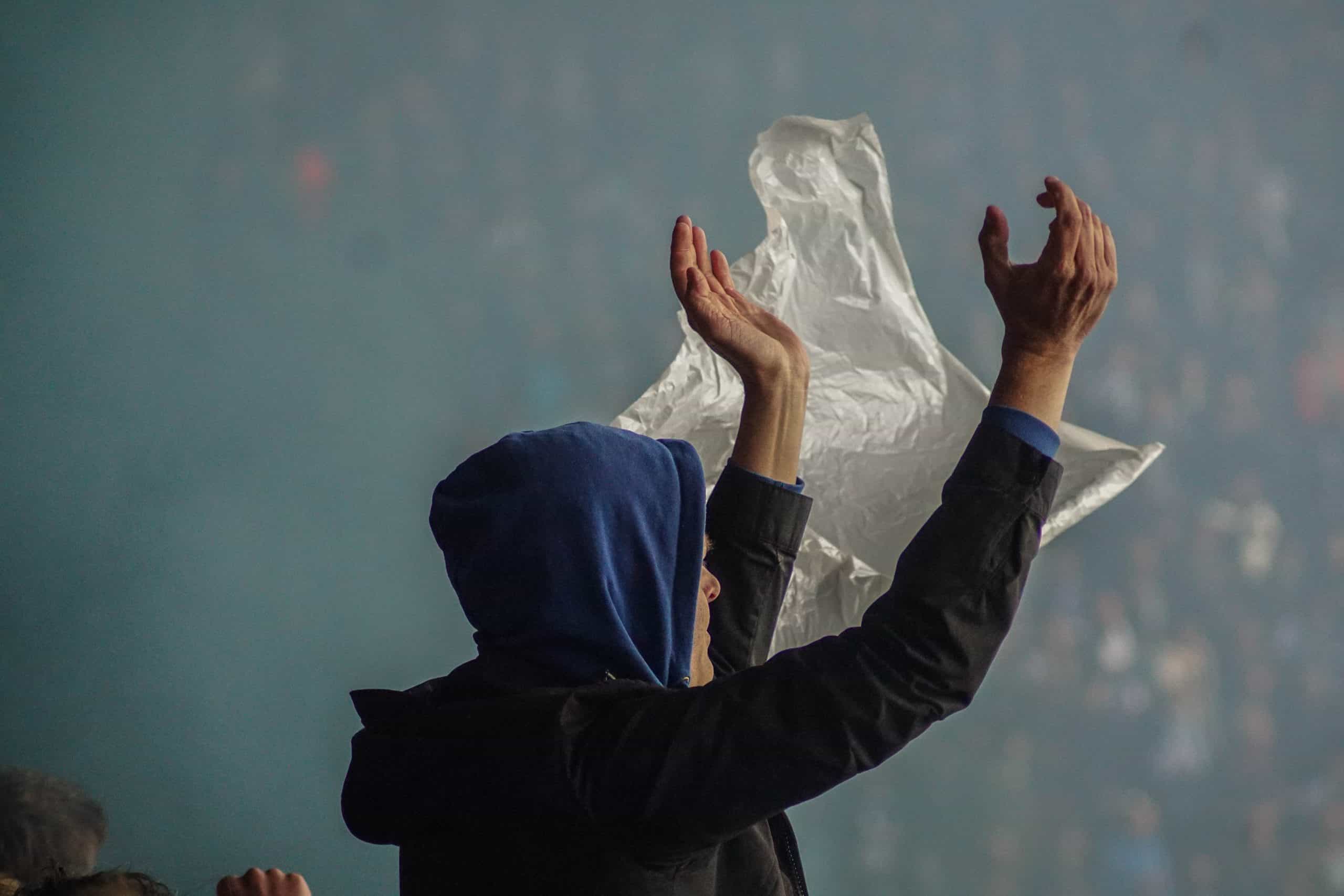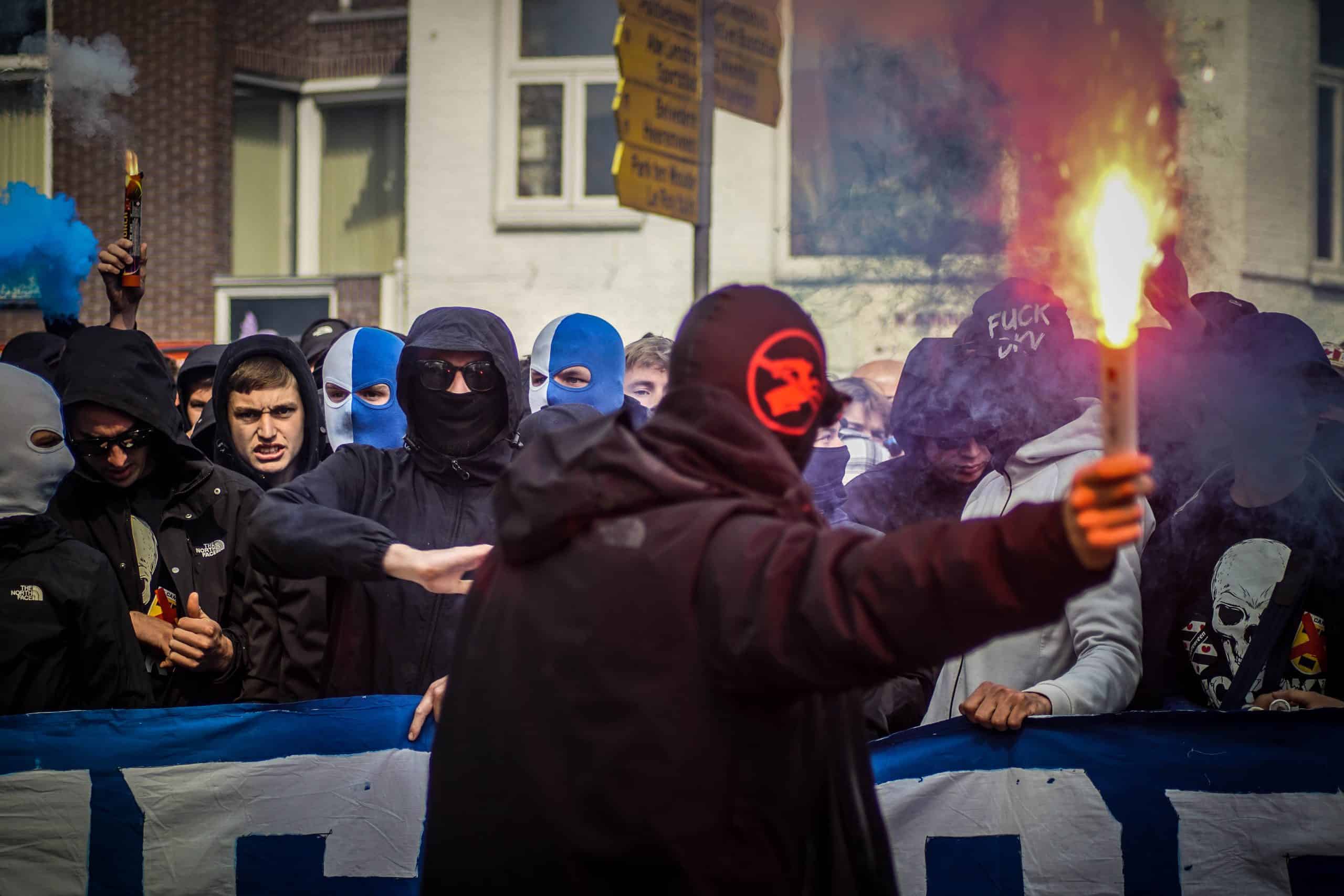Dan is het tijd voor de hele stoet om in beweging te komen en de wandeling van, op papier, ongeveer een kwartiertje richting het Abe Lenstra stadion af te leggen. Natuurlijk duurt de corteo een heel stuk langer. Op meerdere momenten wordt er halt gehouden voor nog een massale pyroshow of wat anticambuur-liedjes. Het regent bijna de hele tijd as. De hele partij van honderden mensen wordt opgezweept door een capo met megafoon en een grote trommel. Op balkonnetjes en vanuit voordeuren kijken de inwoners van Heerenveen toe hoe de anders zo rustige stad op zijn kop wordt gezet vanwege de naderende derbyday.