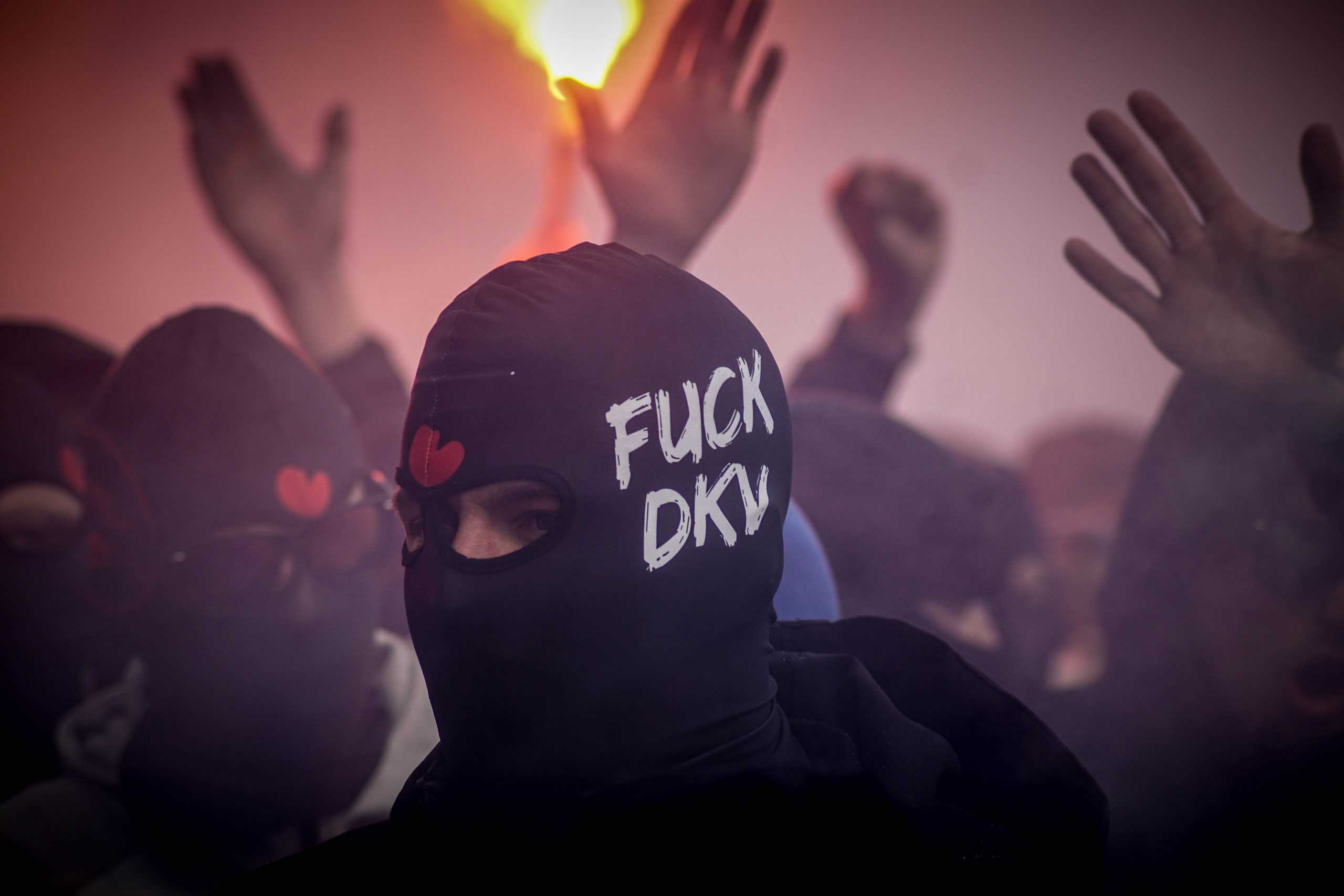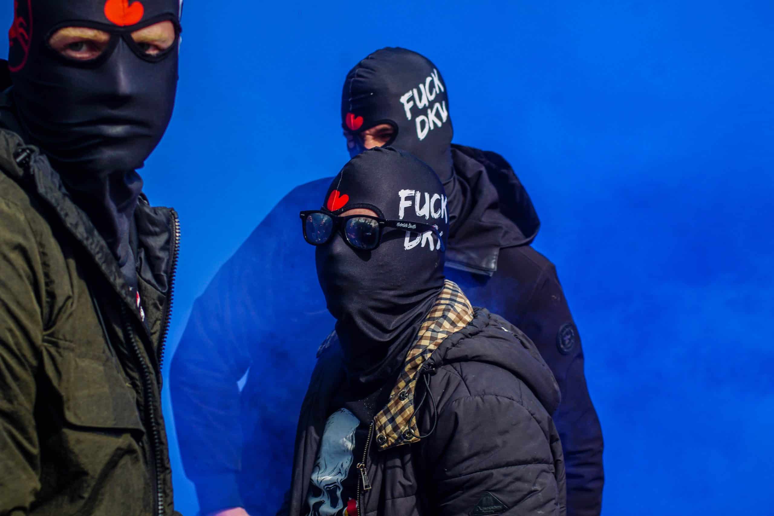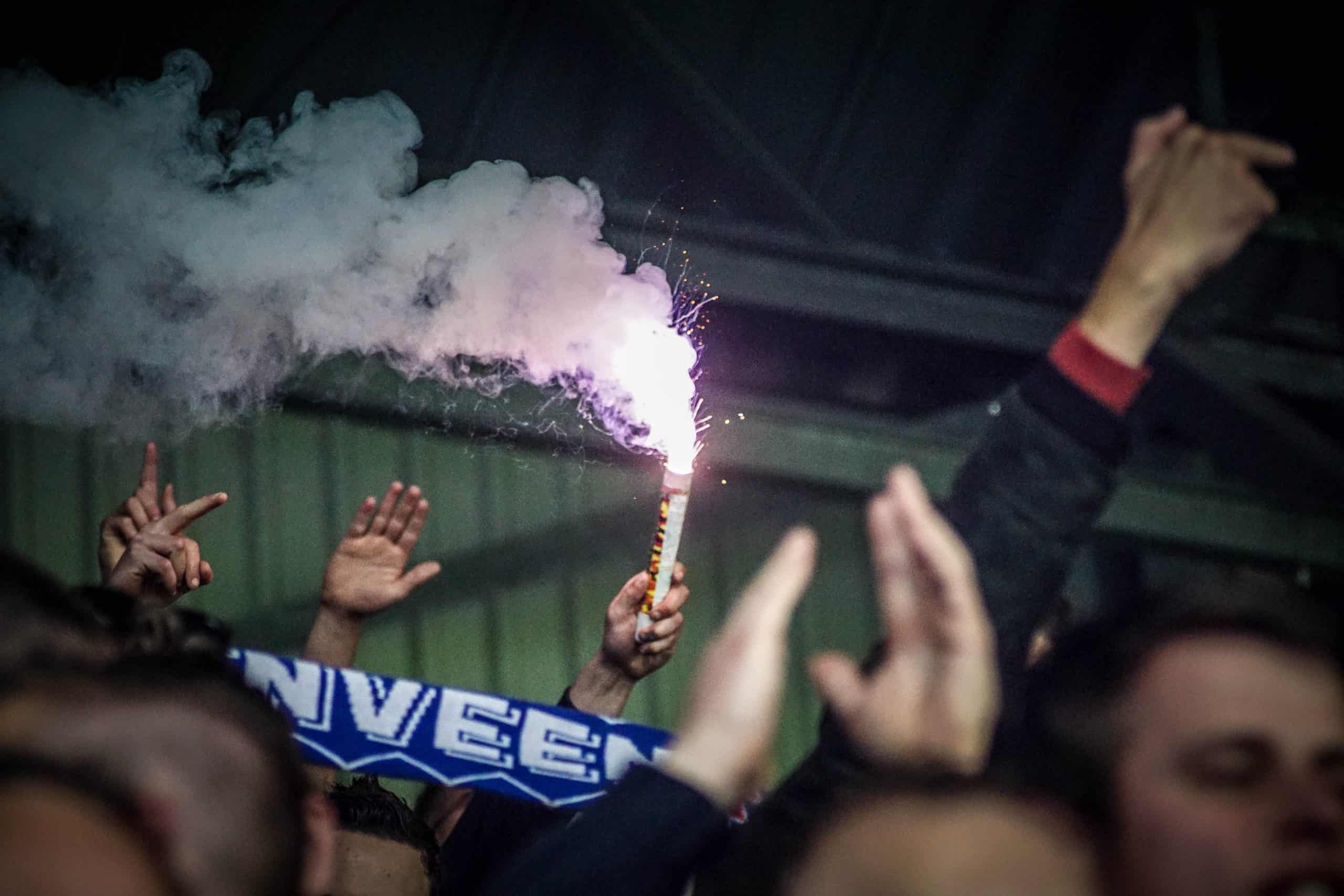 Rond elf uur worden de voorbereidingen in gang gezet voor de naderende corteo. Honderden supporters verzamelen zich rondom een blauw-zwart spandoek van Heerenveen. Overal verschijnen fakkels in de handen en worden bivakmutsen en balaclavas over de koppen getrokken. Speciaal voor de gelegenheid zijn er zelfs anti-Cambuur balaclavas gemaakt. Er staan tientallen supporters met gezichtsbescherming op die vervolgens een bult vuurwerk afsteken. In de ogen veel mensen is Heerenveen toch een beetje de ultieme “gezellige” club. Een soort pet-en-sjaalclub waar fanatieke support ver te zoeken is en vaak weinig gebeurt. Vorige keer tegen FC Groningen was het al beter dan verwacht, maar kijkend naar de vlammenzee zo voor ons is het helemaal duidelijk. Er is op supportersgebied een flinke ontwikkeling gaande in Heerenveen.