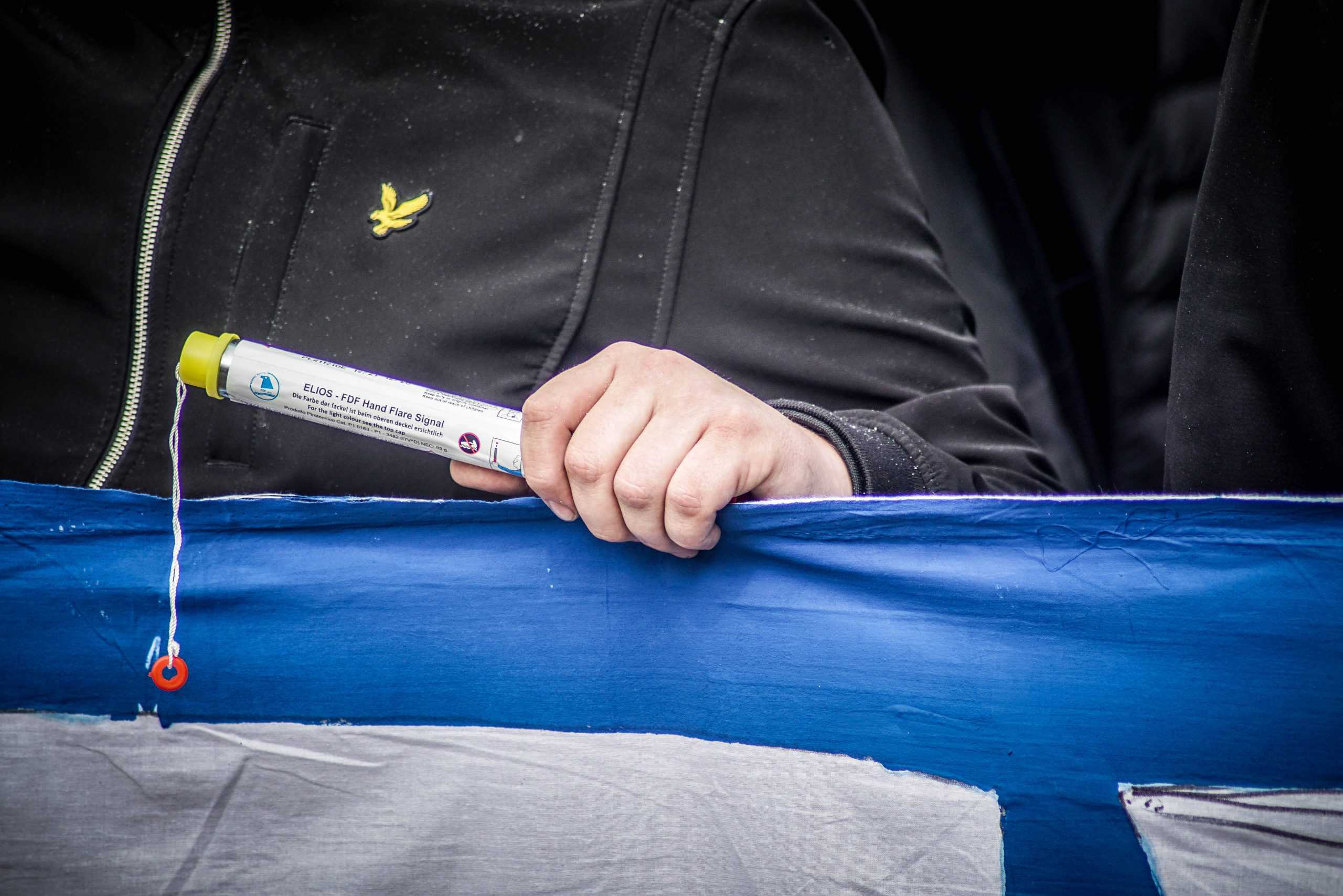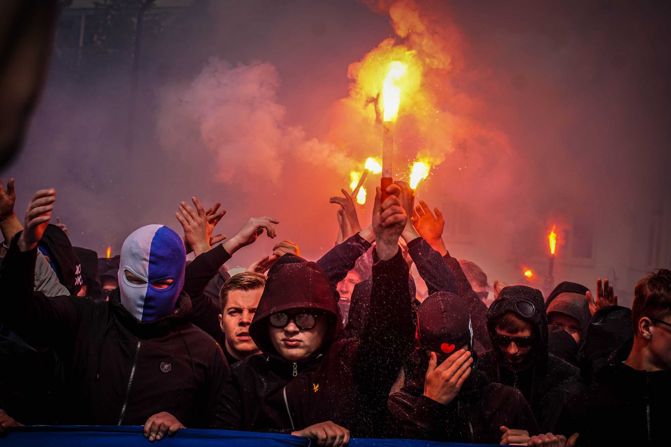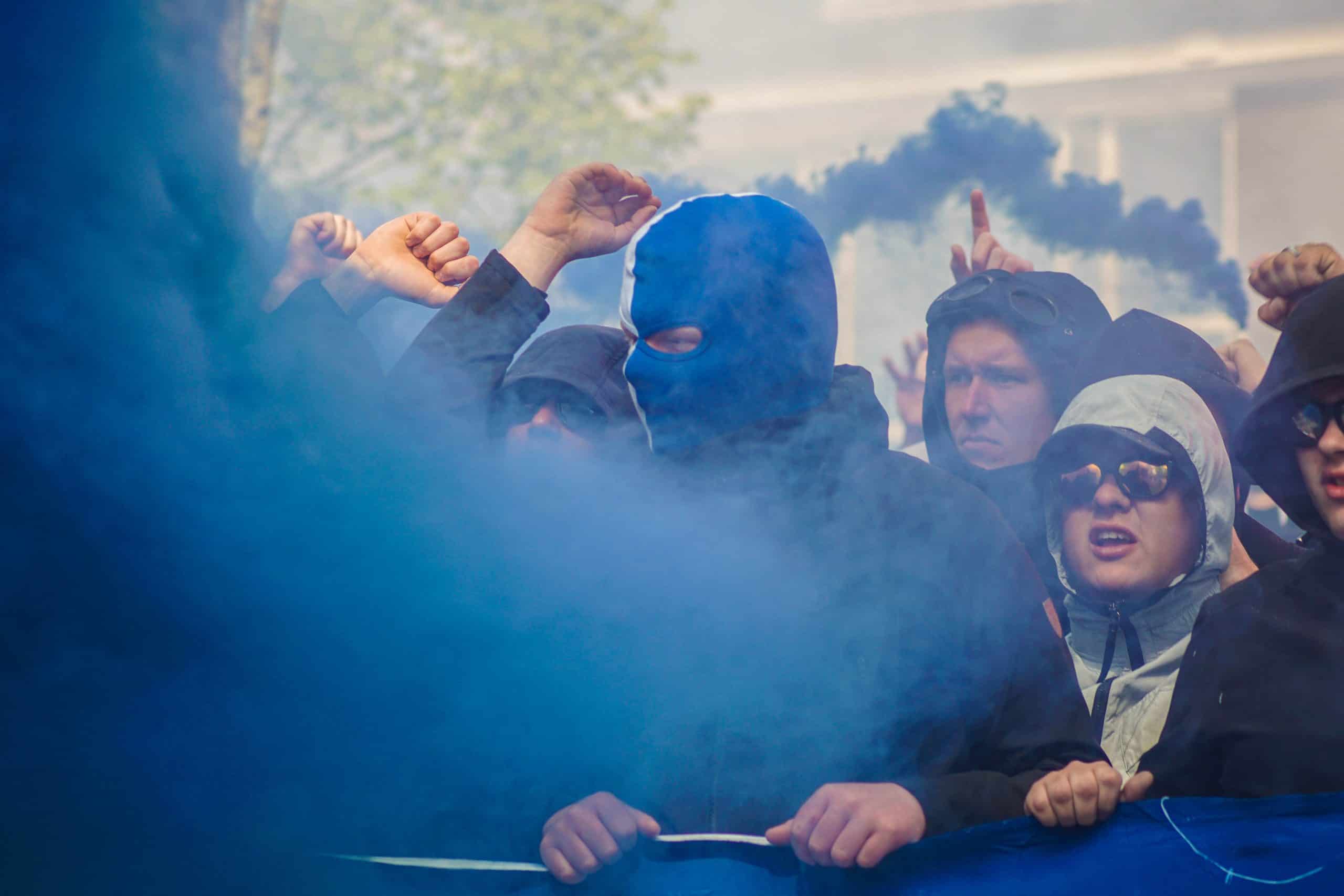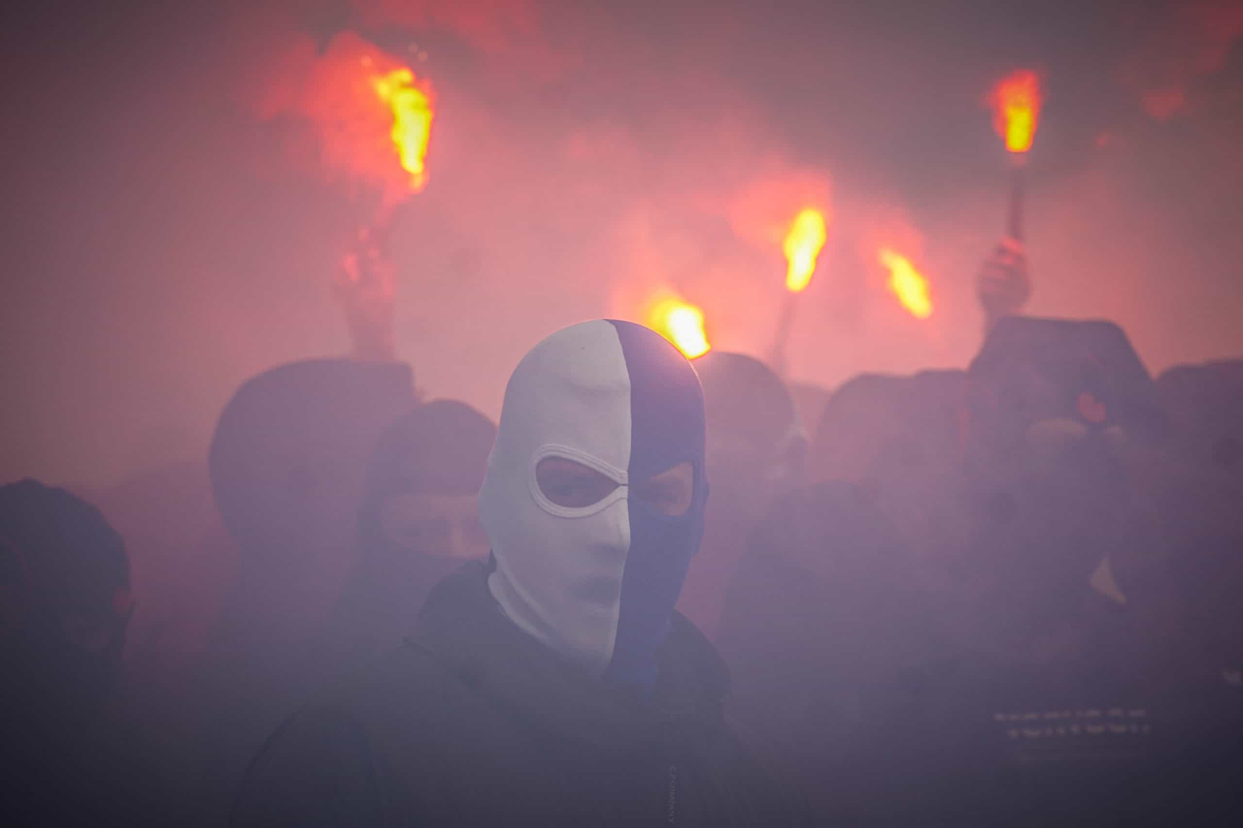 Rond elf uur worden de voorbereidingen in gang gezet voor de naderende corteo. Honderden supporters verzamelen zich rondom een blauw-zwart spandoek van Heerenveen. Overal verschijnen fakkels in de handen en worden bivakmutsen en balaclavas over de koppen getrokken. Speciaal voor de gelegenheid zijn er zelfs anti-Cambuur balaclavas gemaakt. Er staan tientallen supporters met gezichtsbescherming op die vervolgens een bult vuurwerk afsteken. In de ogen veel mensen is Heerenveen toch een beetje de ultieme “gezellige” club. Een soort pet-en-sjaalclub waar fanatieke support ver te zoeken is en vaak weinig gebeurt. Vorige keer tegen FC Groningen was het al beter dan verwacht, maar kijkend naar de vlammenzee zo voor ons is het helemaal duidelijk. Er is op supportersgebied een flinke ontwikkeling gaande in Heerenveen.