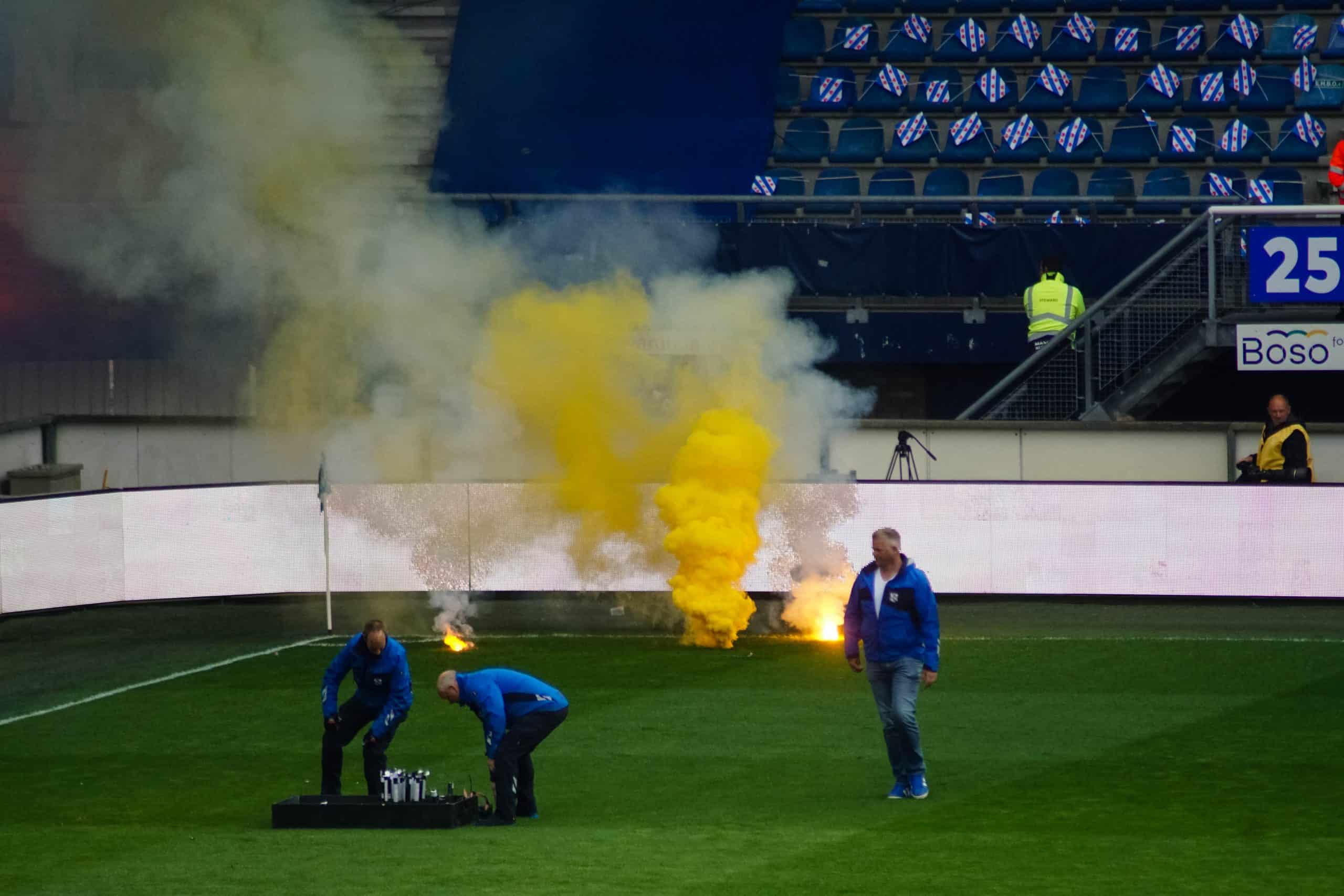 Voor de opkomst is het uitvak gevuld met geel-blauwe vlaggetjes. Hierna volgt een massale vuurwerkshow. Helaas hebben ze bij Heerenveen besloten om wat legale pyro op het veld te zetten, onder meer vlak voor het uitvak. Hierdoor is de gehele pyro-actie van Cambuur voor ons slecht zichtbaar. Wel vallen de fakkels en rookbommen die op het veld liggen op. Bij sc Heerenveen is een sfeeractie bereid in de vorm van een viking, met als tekst “over land en over zee, voor Heerenveen sc”. Van onder dit doek wordt een flinke lading vuurwerk afgestoken. Van beide kanten een heerlijk begin van de Friese derby dus!