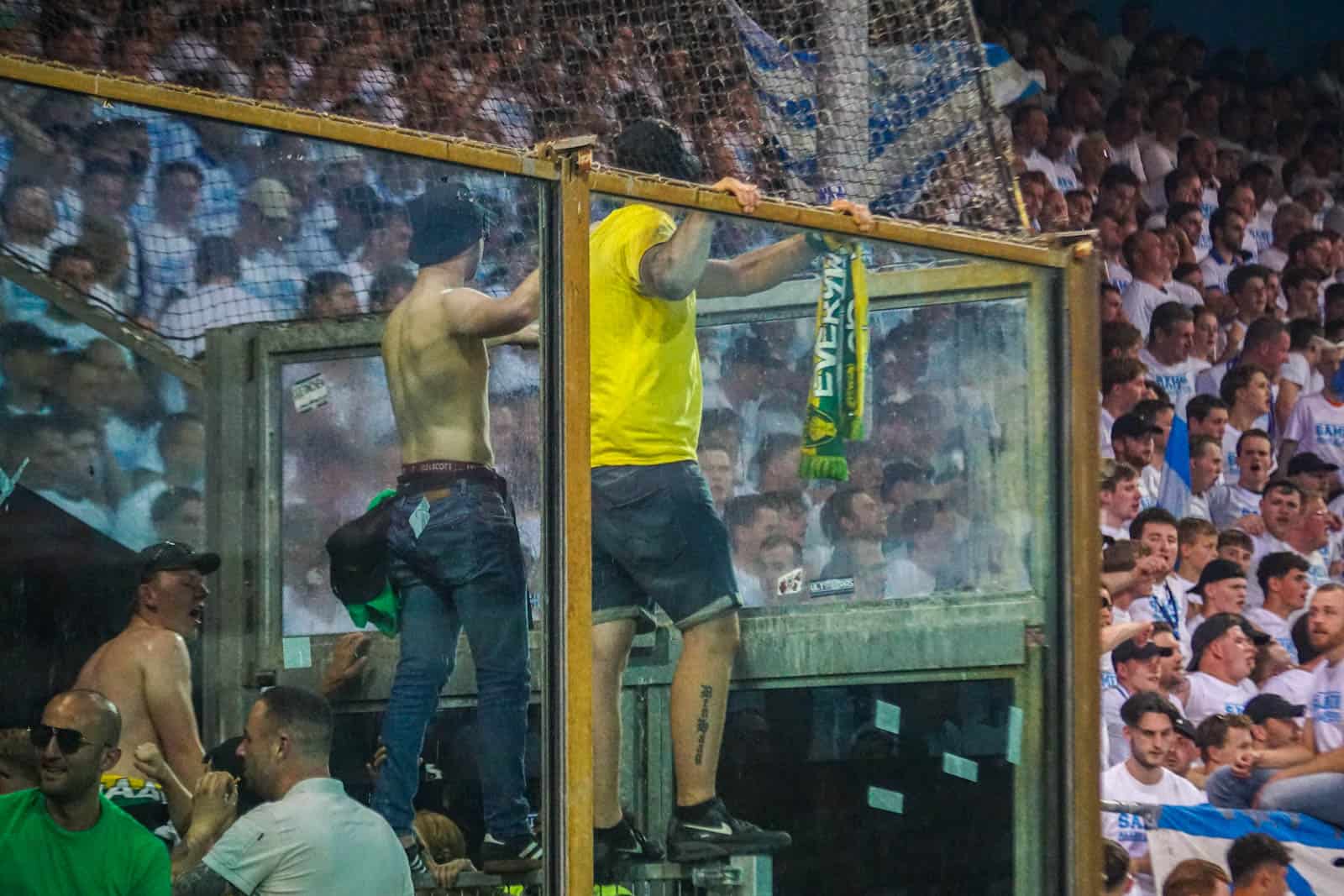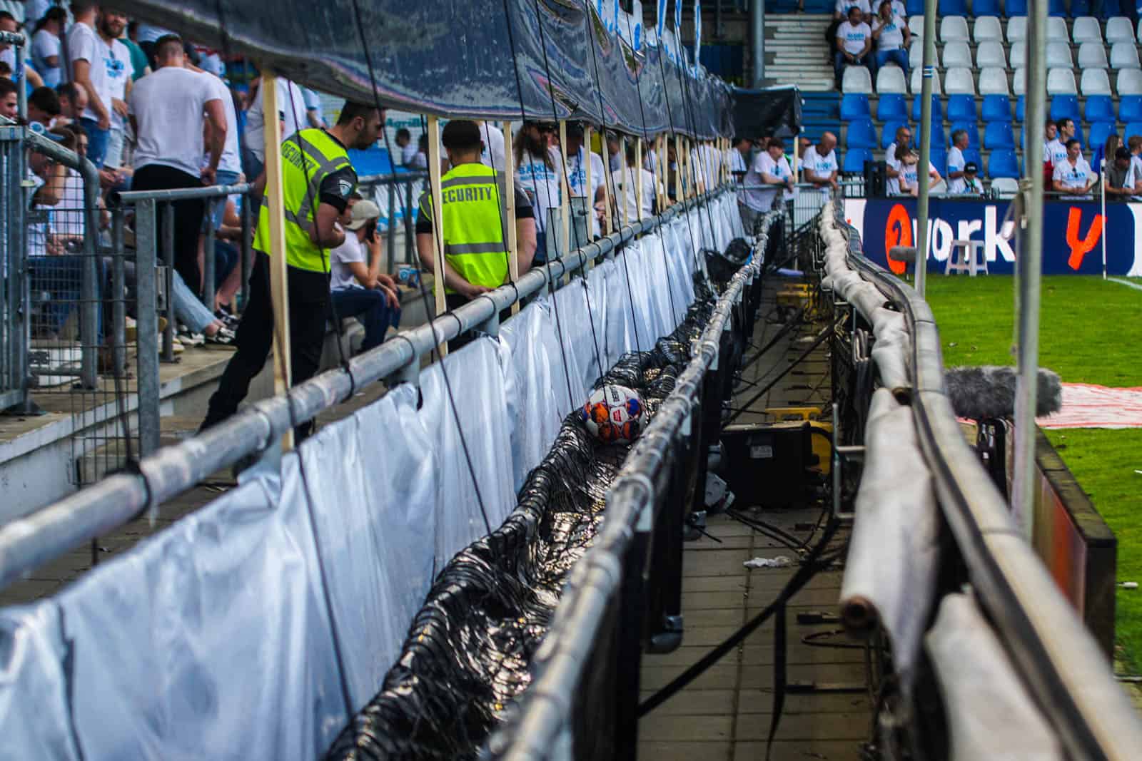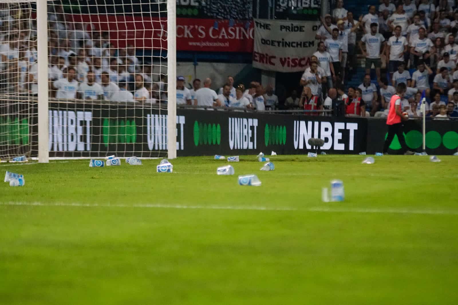 Dat beseft overigens niet iedereen, want terwijl de medici nog volop aan het werk zijn – duidelijk te zien aan de blauw-witte vlaggen – krijgt de scheidsrechter het groene licht om door te spelen. De supporters zijn woedend en binnen een paar seconden ligt het veld vol met gegooide bekers. Als het moet, staken ze de wedstrijd zelf wel! Vervolgens heffen zowel de thuissupporters als de uitsupporters een keihard en welgemeend KNVB MAFFIA aan. Dat het maar duidelijk moge zijn!