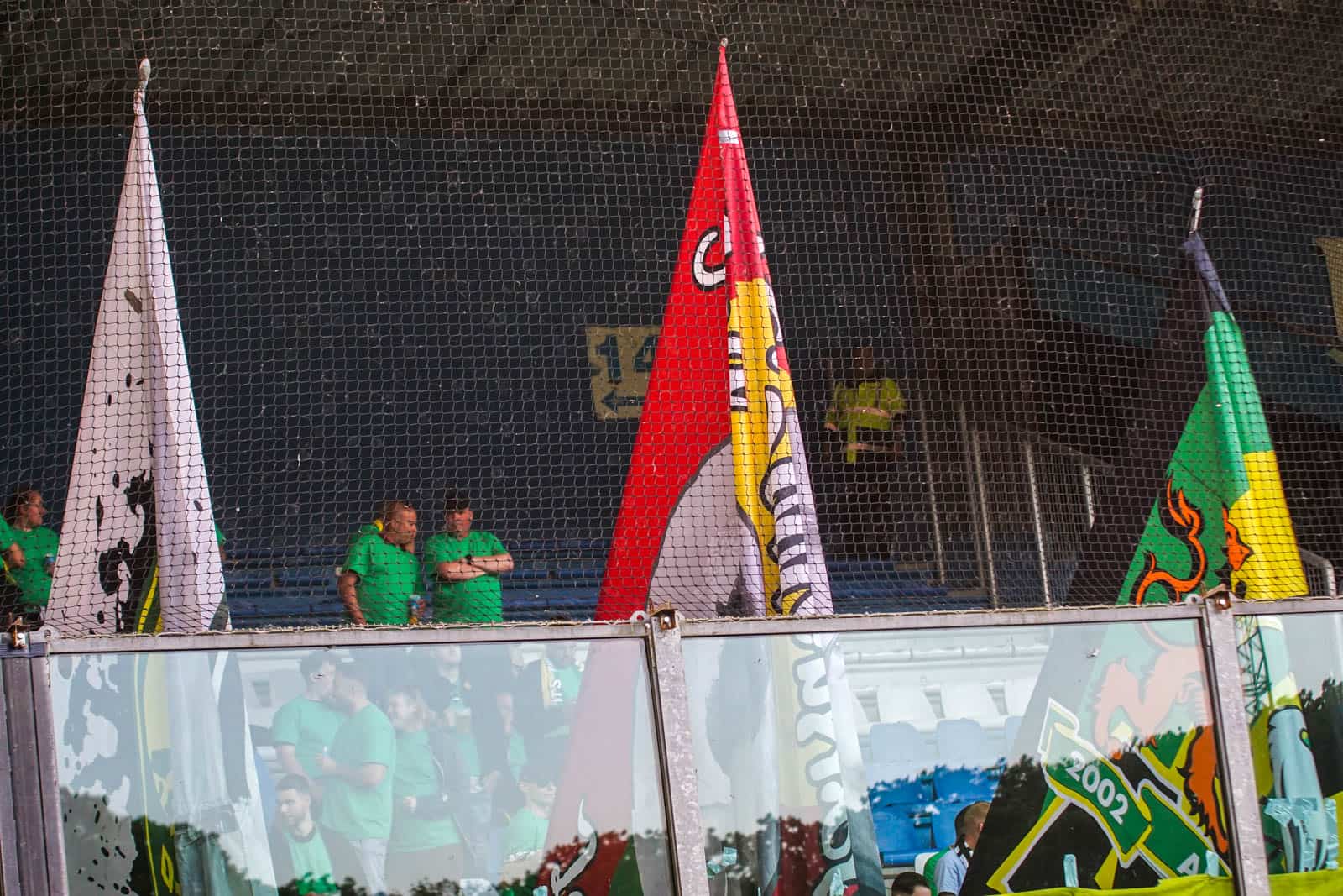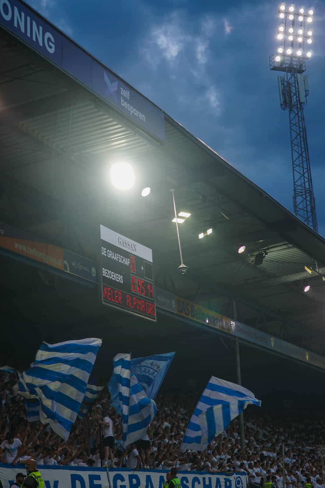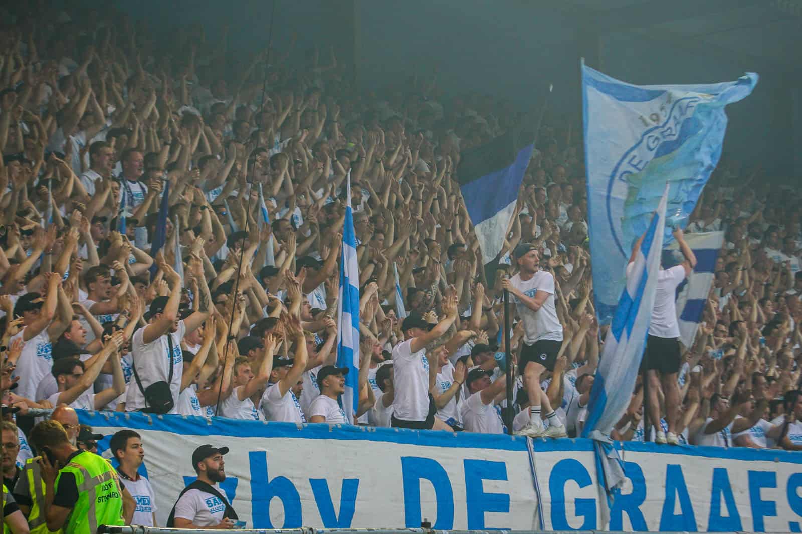 Het uitvak heeft tientallen geel-groene vlaggen meegenomen en gebruikt deze om het uitvak wat kleur te geven. Enkele van deze vlaggen hebben echter ook nog een mooie, dubbele waarde want ze worden gebruikt om het zicht van de camera’s te beperken. Zo worden er fakkels en rookpotten afgestoken. Het gastenvak verandert zo in een kleurrijke bron van rook, vlak naast de tifo van De Graafschap. Een heerlijke start van een klassiek avondje play-off voetbal.
