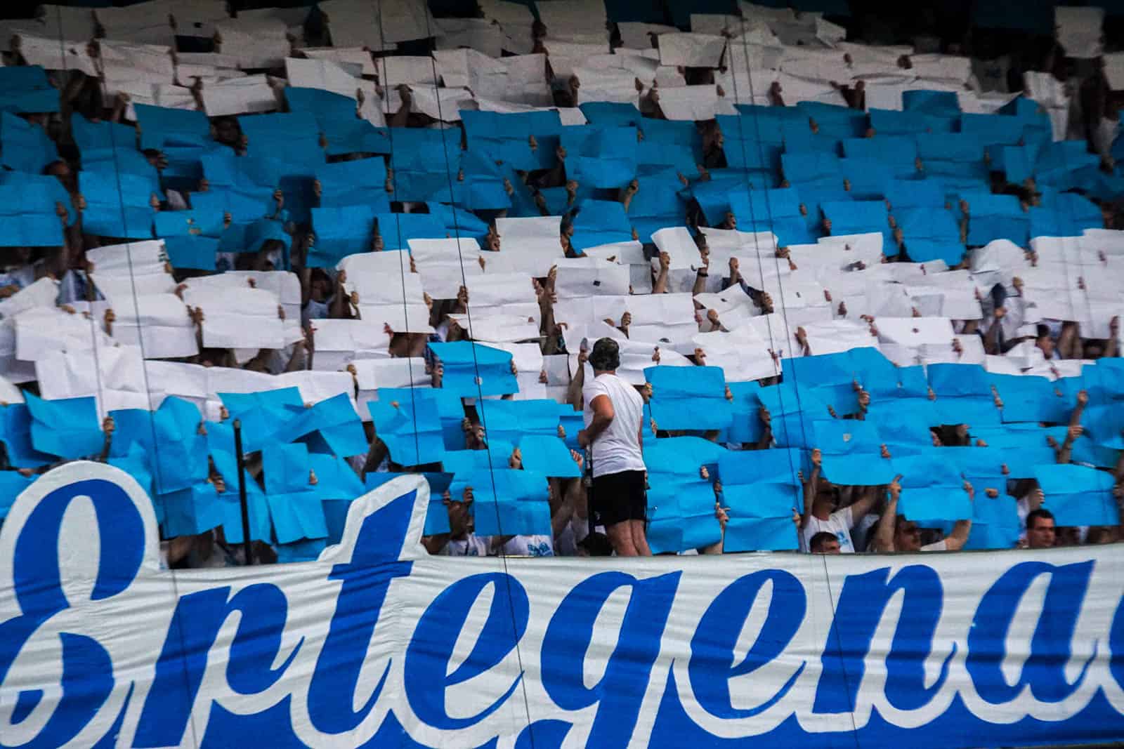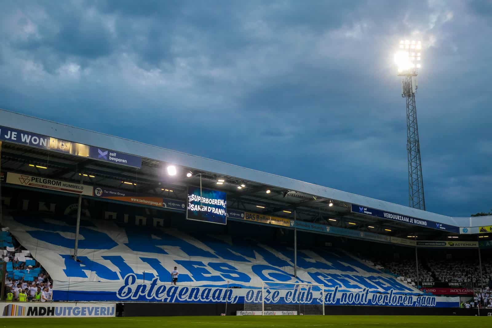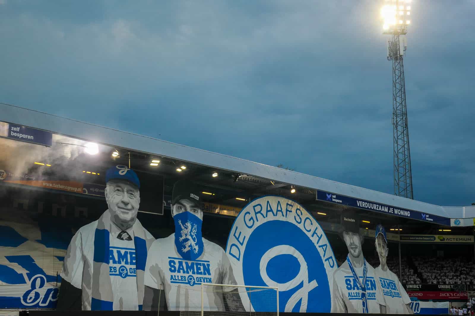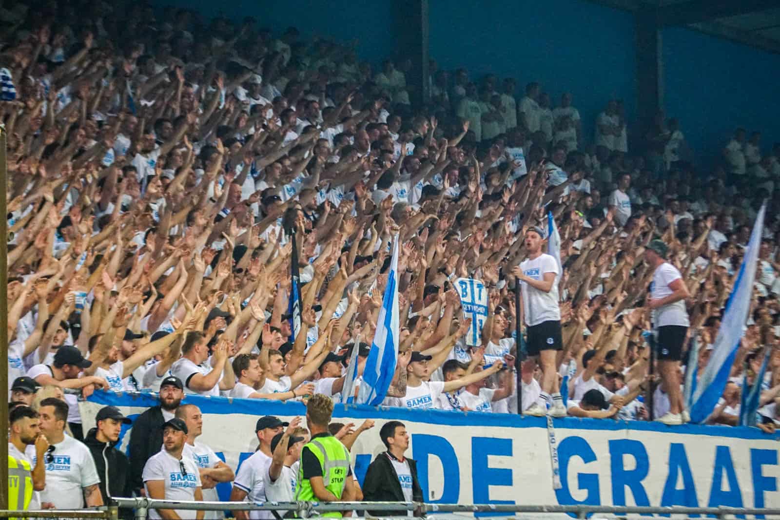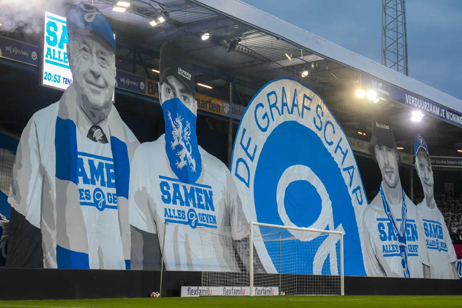 Voor de aftrap is het tijd voor De Graafschap om wederom te laten zien waarom ze tot de absolute top van Nederland horen op het gebied van tifo’s. Er is een 4-delige choreo voorbereid. Voor het vak wordt een doek uitgerold met “Ertegenaan, onze club zal nooit verloren gaan”. Hierna wordt het gehele vak gevuld met blauwe en witte velletjes. Deze worden overschaduwd door het doek dat over de tribune rolt met groot “Samen alles geven” – nu al dé Doetinchemse boodschap van deze play-offs. Het wordt afgemaakt door een cut-out die omhoog wordt getakeld van vier supporters en het logo van De Graafschap. De supporters, van jong tot oud, dragen uiteraard de witte shirts die ook 10.000 keer in de Vijverberg te zien zijn vanavond. Wat een actie weer!