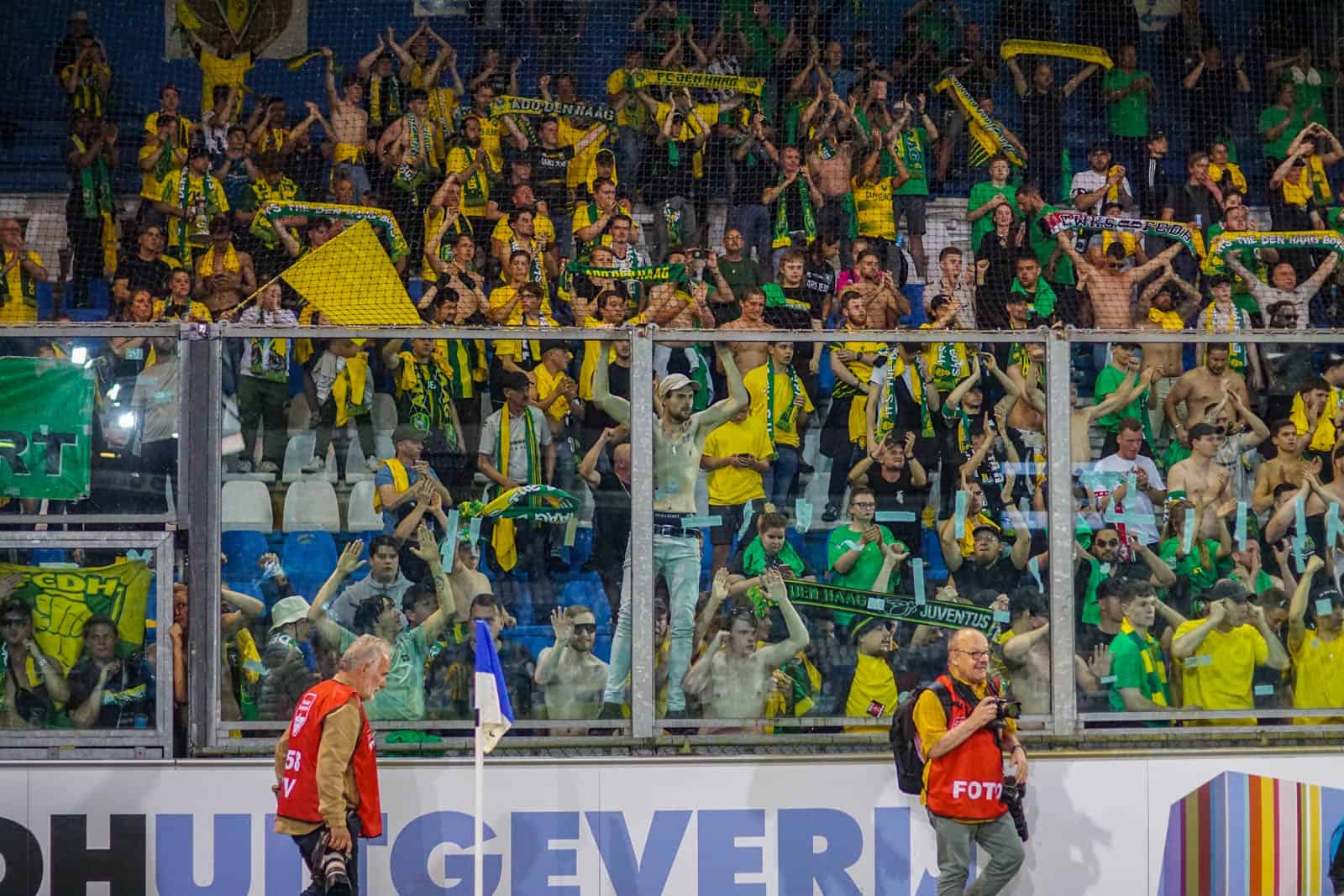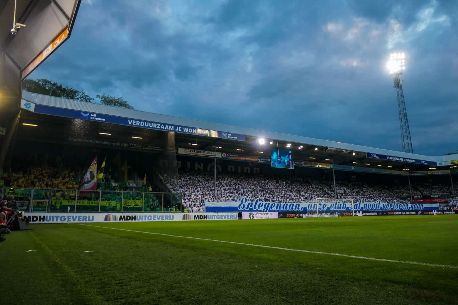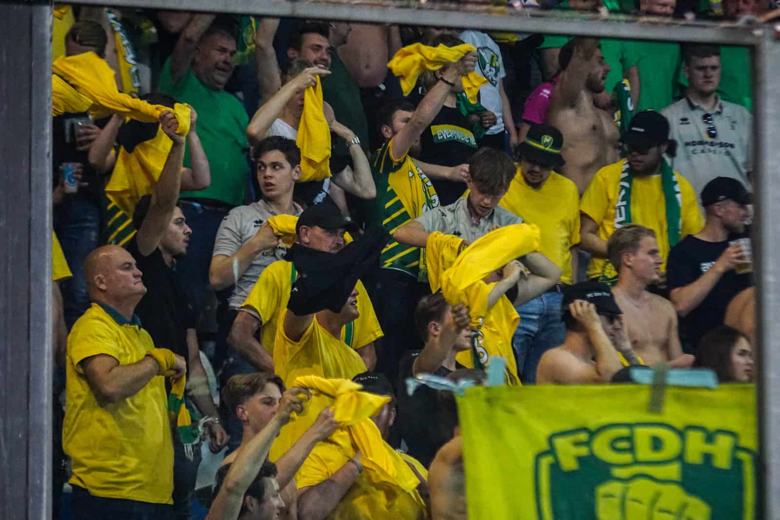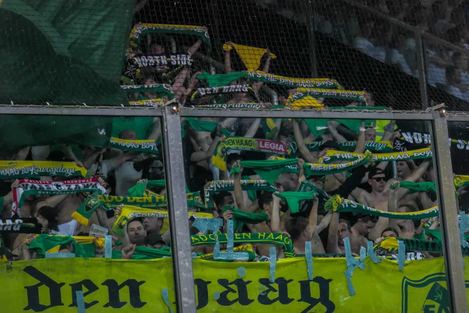 Toevallig heeft ook het uitvak gekozen voor een shirtjesactie. De Hagenezen zijn gegaan voor een half vak dat geel draagt en een half vak in het groen. Zo is eigenlijk het hele stadion, waar dankzij de zomerse temperaturen een jas niet benodigd is, gekleed in groen, geel of wit. Deze moeite geeft daardoor gelijk een speciaal gevoel aan deze wedstrijd – iets wat past bij de play-offs. Ook het uitvak is niet volledig uitverkocht, iets dat vanwege de bizar strenge restricties van ADO (buscombi, ID-controle en seizoenkaartrestrictie) ook niet heel gek is. Dat een uitverkocht stadion en uitvak niet per se benodigd zijn voor een geweldige sfeer, zullen we vanavond wel gaan merken…