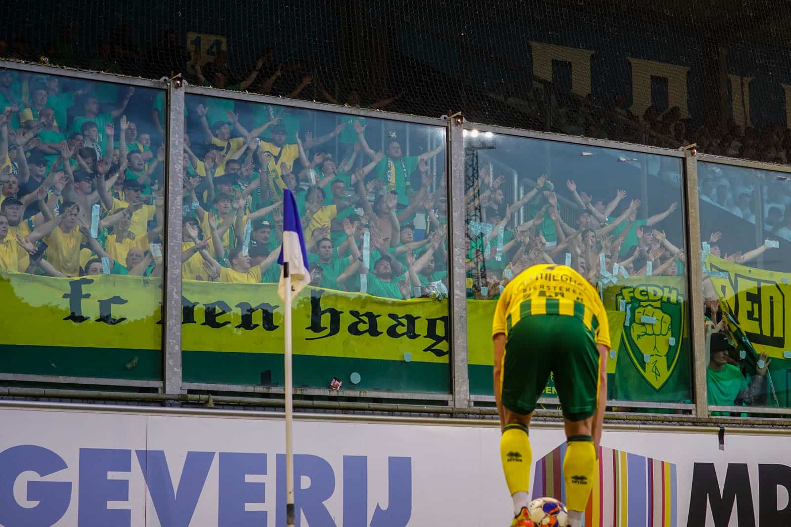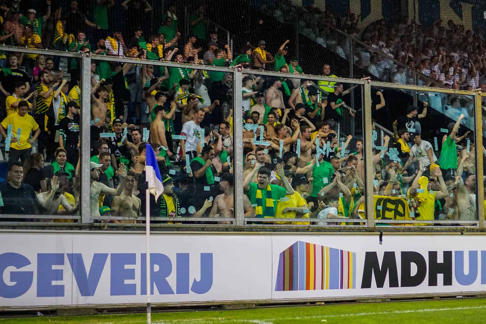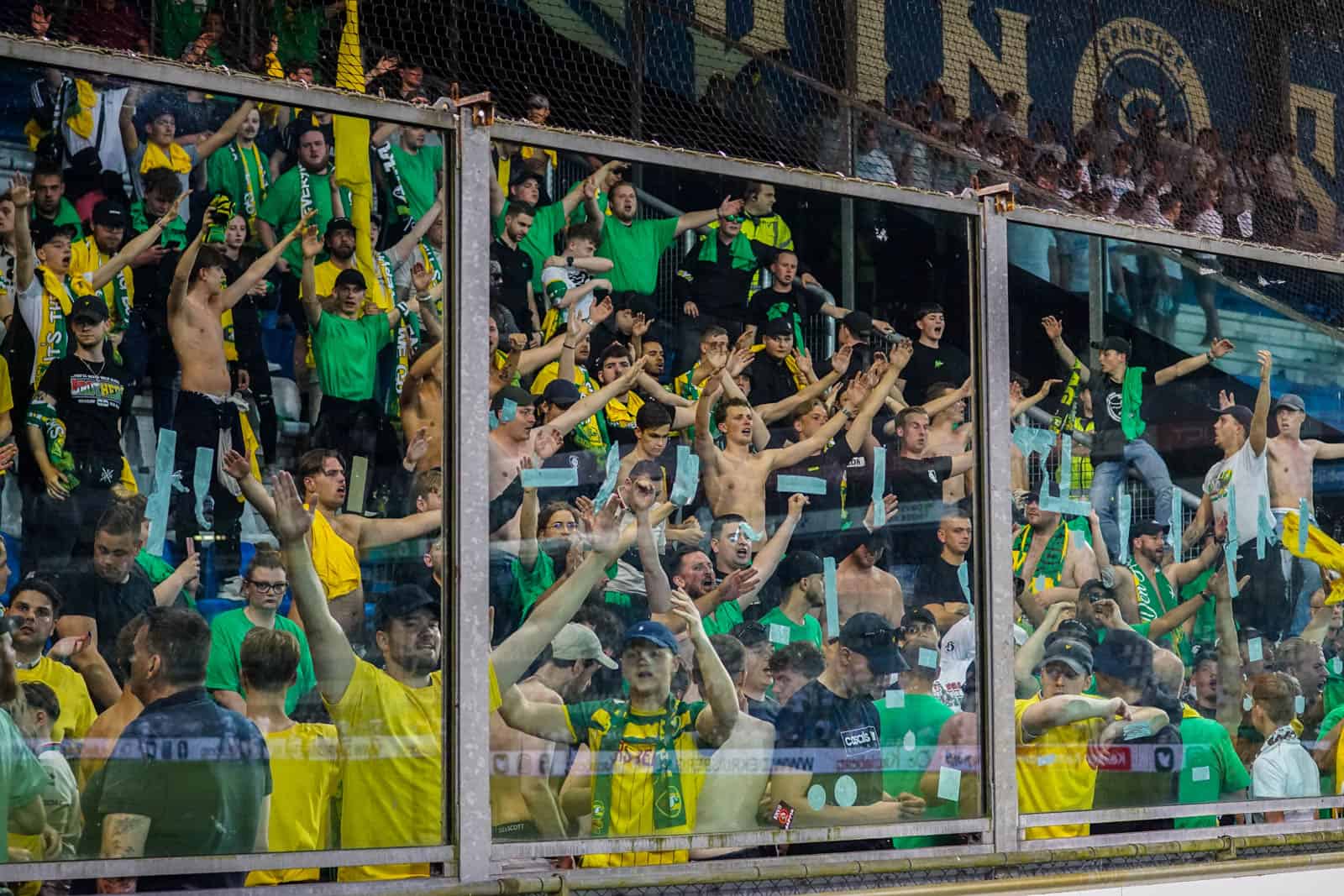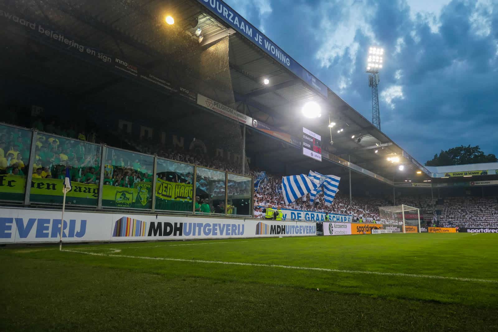 Toevallig heeft ook het uitvak gekozen voor een shirtjesactie. De Hagenezen zijn gegaan voor een half vak dat geel draagt en een half vak in het groen. Zo is eigenlijk het hele stadion, waar dankzij de zomerse temperaturen een jas niet benodigd is, gekleed in groen, geel of wit. Deze moeite geeft daardoor gelijk een speciaal gevoel aan deze wedstrijd – iets wat past bij de play-offs. Ook het uitvak is niet volledig uitverkocht, iets dat vanwege de bizar strenge restricties van ADO (buscombi, ID-controle en seizoenkaartrestrictie) ook niet heel gek is. Dat een uitverkocht stadion en uitvak niet per se benodigd zijn voor een geweldige sfeer, zullen we vanavond wel gaan merken…