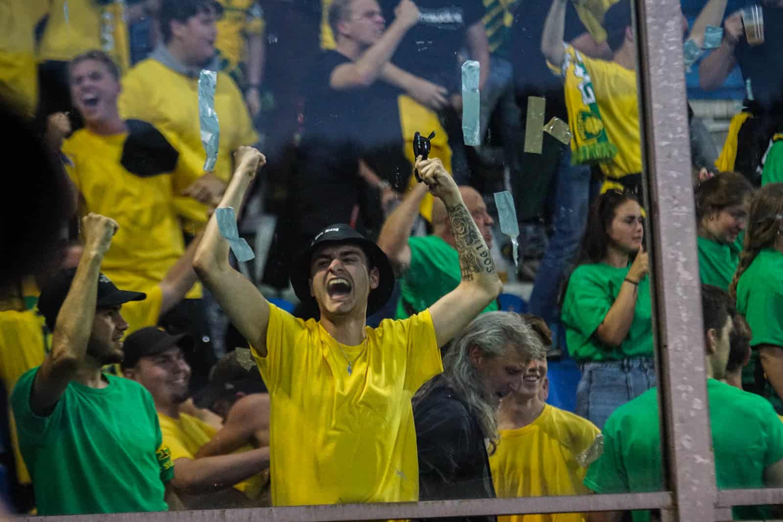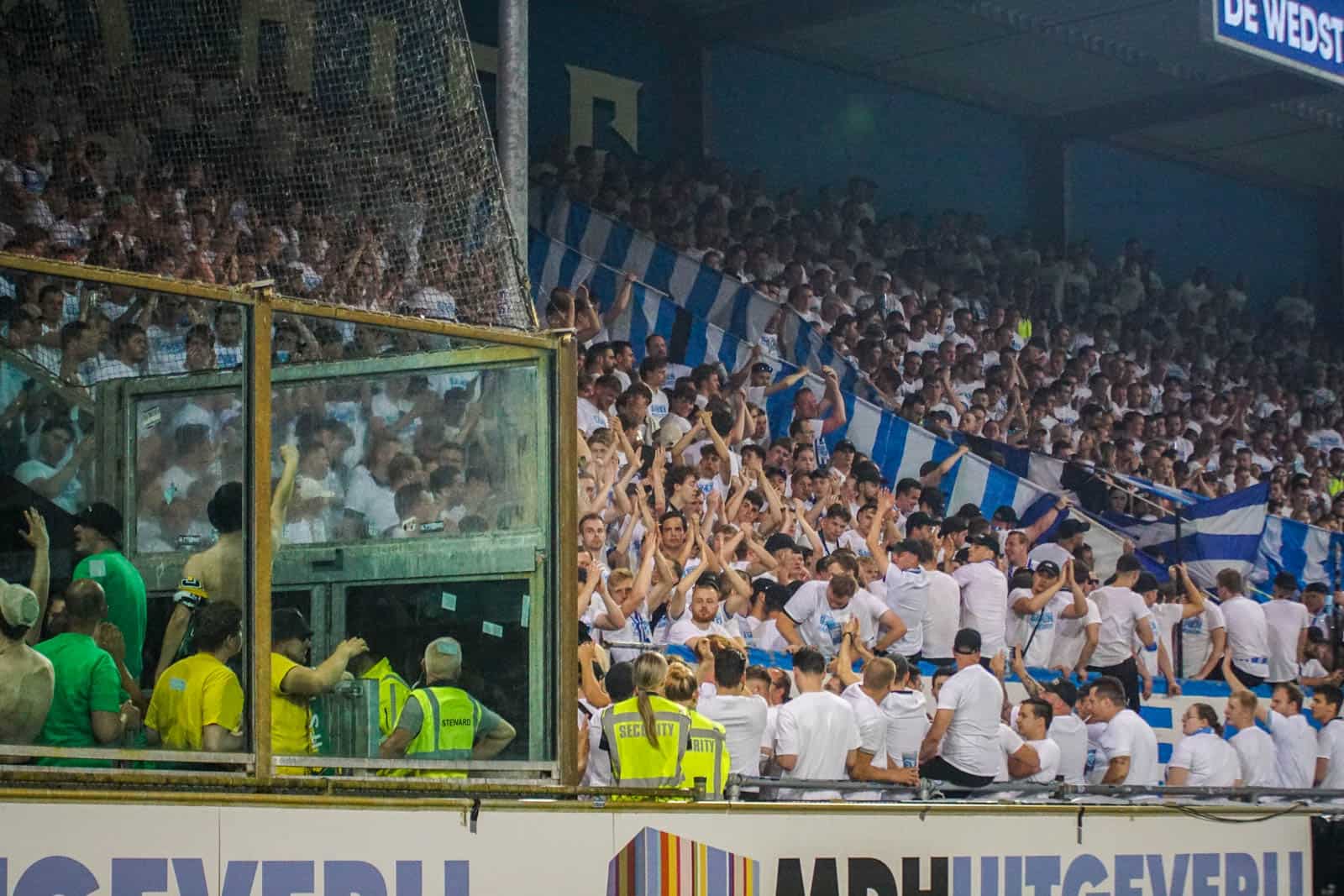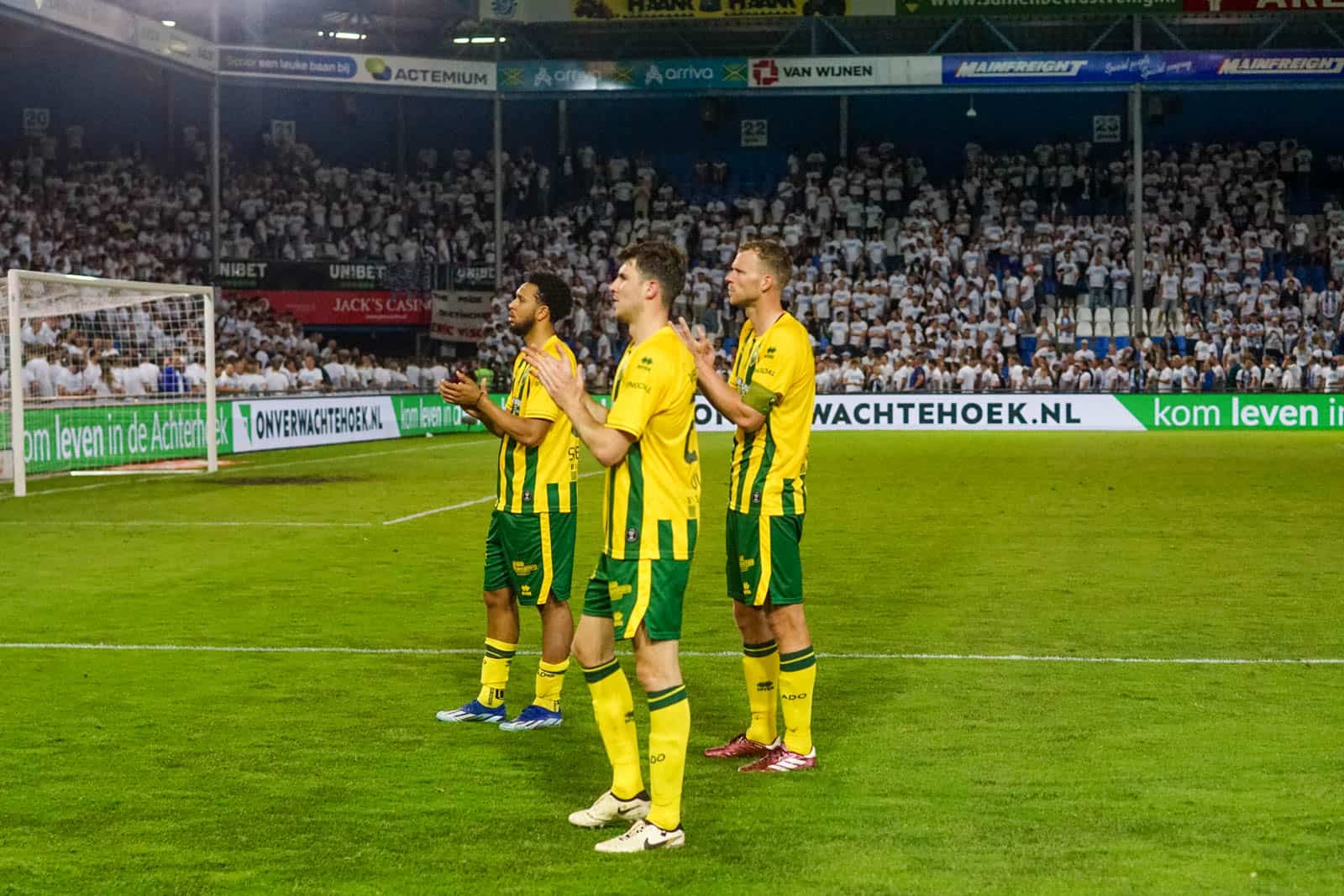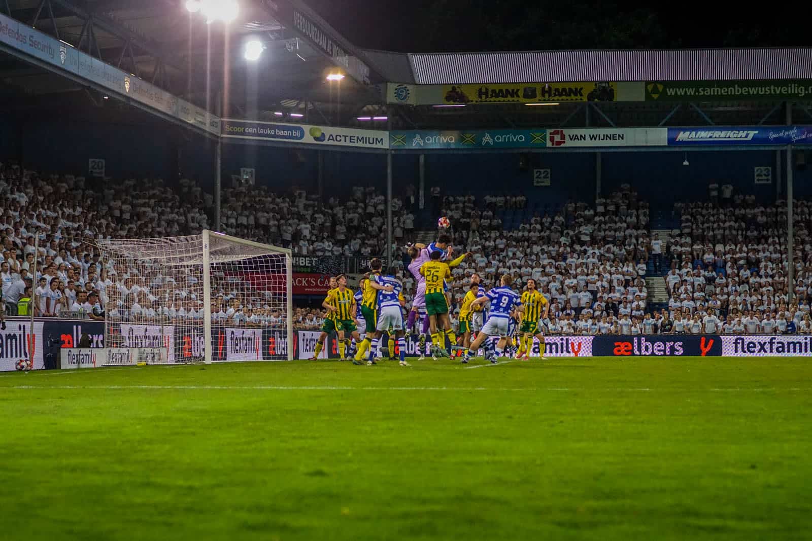 Toevallig heeft ook het uitvak gekozen voor een shirtjesactie. De Hagenezen zijn gegaan voor een half vak dat geel draagt en een half vak in het groen. Zo is eigenlijk het hele stadion, waar dankzij de zomerse temperaturen een jas niet benodigd is, gekleed in groen, geel of wit. Deze moeite geeft daardoor gelijk een speciaal gevoel aan deze wedstrijd – iets wat past bij de play-offs. Ook het uitvak is niet volledig uitverkocht, iets dat vanwege de bizar strenge restricties van ADO (buscombi, ID-controle en seizoenkaartrestrictie) ook niet heel gek is. Dat een uitverkocht stadion en uitvak niet per se benodigd zijn voor een geweldige sfeer, zullen we vanavond wel gaan merken…