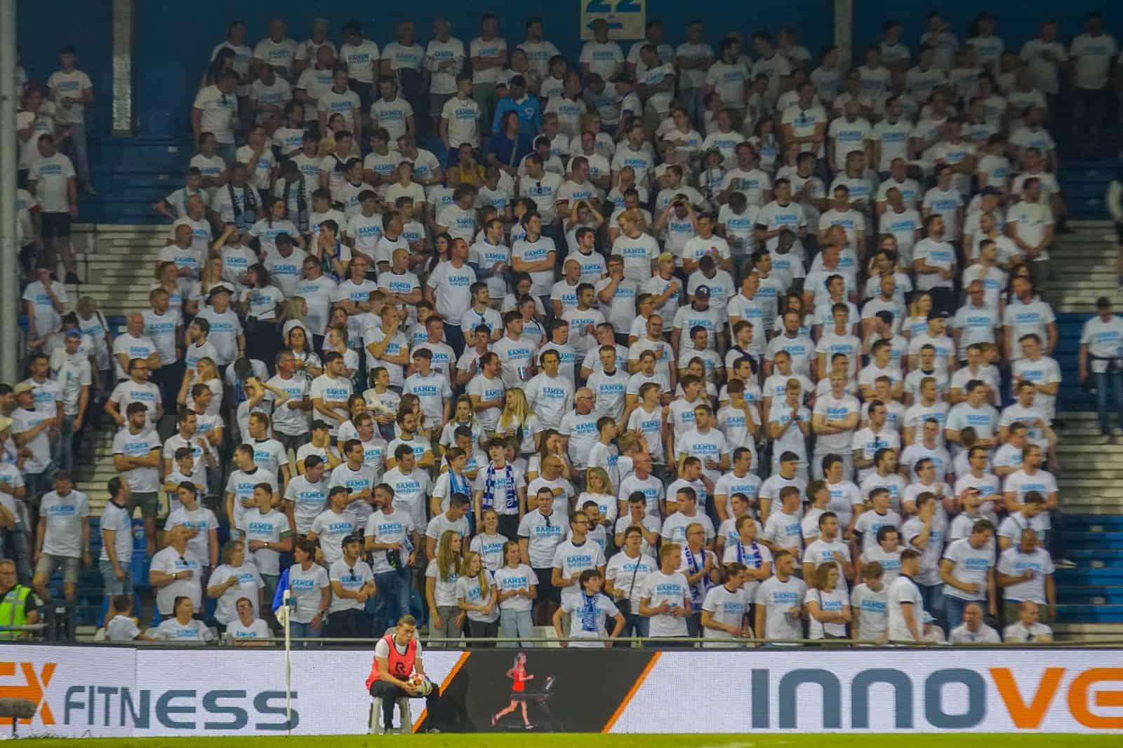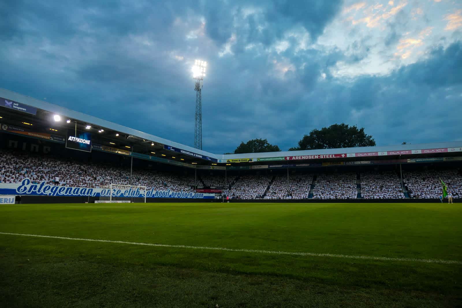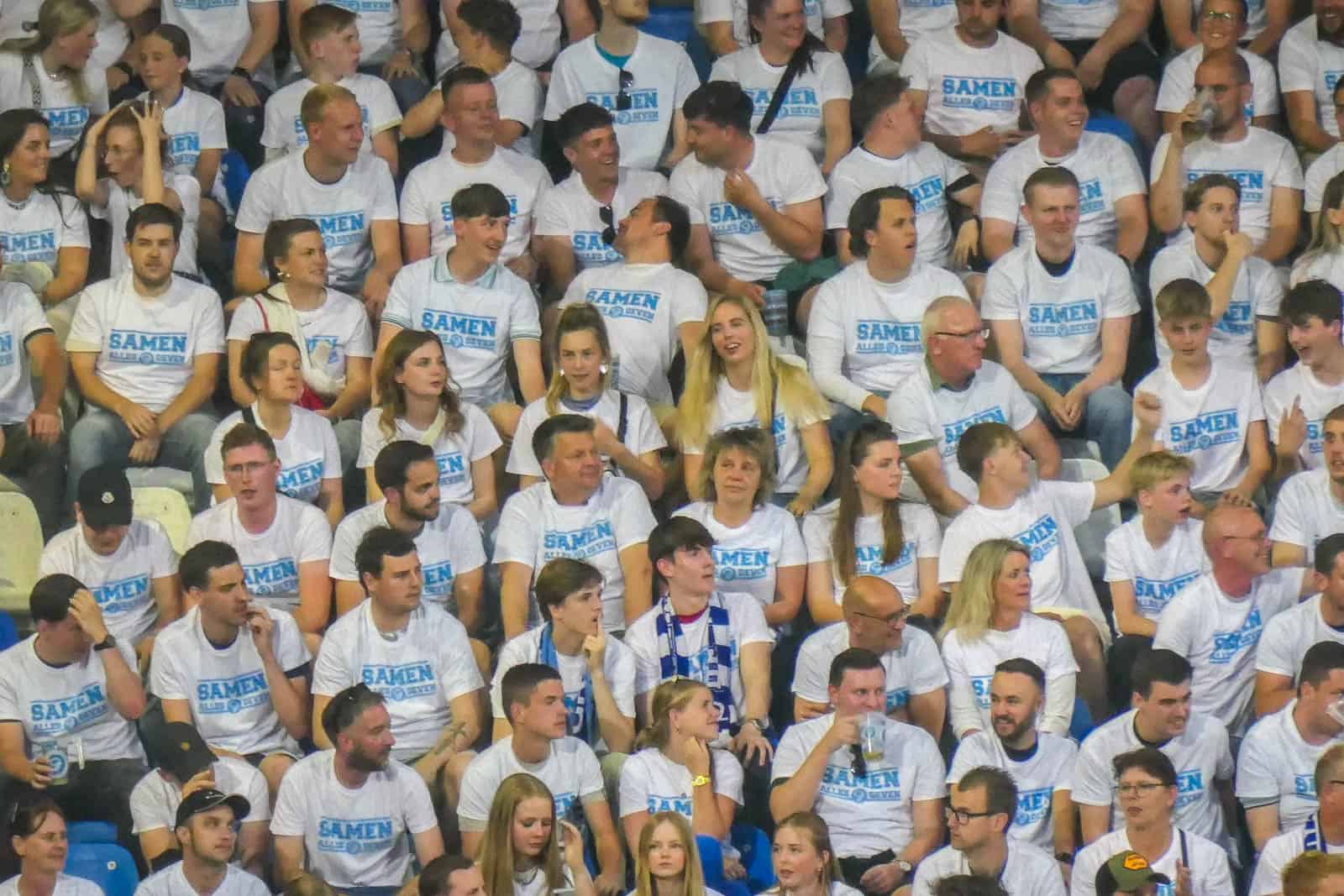 Dat beloofde sfeerartikel is er trouwens wel gekomen en gaat om een t-shirt. Een wit shirt met de passende tekst: samen alles geven! Na het gedoe van afgelopen maanden is het de perfecte boodschap met het oog op de play-offs die zullen volgen. Zowel de spelers als de supporters zullen daarin alles moeten geven om kans te maken op resultaat. Dat gaat alleen samen slagen. Het resultaat is al voor de aftrap schitterend. De tribunes van de Vijverberg – inclusief de gehandicaptentribune – zijn volledig wit gekleurd. Enige nadeel hierbij zijn de lege plekken in de hoekvakken, maar dit mag de pret van de avond natuurlijk niet drukken.
