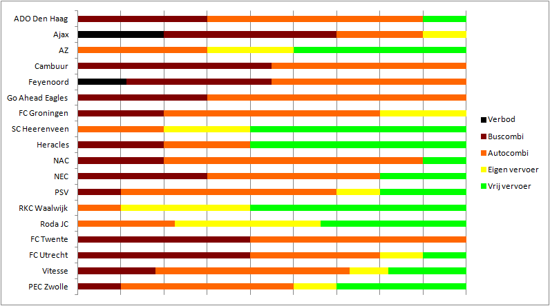 Vrij vervoer is met 21% vrij schaars en bovendien grotendeels voorbehouden aan een select aantal clubs. Vooral SC Heerenveen, Heracles en RKC mogen vaak zonder restricties naar uitwedstrijden. Ajax, SC Cambuur, Feyenoord, Go Ahead Eagles en FC Twente mochten dat dit seizoen nog nooit. Supporters die met openbaar vervoer reizen blijven een schrikbeeld voor ontvangende gemeenten, waardoor ook eigen vervoer met 10% redelijk vaak wordt opgelegd voor wedstrijden die eigenlijk vrij zouden kunnen zijn. Vooral in Utrecht en Den Haag wordt deze optie veel gebruikt, met als excuus dat de infrastructuur bij het uitvak niet geschikt zou zijn om lopend aan te komen.