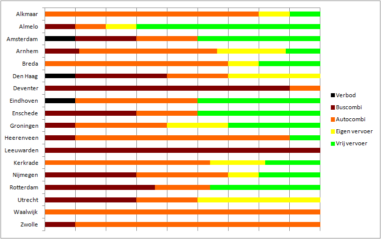 Het combibeleid hangt af van de bezoekende club, maar misschien nog wel meer van de ontvangende gemeente. Zo zijn er gemeenten die klakkeloos een combi opleggen, ook al ontbreekt ieder reëel argument om dat te doen. Leeuwarden legt als gezegd consequent een buscombi op, Deventer is soms nog ‘coulant’ met een enkele autocombi terwijl Waalwijk en Zwolle zodra ze het woord vooroverleg horen ook de uitkomst al opgeschreven hebben. Beter gaat het in gemeenten als Almelo, Eindhoven en Enschede, waar bijna de helft van de wedstrijden tot nu toe vrij vervoer was. Verrassend om te horen misschien voor de meerderheid van gemeenten die vast blijft houden aan repressie: het verliep zonder problemen!