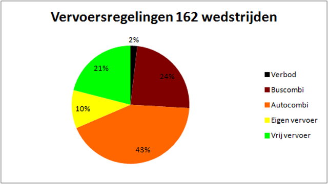 Van de 162 wedstrijden waren er 3 waar uitsupporters verboden waren. Van de overige 159 wedstrijden waren er 39 buscombi, 69 autocombi, 17 eigen vervoer en 34 vrij vervoer. Ruim een vijfde van de wedstrijden in de eredivisie was dus met vrij vervoer te bezoeken. Bij bijna een kwart van de wedstrijden werd een buscombi opgelegd. Meest gebruikt is de autocombi. Dit middel wordt in bijna de helft van de uitwedstrijden ingezet.