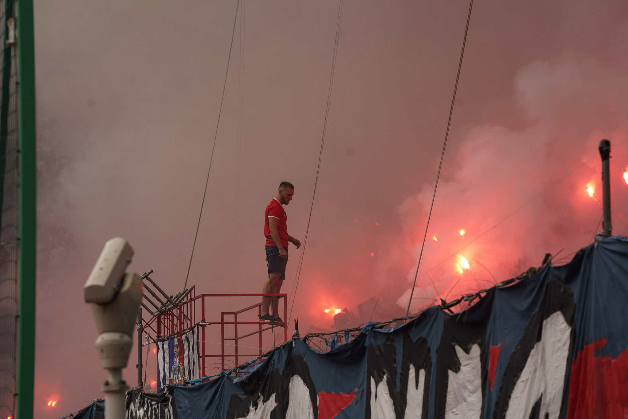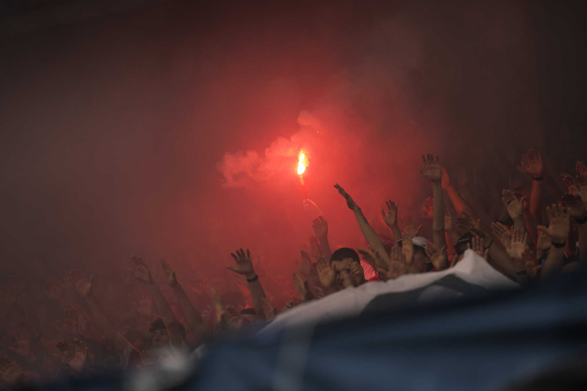 Het spandoek met de vechter blijft vervolgens dusdanig lang omhoog, dat langzaamaan wel duidelijk wordt wat er staat te gebeuren. Als de gehele tribune vervolgens luidkeels begint af te tellen, is het helemaal definitief. Als de 0 bereikt is, worden er over de hele tribune fakkels afgestoken. Een mooi begin van het voetbalseizoen voor de Wisla-supporters.
